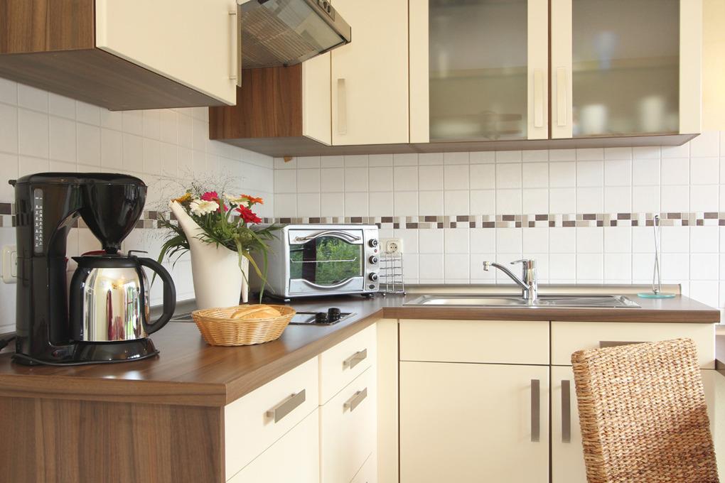 An die offene Küche grenzt ein Essbereich im amerikanischen Stil. Zur Ausstattung gehören unter anderem Geschirrspüler, Mikrowelle, Cerankochfeld und Backofen.