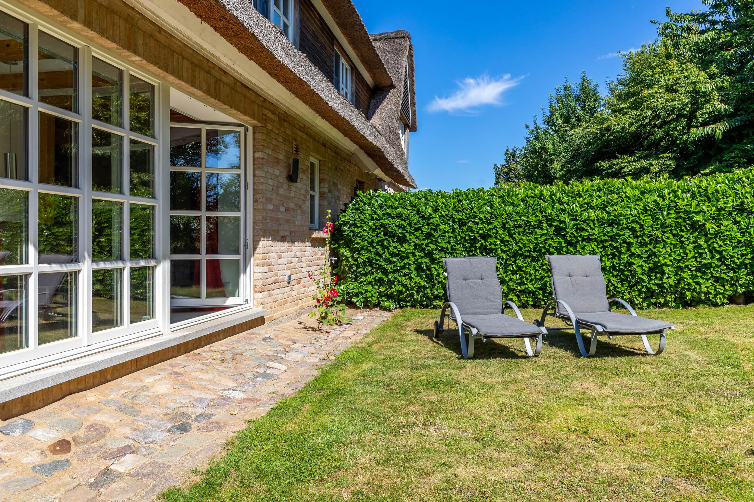 Vom Küchen-/ Essbereich aus gelangen Sie auf die schöne möblierte Süd-Terrasse mit eigenem gemütlichen Strandkorb und mit Naturstein. Genießen Sie das Grün um Sie herum oder entspannen Sie auf den Liegestühlen.