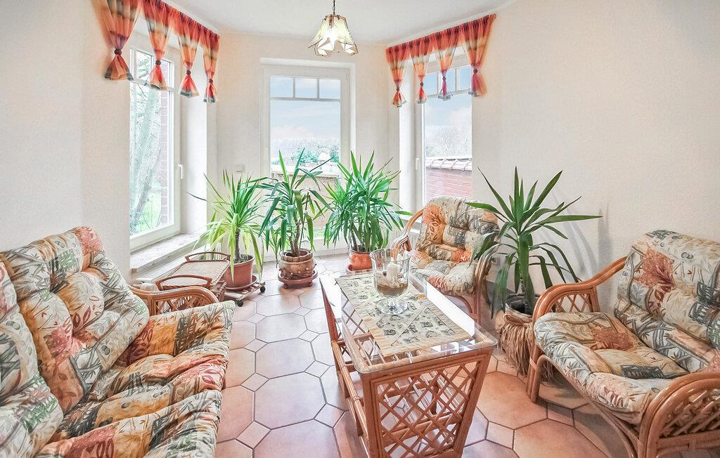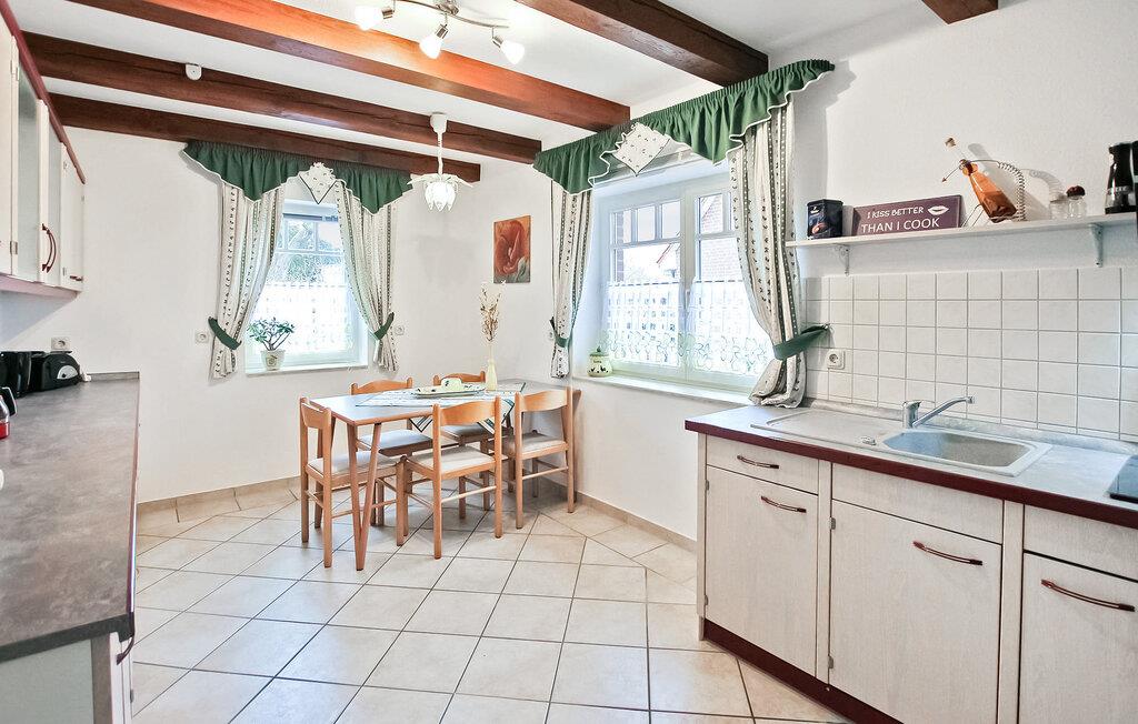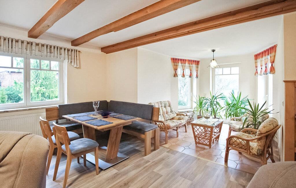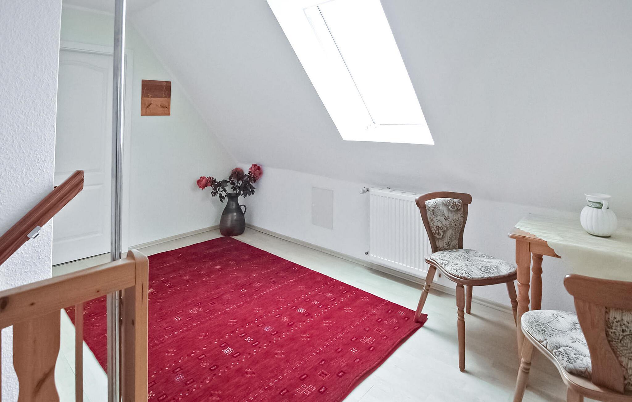 Det cirka 130 m² store, centralt opvarmede ikke-ryger hus strækker sig over to etager. I stueetagen er der en stor stue med karnap og udsigt over søen (polstret suite, lænestol, siddeområde i karnap, spisebord, fladskærms-tv), separat køkken (keramisk kogeplade, køleskab med fryser mulighed , opvaskemaskine, mikroovn med grill, spisebord, diverse små køkkenmaskiner ), et badeværelse (badekar, bruser, toilet, hårtørrer) og et gæstetoilet.