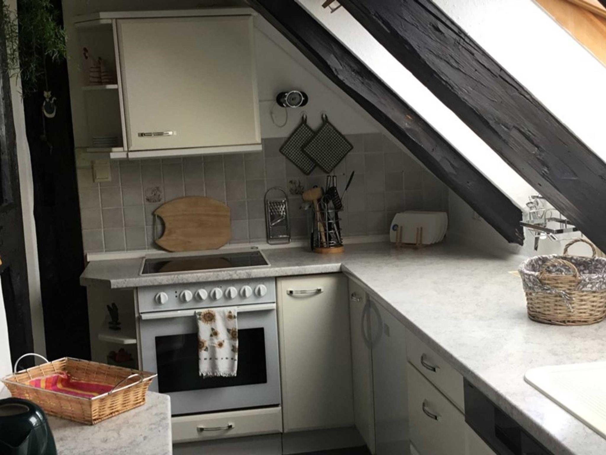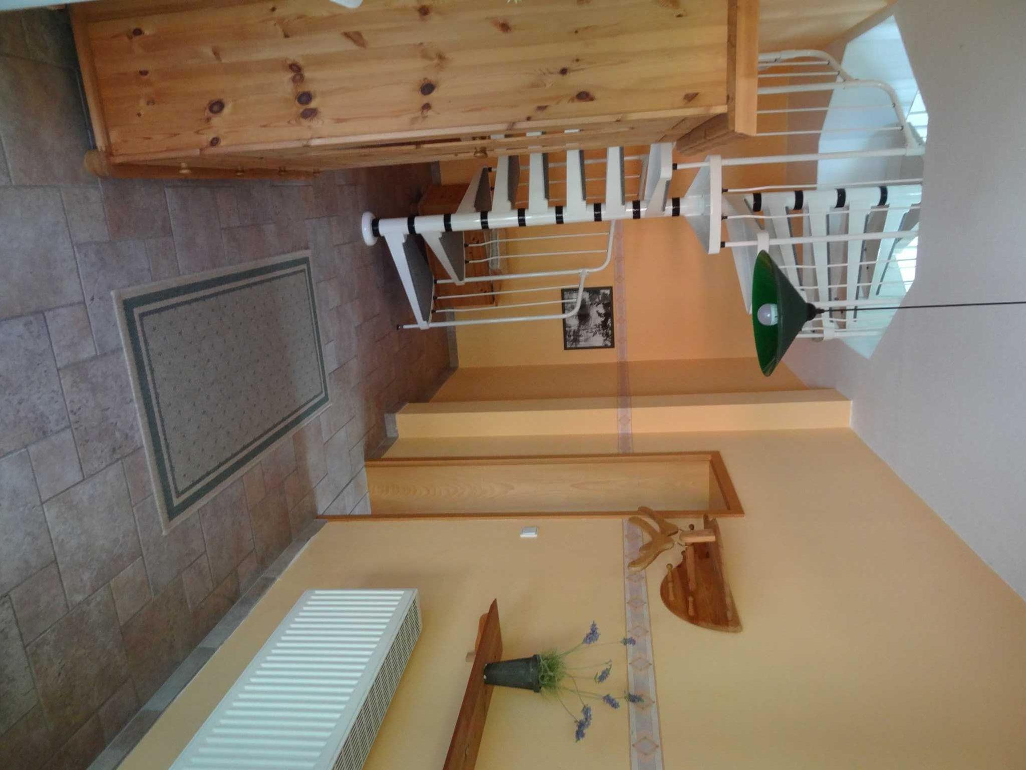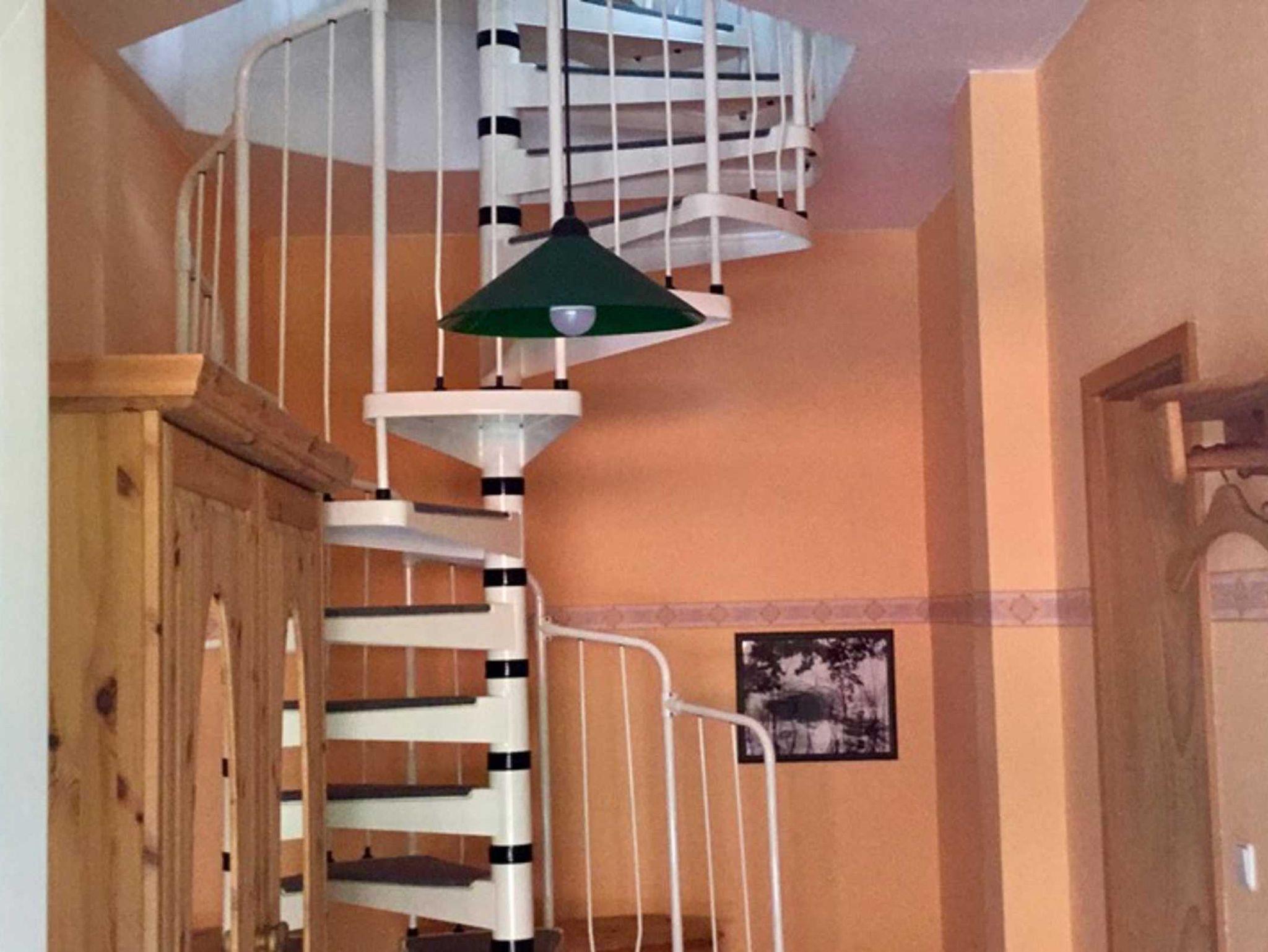 Die Ferienwohnung ist 70 qm groß und erstreckt sich über 2 Ebenen. Sie hat einen geräumigen Eingangsbereich mit anliegendem Schlafzimmer (Doppelbett) und Bad. Über die Wendeltreppe geht es ins Wohnzimmer mit offener Komplettküche (E-Herd mit Backofen, Geschirrspüler, Kühlschrank und Waschmaschine) , einer zusätzlichen Toilette und Waschbecken sowie dem zweiten Schlafraum (1 Bett, 1 Schlafcouch und zweiter Fernseher).