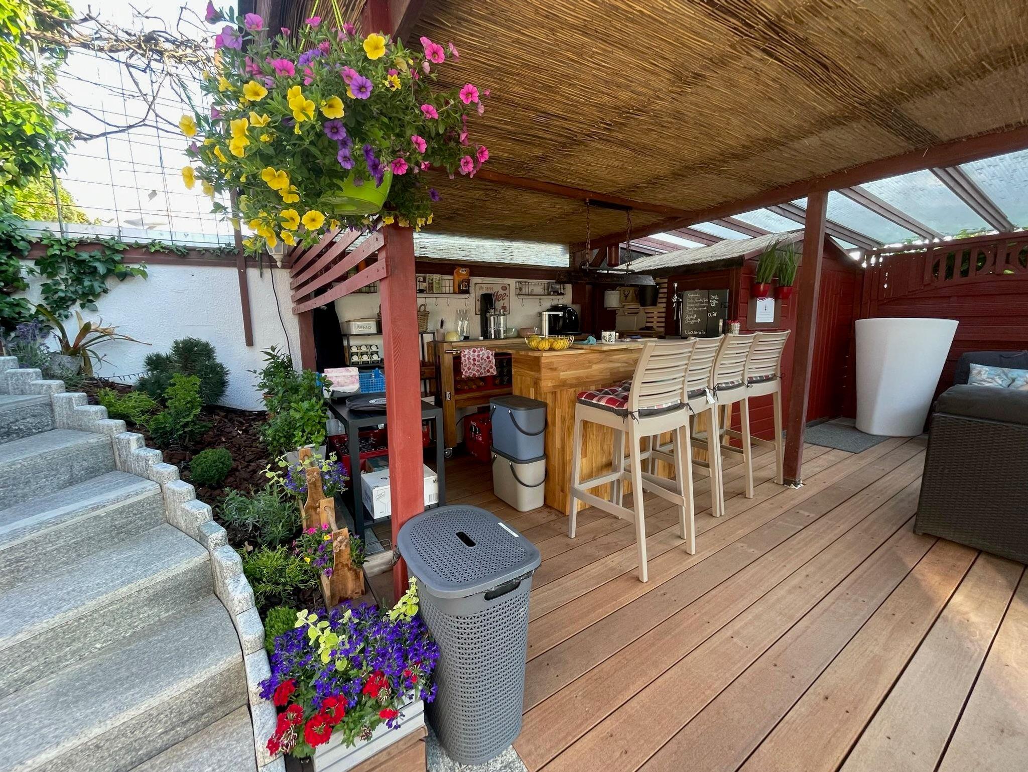 • Großer Gemeinschaftsgarten mit rustikaler Bar, Grillplatz & gemütlichen Sitzecken und Hängematte