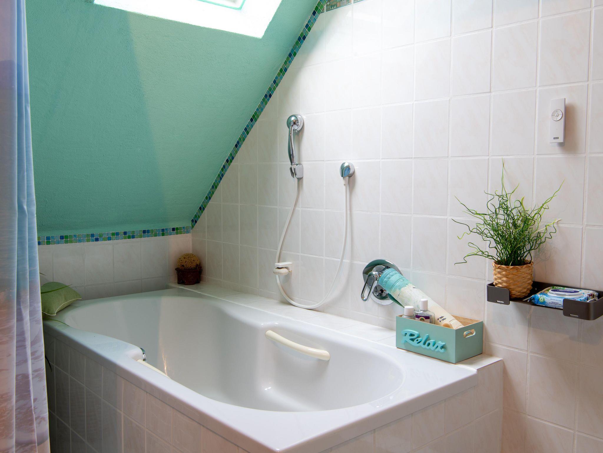 Das gemeinschaftlich genutzte Etagenbad bietet Dusche, Badewanne, WC & Pflegeprodukte.