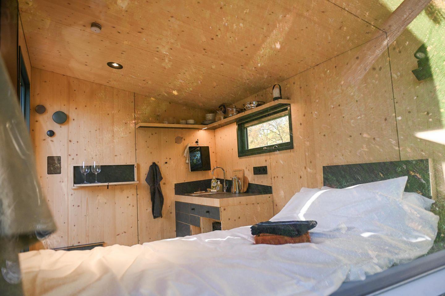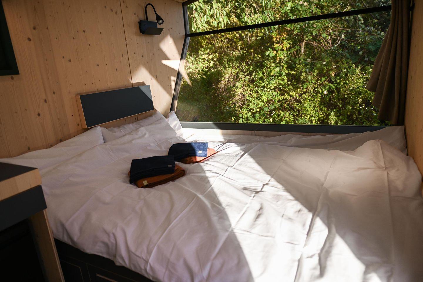 Auf rund fünf Quadratmetern findest du alles, was du für eine Auszeit brauchst. Tagsüber lädt die gemütliche Loungefläche zum Lesen, Schreiben, Träumen oder einfach zum Nichtstun ein. Abends verwandelst du sie in dein komfortables Bett (1,40 × 2,00 m) mit hochwertiger Bettwäsche, Decken und Kissen. Die Atmosphäre ist ruhig, warm und reduziert – perfekt, um abzuschalten und tief durchzuatmen. Das Panoramafenster lässt sich für die Nacht abdunkeln und schenkt dir dennoch das Gefühl, im Grünen zu schlafen.
