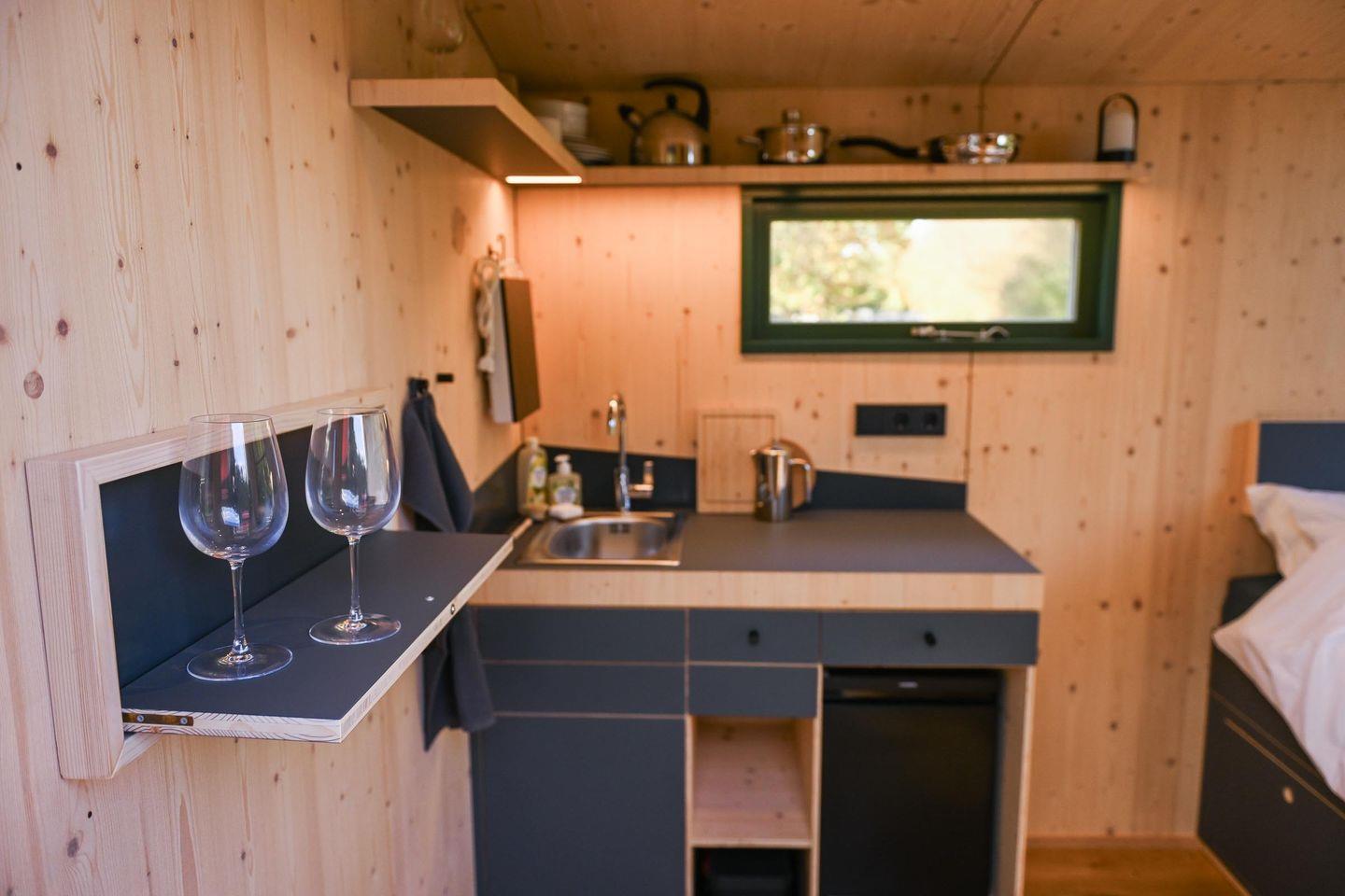 Die kleine Kochnische im Sleep Space ist kompakt und funktional gehalten. Sie eignet sich ideal für einfache Mahlzeiten und Getränke zwischendurch. Gleichzeitig lädt die Umgebung dazu ein, bewusst draußen zu sein oder das gastronomische Angebot der Stadt Wolfenbüttel zu entdecken. WLAN gibt es in der Unterkunft derzeit nicht – ein bewusster Vorteil für alle, die Digital Detox suchen und sich ganz auf den Moment, die Natur und sich selbst konzentrieren möchten.