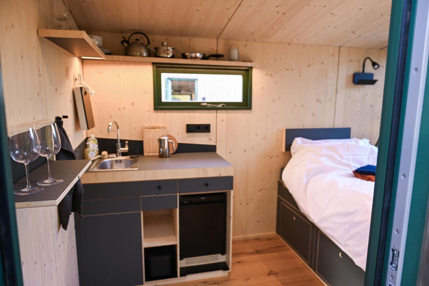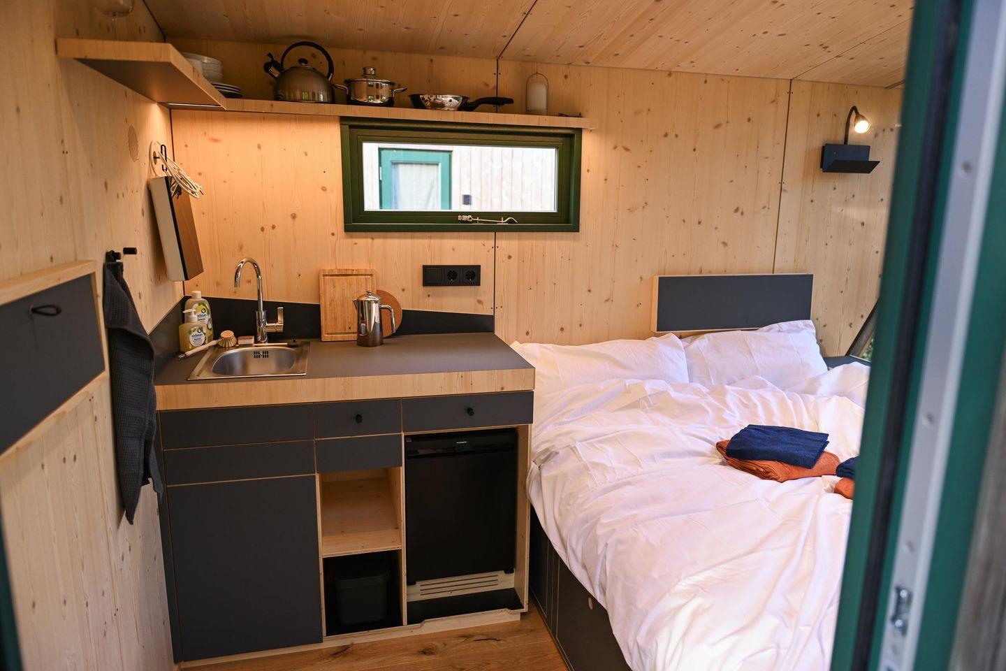 Dein Sleep Space steht naturnah auf einer grünen Fläche und eröffnet durch das große Panoramafenster einen beruhigenden Blick ins Umland. Vögel, Bäume und wechselndes Licht begleiten dich durch den Tag. Das Cabin stammt von Green Tiny Houses und wurde nachhaltig gebaut: auf einem Trailer, ohne Bodenversiegelung, gedämmt mit natürlichen Materialien und mit einem klaren, zeitlosen Design. Genau dieser bewusste Minimalismus macht den Aufenthalt so besonders.