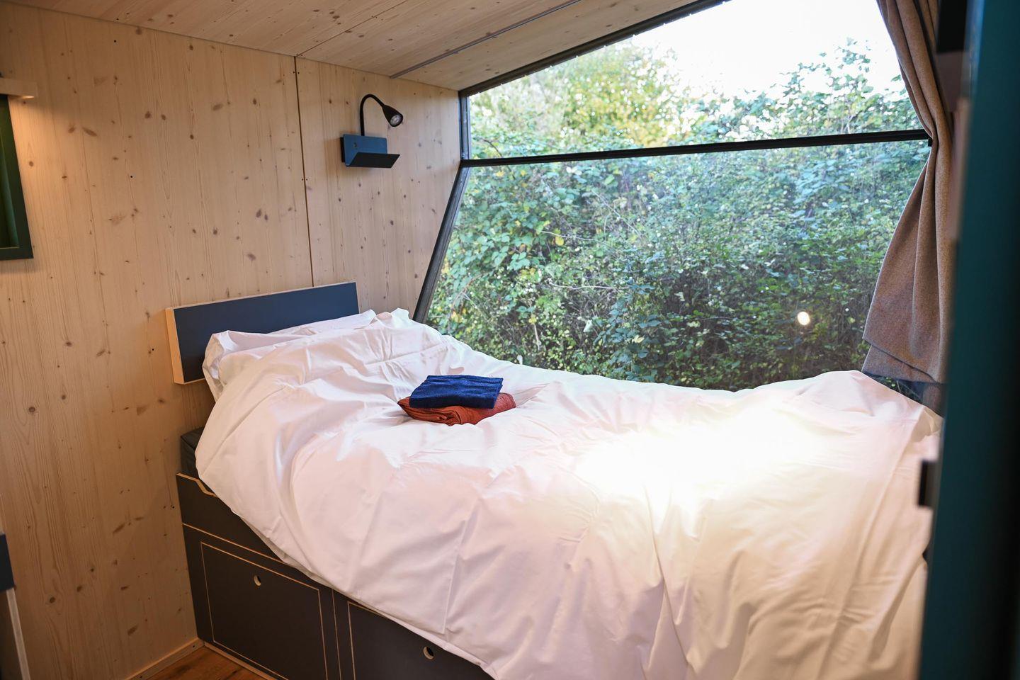 Auf rund fünf Quadratmetern findest du alles, was du für eine Auszeit brauchst. Tagsüber lädt die gemütliche Loungefläche zum Lesen, Schreiben, Träumen oder einfach zum Nichtstun ein. Abends verwandelst du sie in dein komfortables Bett (1,40 × 2,00 m) mit hochwertiger Bettwäsche, Decken und Kissen. Die Atmosphäre ist ruhig, warm und reduziert – perfekt, um abzuschalten und tief durchzuatmen. Das Panoramafenster lässt sich für die Nacht abdunkeln und schenkt dir dennoch das Gefühl, im Grünen zu schlafen.