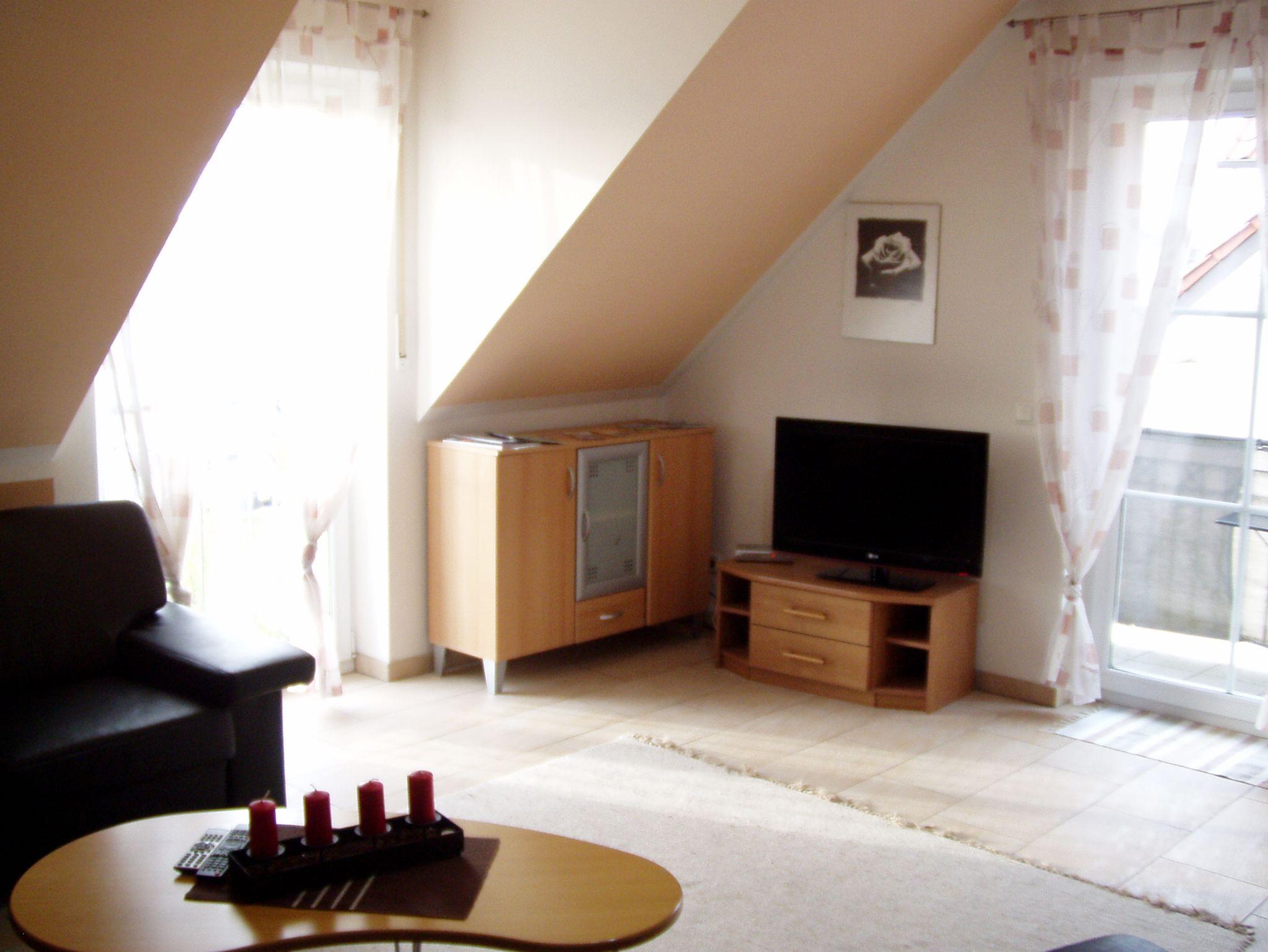 Das gemütliche Wohnzimmer mit Couch, Tisch, SAT-TV und Radio lädt zum Verweilen ein. Die komplett