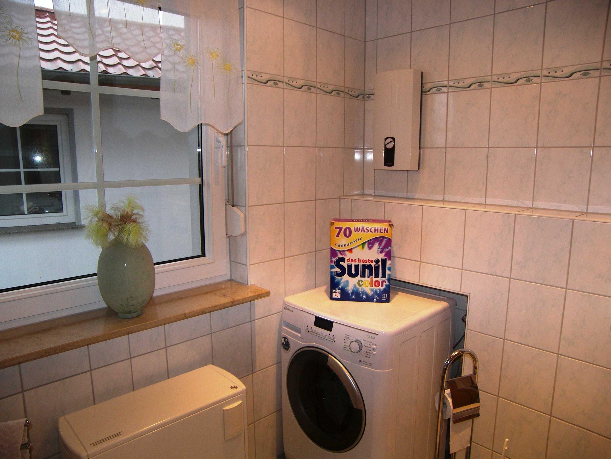 Eine Waschmaschine kann gegen Gebühr genutzt werden. (Pro Waschgang 5,00 €)