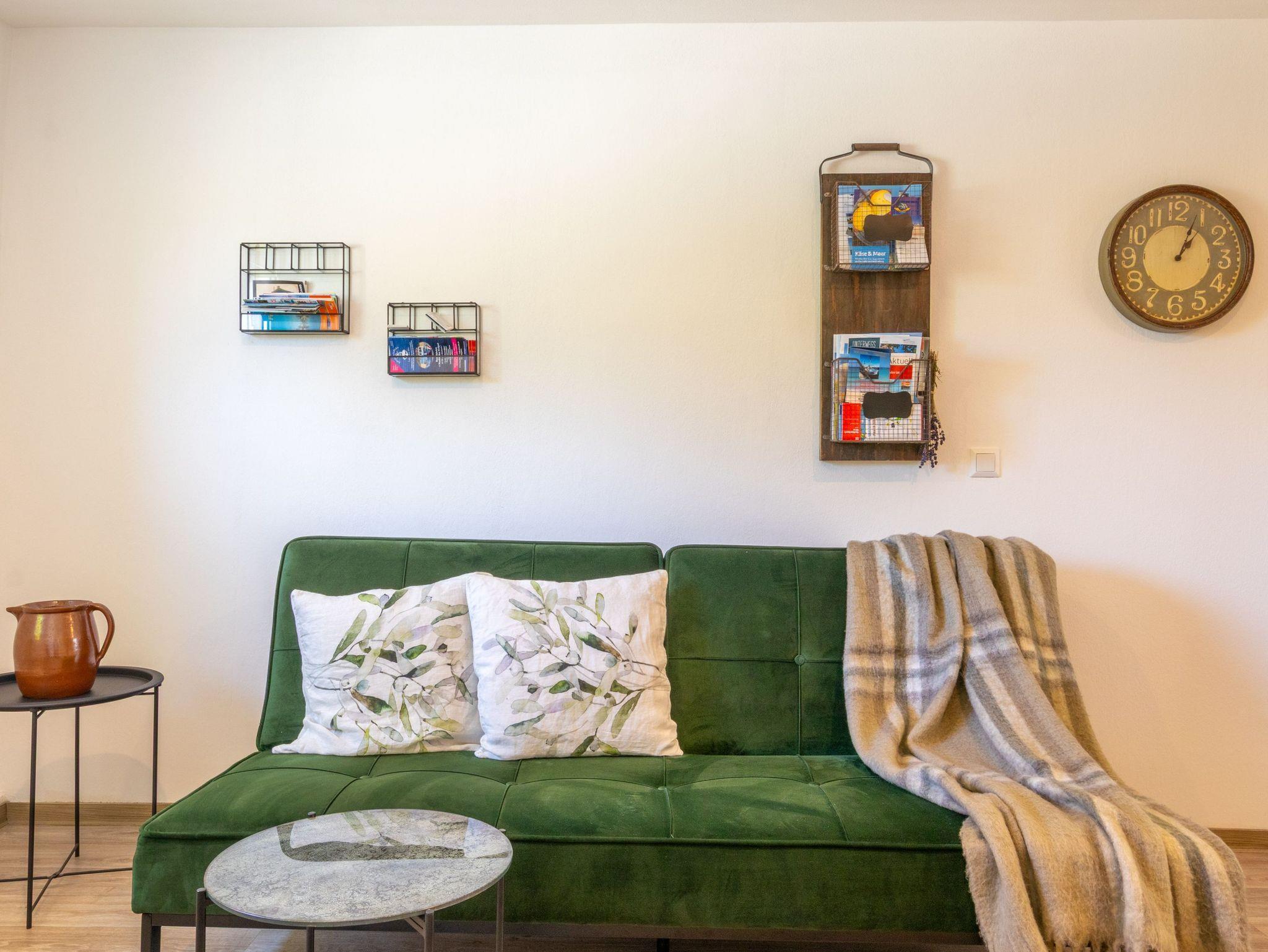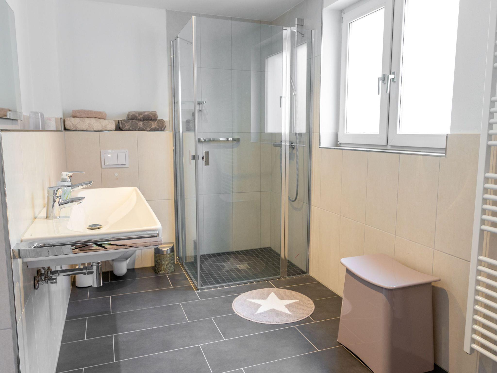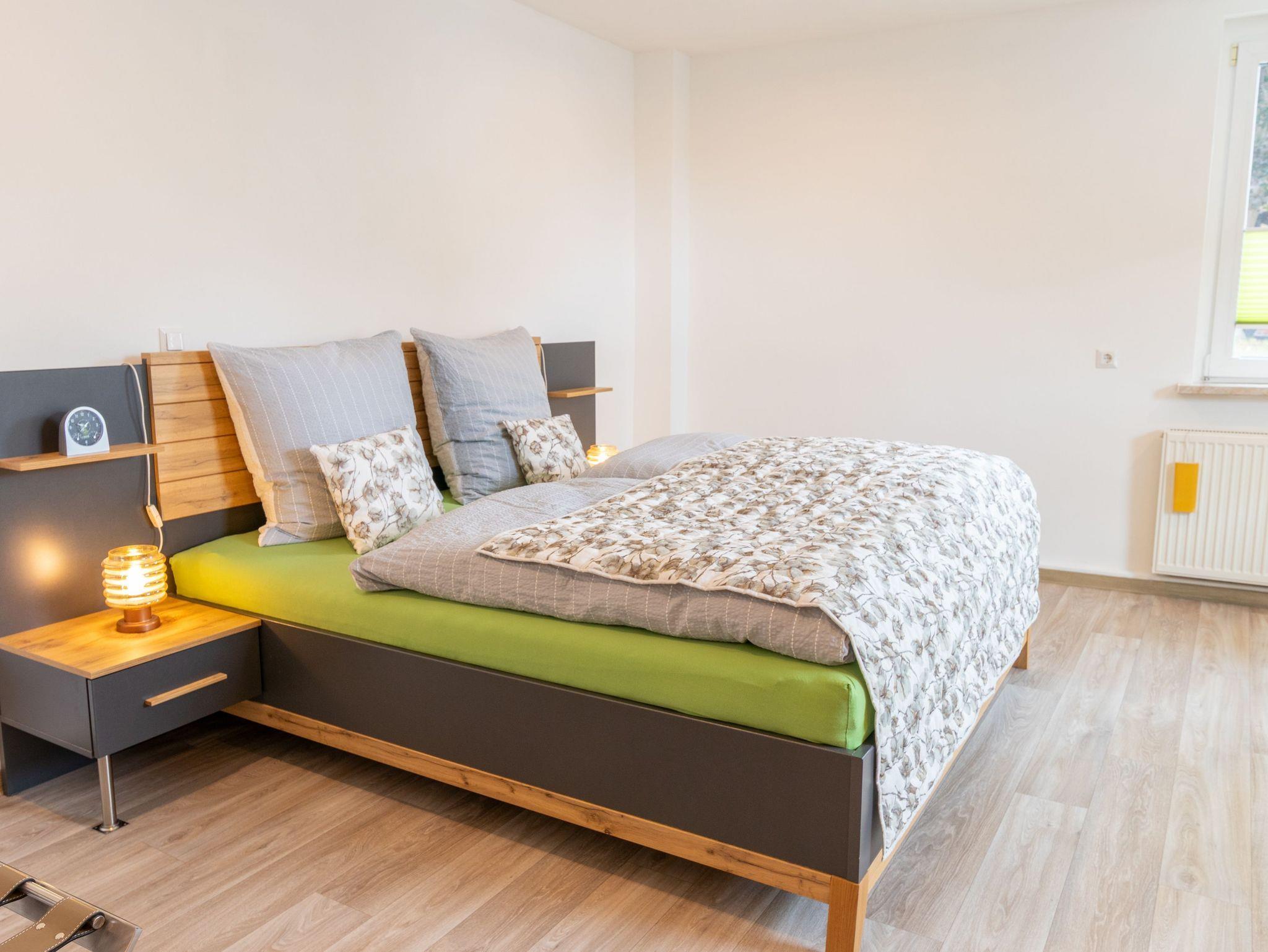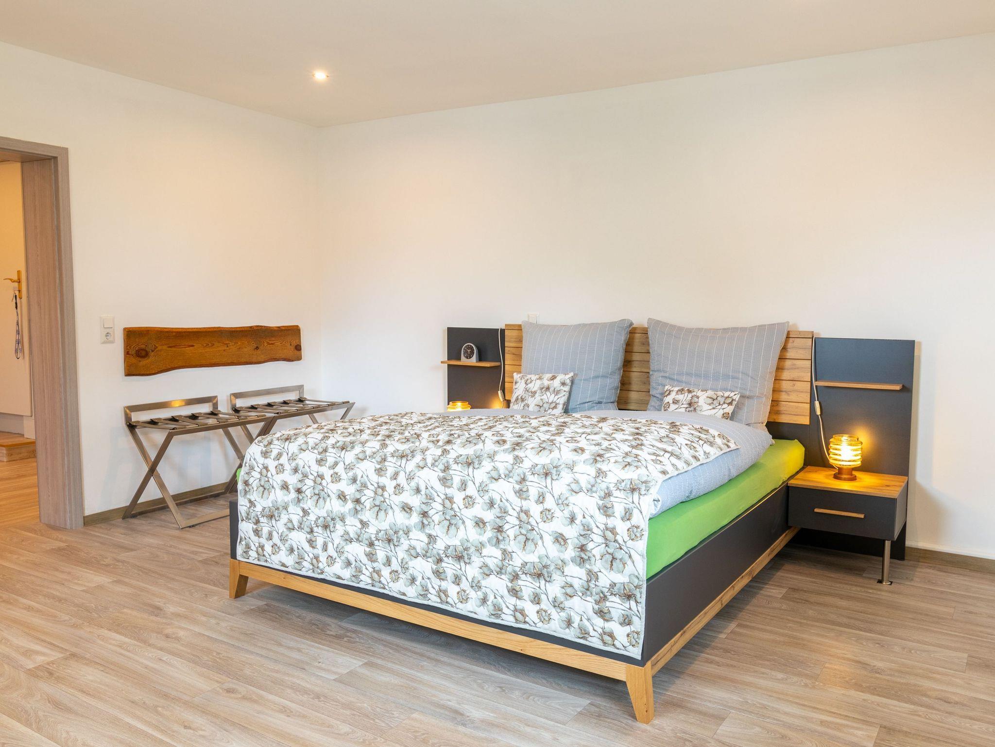 Die 70m² Ferienwohnung 1 bietet Platz für bis zu 2 Personen und 1 Kind bis 17 Jahre und befindet sich im Erdgeschoss des Zweifamilienhauses - mit separatem Eingang. Der großzügige Wohnraum ist mit einer gemütlichen Couch, einladenden Sesseln und Sat-TV ausgestattet. Eine offene Küchenzeile und ein Essbereich sind ebenfalls in den Wohnbereich integriert. Die Küchenzeile verfügt über einen Kühlschrank mit Gefrierfach, ein 2-Platten Ceranfeld, eine Mikrowelle mit Grillfunktion, eine Kaffeemaschine, einen Wasserkocher, sowie Toaster und Eierkocher. Im Bad findest du ein großes Waschbecken für zwei Personen, Bluetooth-Spiegel, ein Haartrockner, Dusche und WC. Das Schlafzimmer bietet dir mit einem Doppelbett mit getrennten Matratzen, zwei Nachttischen, zwei Kofferablagen, einem großen Kleiderschrank, Spiegel und einer Sitzmöglichkeit viel Stauraum und Komfort für erholsame Nächte. Vor der Wohnung erwartet dich eine eigene, möblierte Terrasse samt Grill, auf der du den Tag entspannt ausklingen lassen kannst.