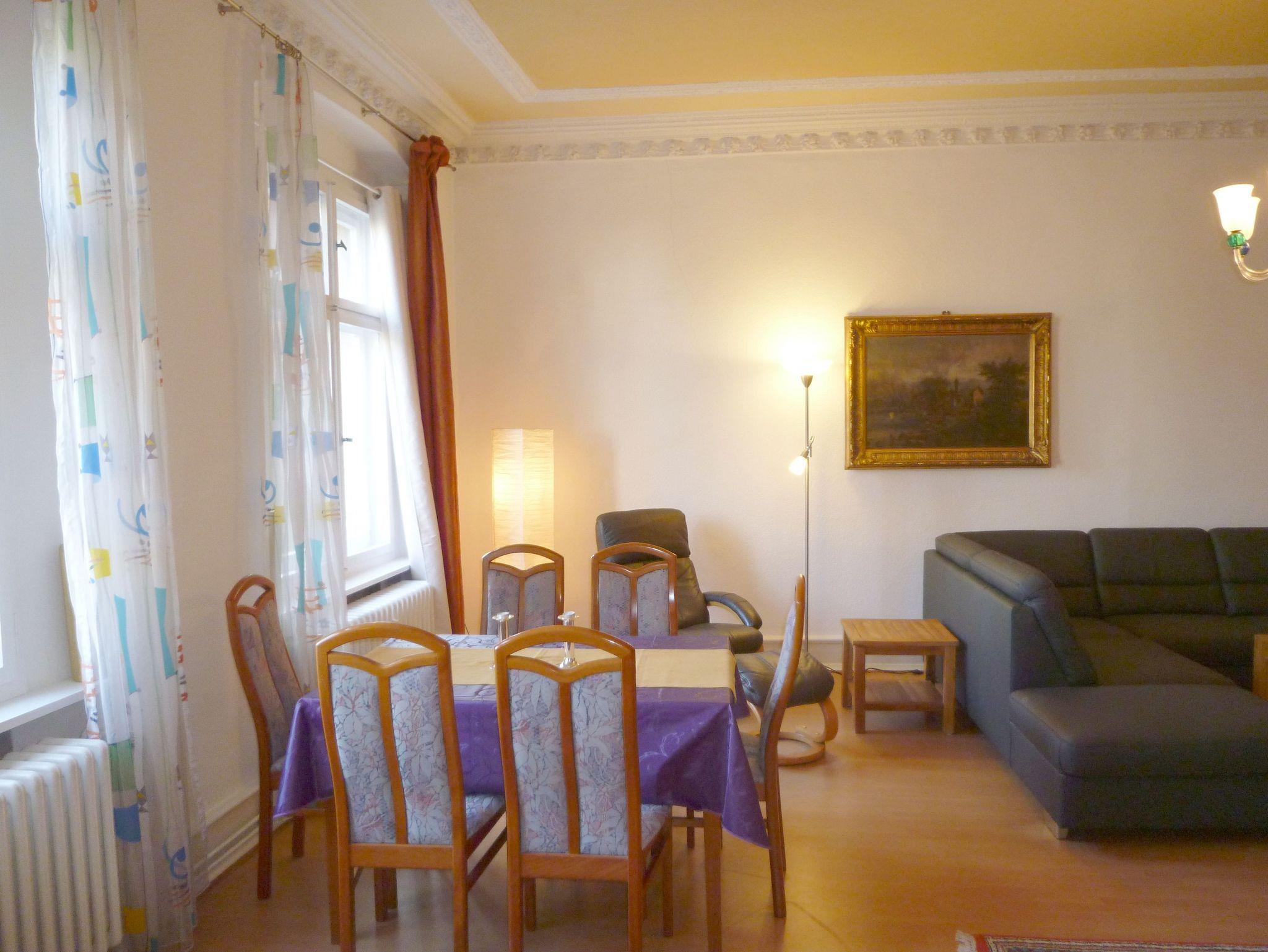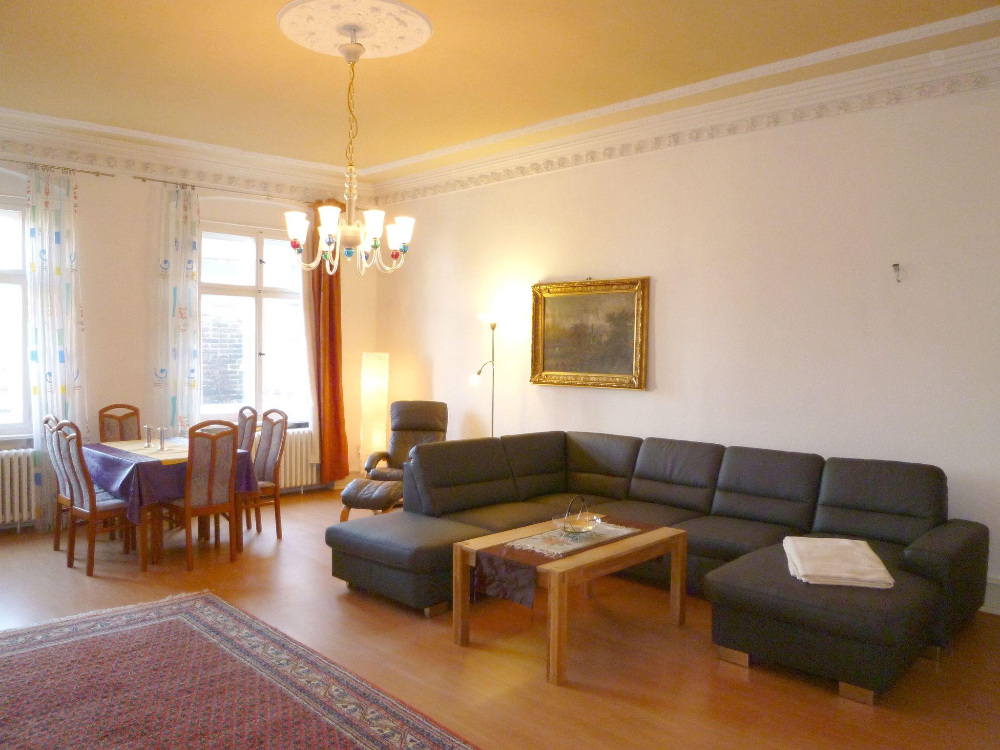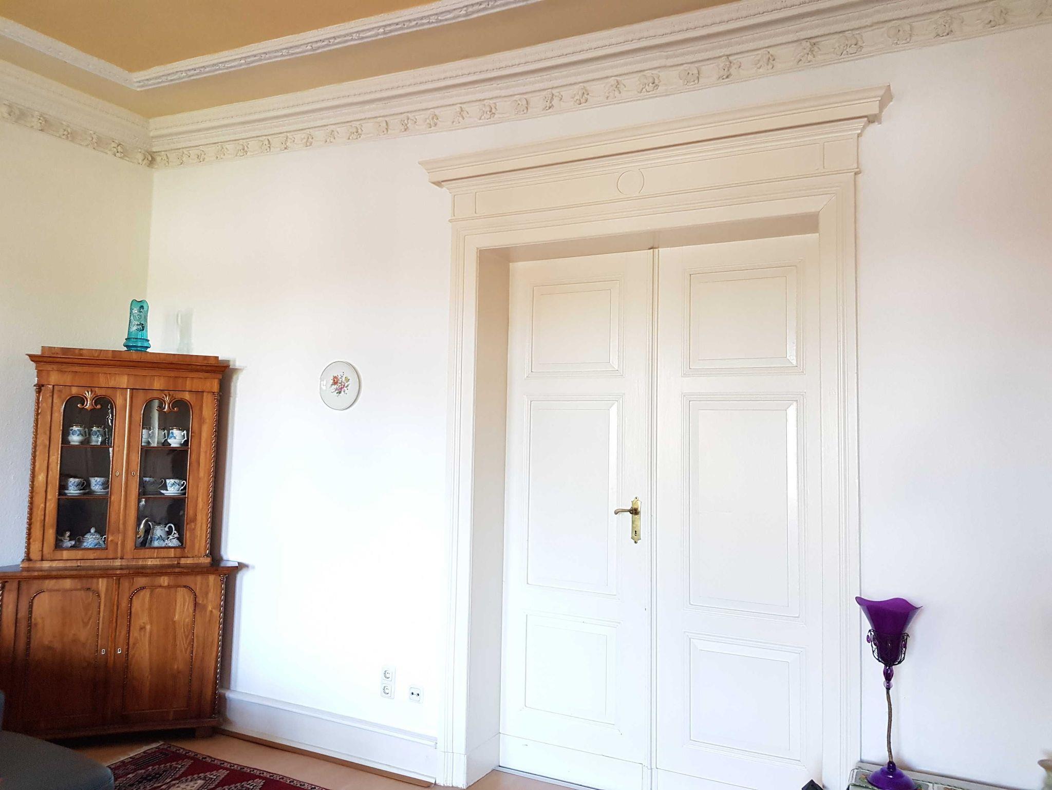 Ferienwohnung mit herrschaftlicher Raumhöhe und wunderschönen Stuckdecken. Das herrschaftliche, helle Wohnzimmer ist 40 m² groß. Komfortables Schlafzimmer mit Doppelbett und zusätzlicher Schlafcouch. Das Schlafzimmer verfügt über einen wunderschönen geölten Originalfußboden. Die Wohnung befindet sich im ersten Obergeschoss auf der rechten Seite.