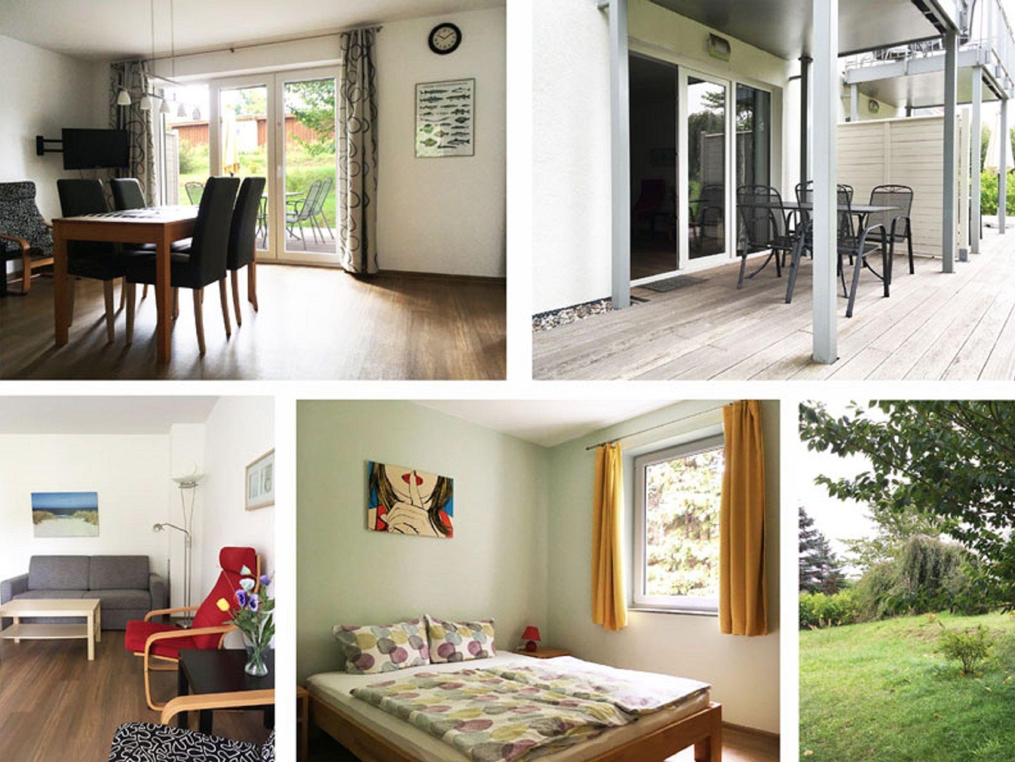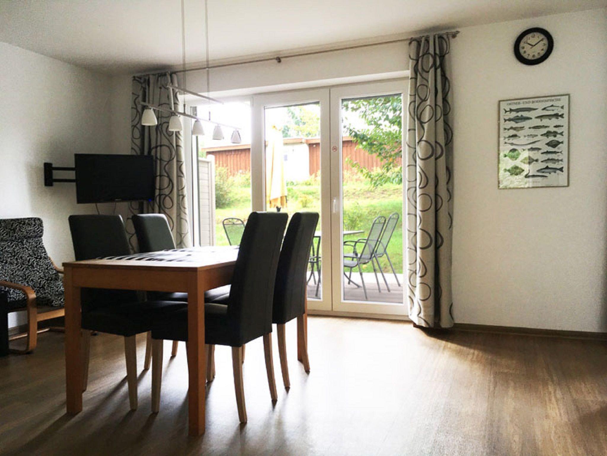Die Ferienwohnung Achterwasser befindet sich im Erdgeschoss des Hauses und ist ca. 59 m² groß. Das geräumige Wohnzimmer ist ausgestattet mit einem gemütlichen Sofa, Sessel zum Lesen und Fernsehen, mit einem Fernseher und mit einem Radio, sowie mit einem Esstisch und vier Stühlen. Durch das große Terrassenfenster haben Sie einen schönen Ausblick ins Grüne. Die offene Küchenzeile verfügt über eine Ausstattung zum alltäglichen Kochen: Geschirr, Kochgeschirr, Ceranfeld, Backofen, Kühlschrank, Spülmaschine, Mikrowelle, Kaffeemaschine, Wasserkocher und Toaster.