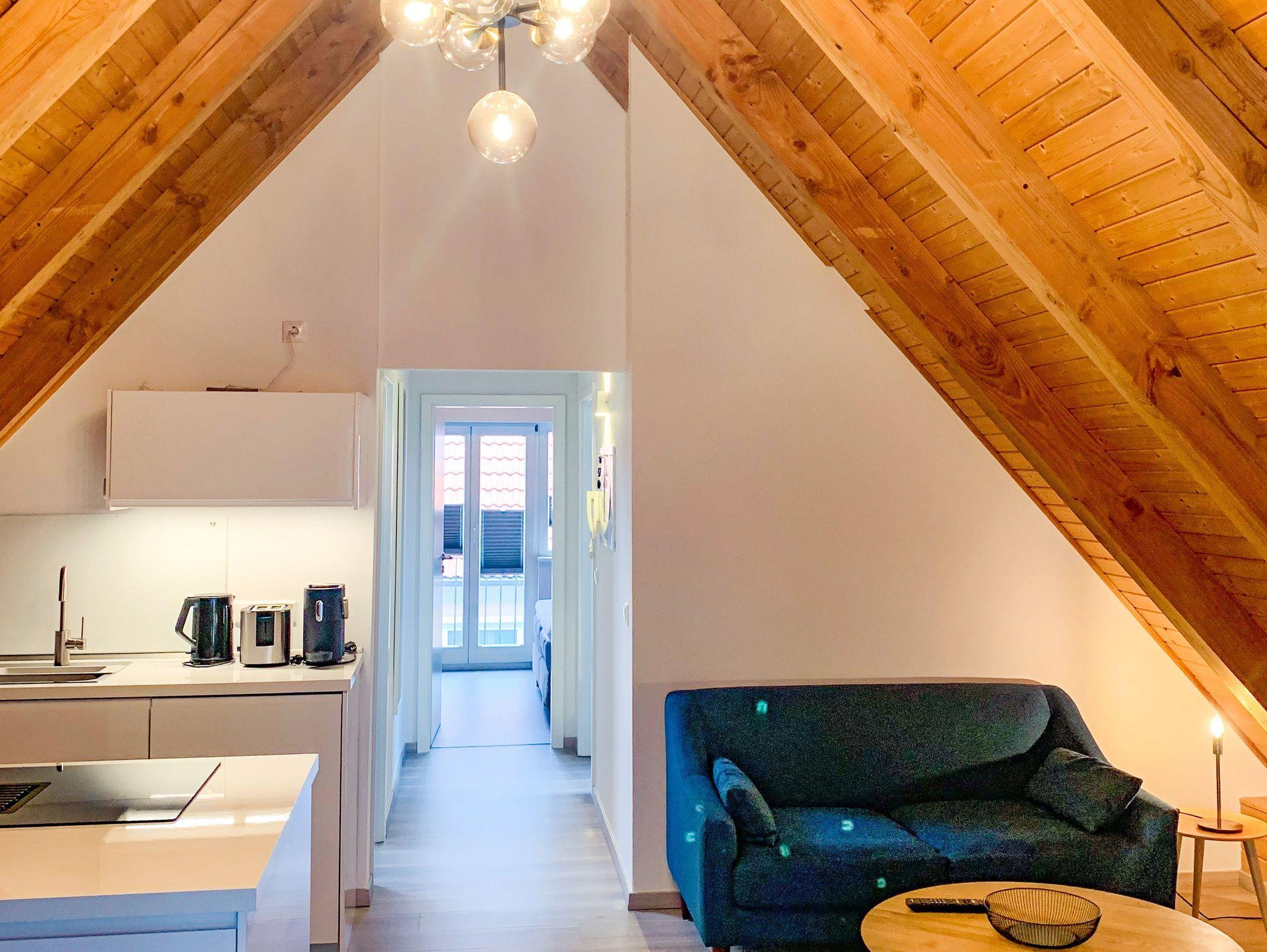 Für die Arbeit im Apartment kannst du optional einen höhenverstellbaren Schreibtisch mit großem Bildschirm hinzubuchen, der sich ideal für produktives Arbeiten eignet. Die Küche ist voll ausgestattet ? vom Cerankochfeld über den Backofen bis zur Spülmaschine ist alles für das Kochen und die tägliche Versorgung da, ergänzt durch eine CoffeeB-Kaffeemaschine, Frenchpress, Toaster, Wasserkocher und ausreichend Geschirr. Auch grundlegende Vorräte wie Spülmittel, Gewürze und Kaffee gehören zur Ausstattung. Im modernen Bad findest du eine komfortable Regendusche und alles, was du für deine persönliche Pflege brauchst, inklusive Hand- und Duschtüchern, Seife und Föhn.