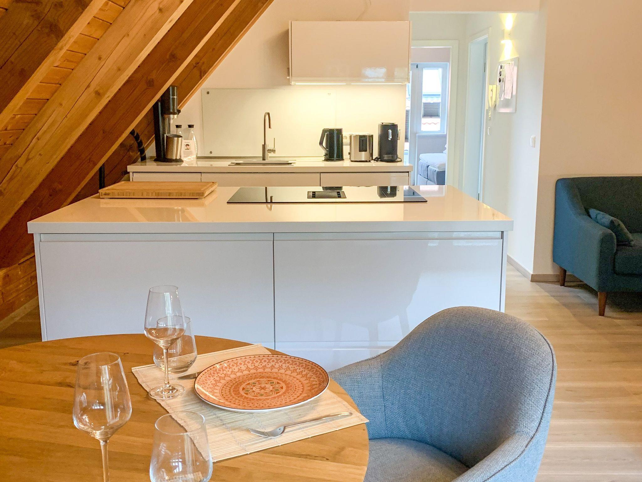 Mit durchdachten Wohn- und Arbeitsbereichen bieten die Apartments alles für einen produktiven und komfortablen Aufenthalt. Der großzügige Wohnraum enthält eine gemütliche Sitzecke sowie einen Essbereich ideal für entspannte Pausen und gemeinsames Essen. Für konzentriertes Arbeiten lässt sich optional ein höhenverstellbarer Schreibtisch mit 27-Zoll-Monitor hinzubuchen. In der voll ausgestatteten Küche, inklusive Backofen, Cerankochfeld, Spülmaschine und Kaffeemaschine, kannst du dich flexibel selbst versorgen.
