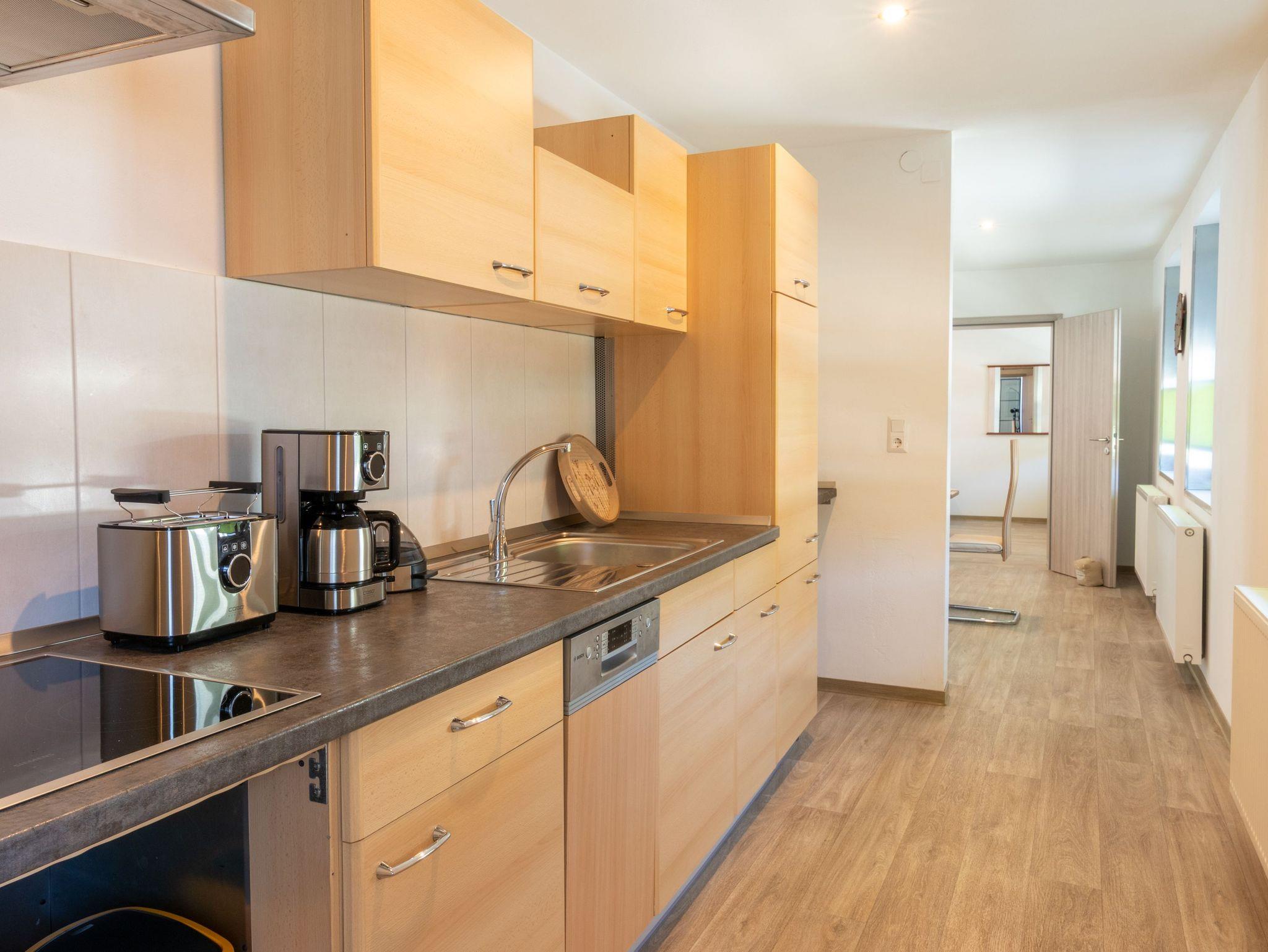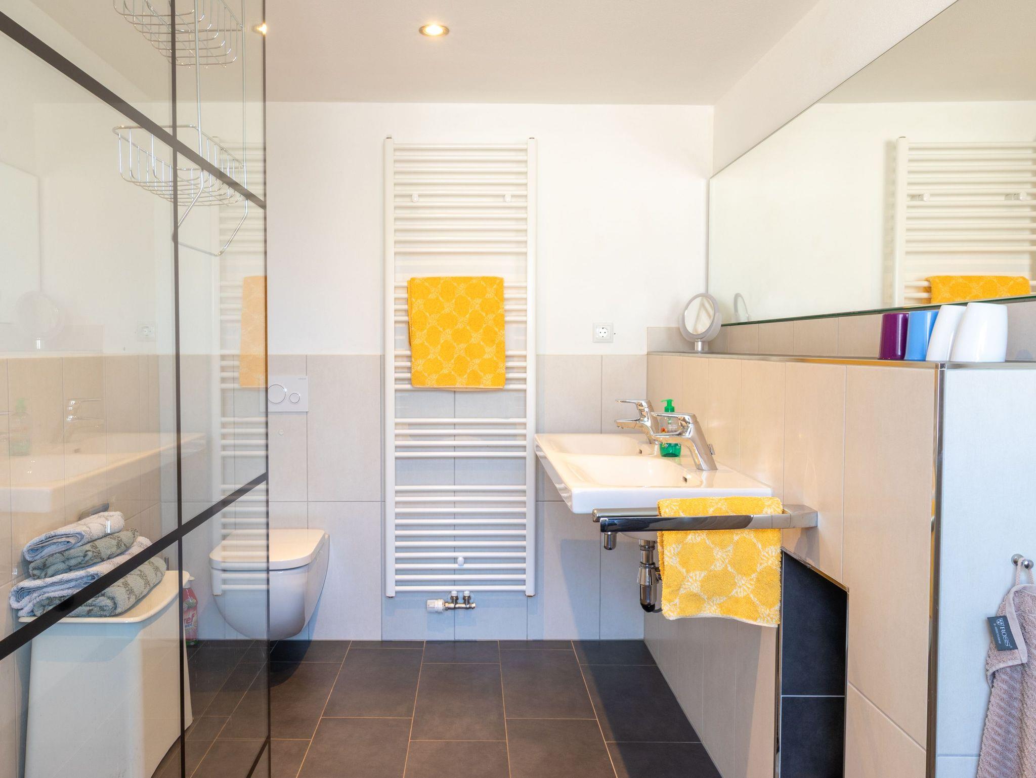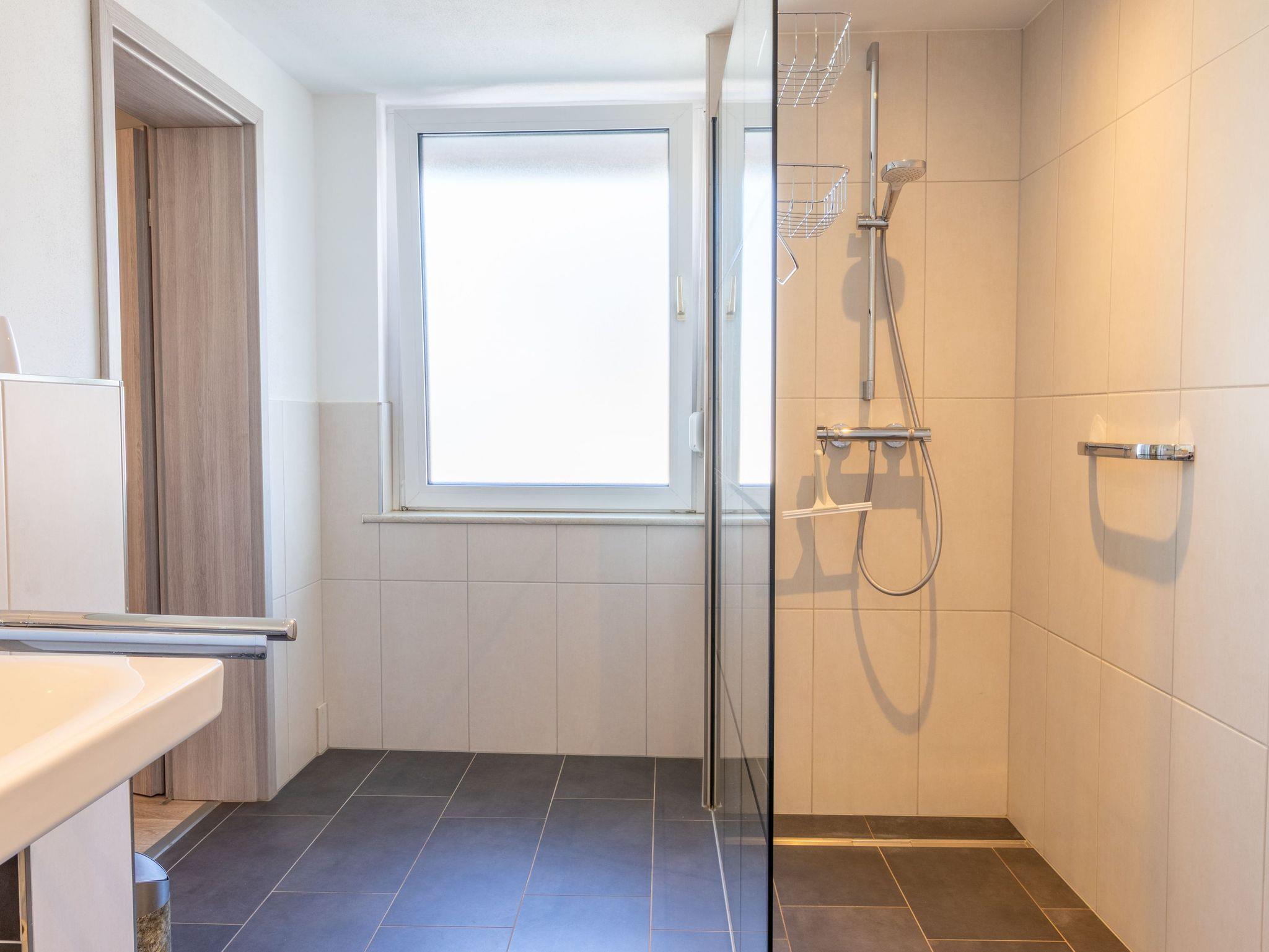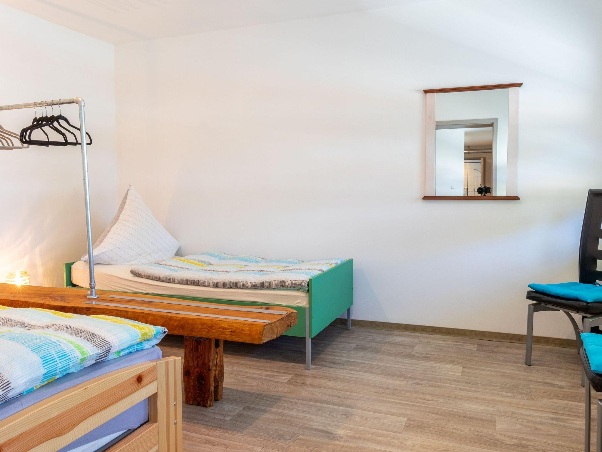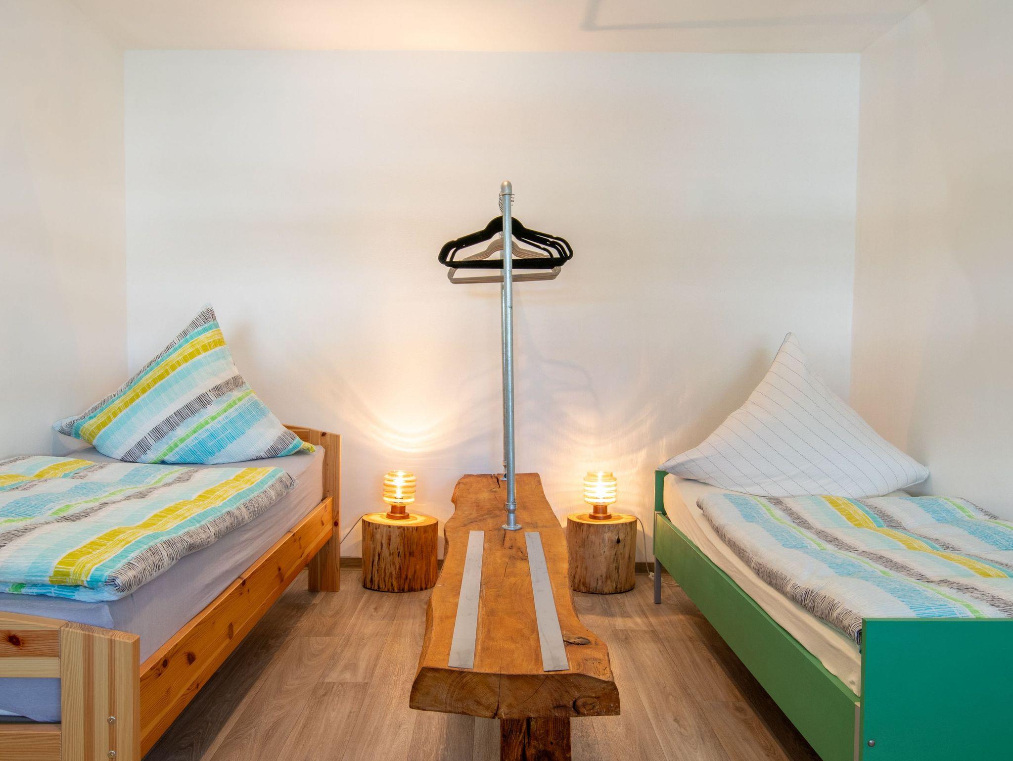 Die 100 m² große Ferienwohnung 2 befindet sich im Erdgeschoss und verfügt über einen separaten Eingang. Sie bietet Platz für bis zu 4 Personen und eignet sich ideal für einen entspannten Familienurlaub. Du betrittst die lichtdurchflutete Wohnung über das Wohnzimmer, das durch sichtbare Holzbalken in einen Ankleidebereich mit Garderobe und Sessel sowie einen gemütlichen Wohnbereich unterteilt ist. Im Wohnbereich erwarten dich ein bequemes Sofa, ein Esstisch und ein Flachbild-TV - der perfekte Ort zum Entspannen nach einem erlebnisreichen Tag. Die offene Küche ist voll ausgestattet und bietet alles, was du für die Selbstverpflegung brauchst. Mikrowelle, Kaffeemaschine, Toaster, Wasserkocher, Spülmaschine, Kühlschrank, Herd und ein Gefrierschrank stehen dir zur Verfügung. Die beiden Schlafzimmer bieten ausreichend Platz und Komfort. Eines ist mit einem Doppelbett (180x200) ausgestattet, das andere mit zwei Einzelbetten (90x200). Beide Zimmer verfügen über Kleiderhaken für deine persönlichen Dinge. Das moderne Badezimmer ist mit einer ebenerdigen Dusche, einem WC und unterfahrbaren Waschbecken ausgestattet und sorgt für einen angenehmen Start in den Tag. Direkt vor der Wohnung befinden sich Parkplätze sowie ein Sitzbereich mit Gartenmöbeln und Grill, die sich hervorragend für ein gemütliches Frühstück im Freien oder einen entspannten Abend eignen.