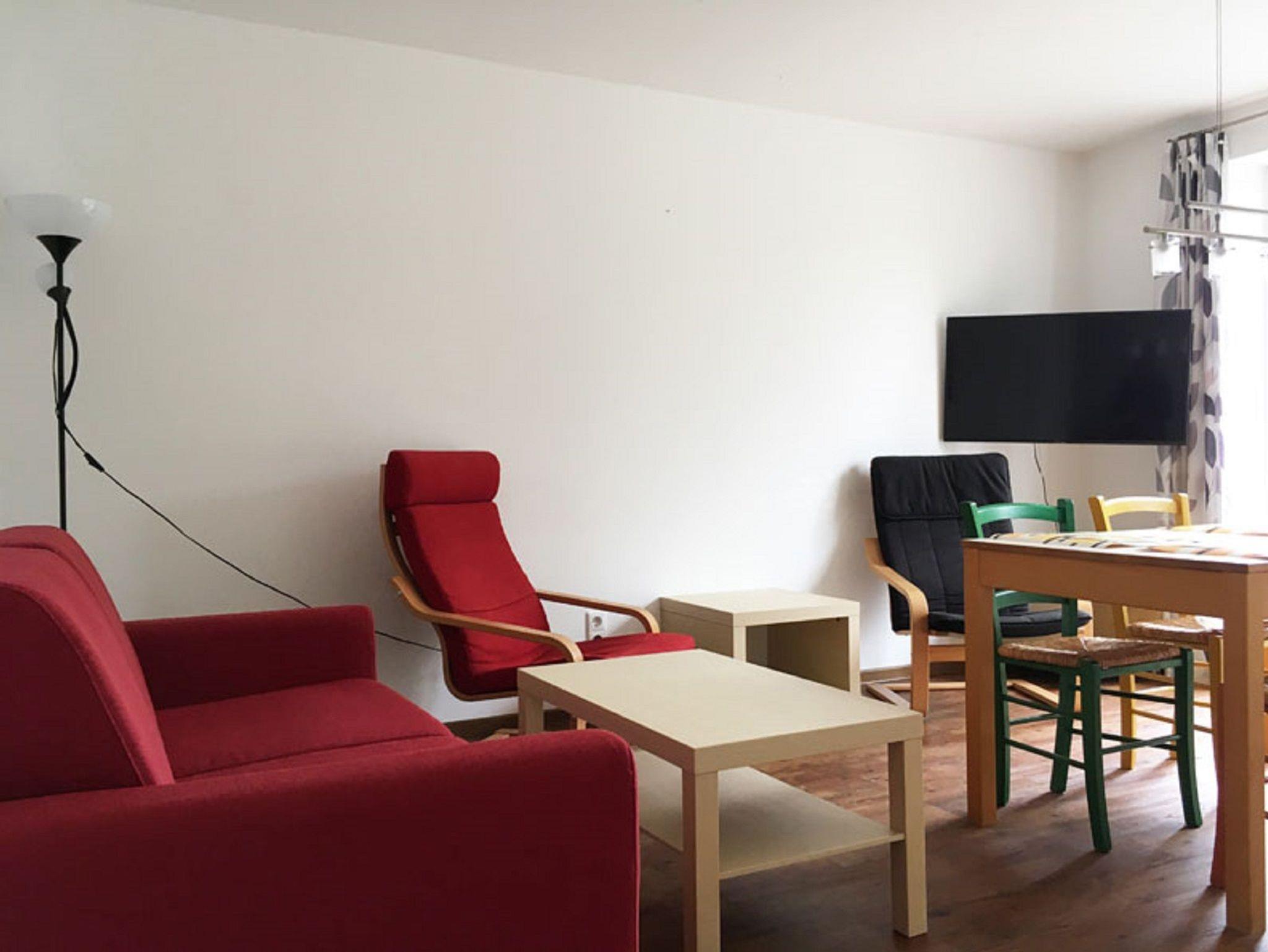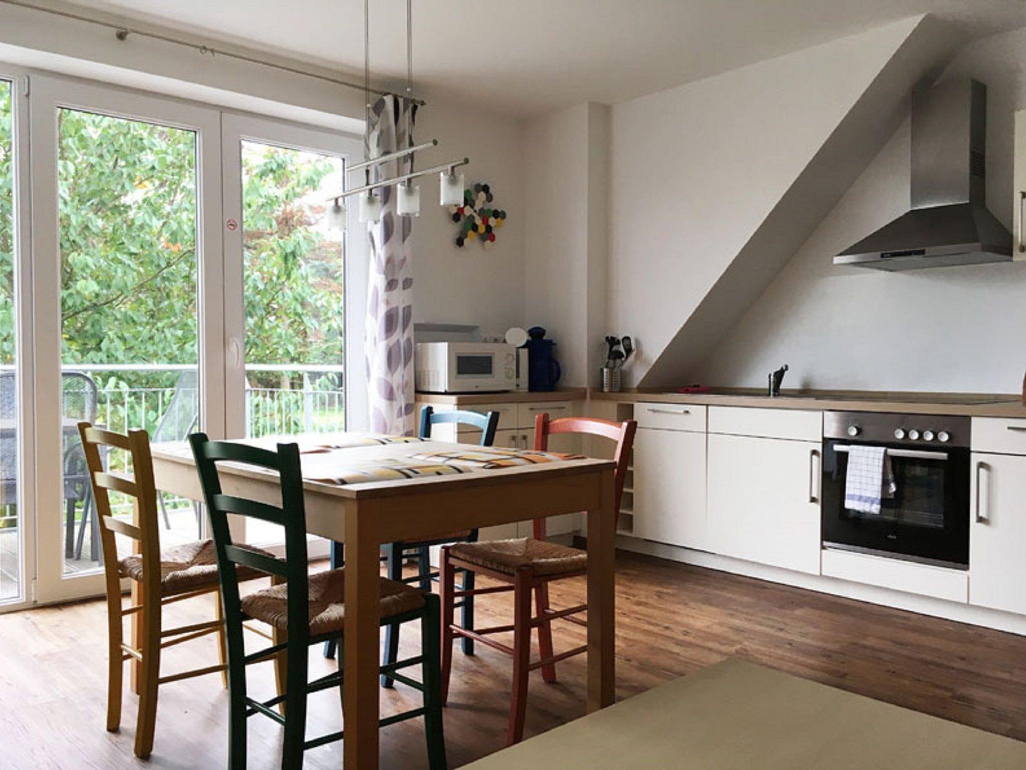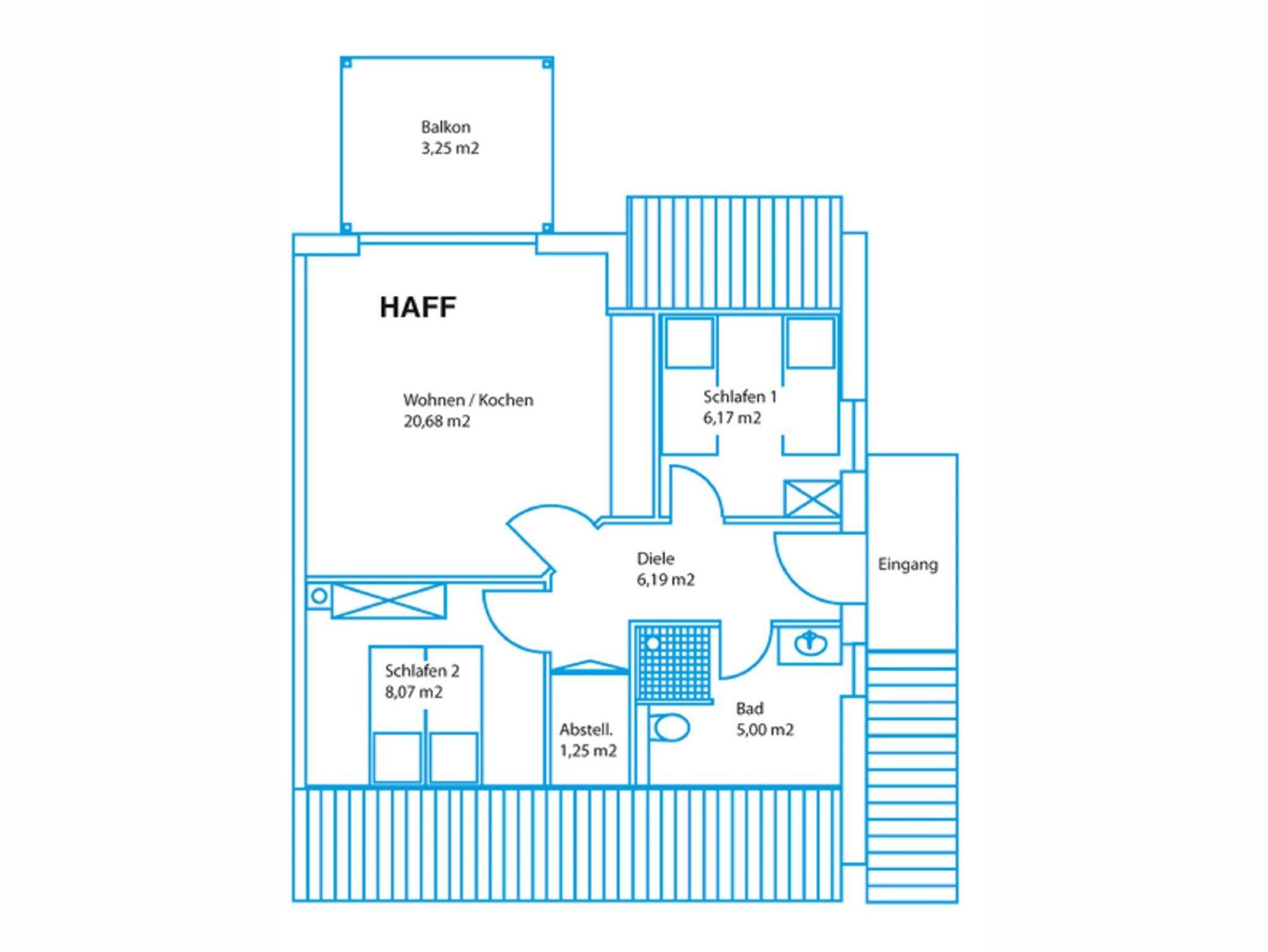 Die Ferienwohnung Haff befindet sich im Obergeschoss des Hauses und ist ca. 49 m² groß. Das geräumige Wohnzimmer ist ausgestattet mit einem gemütlichen Sofa, Sessel zum Lesen und Fernsehen, mit einem Fernseher und mit einem Radio, sowie mit einem Esstisch und vier Stühlen. Durch das große Balkonfenster haben Sie einen schönen Ausblick ins Grüne. Die offene Küchenzeile verfügt über eine Ausstattung zum alltäglichen Kochen: Geschirr, Kochgeschirr, Ceranfeld, Backofen, Kühlschrank, Spülmaschine, Mikrowelle, Kaffeemaschine, Wasserkocher und Toaster.