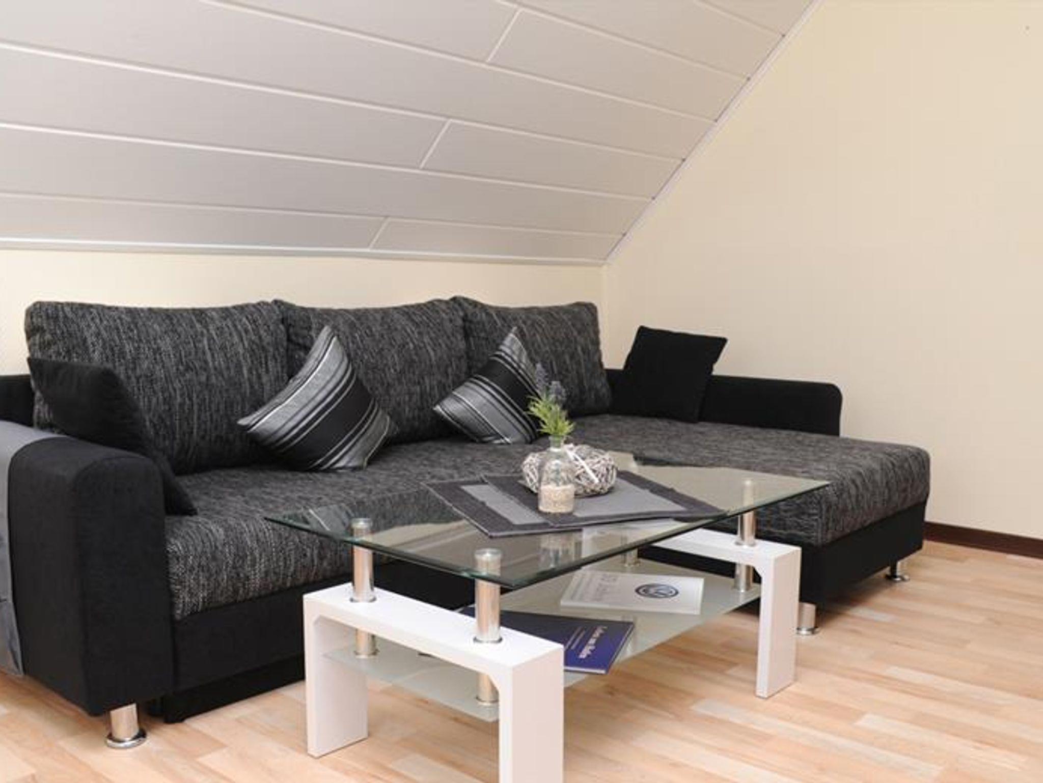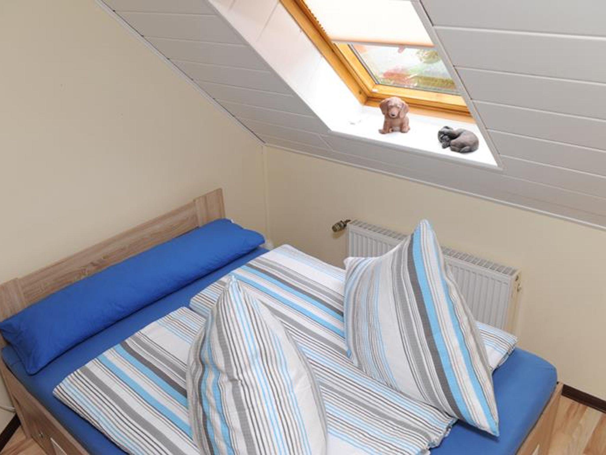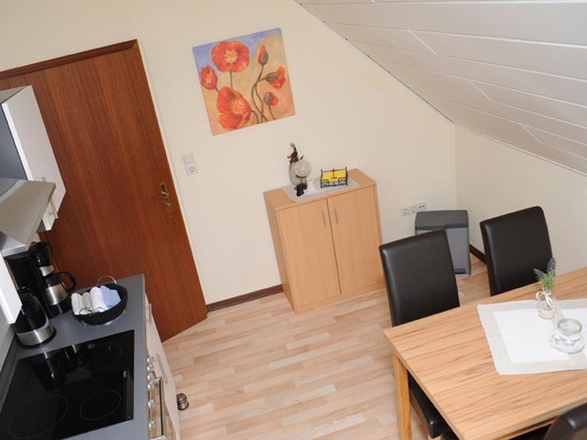 Die Oberwohnung, Baujahr 1996, hat eine Wohnfläche von ca. 55 qm und ist für 2 Personen, Nichtraucher ohne Haustiere, ausgestattet. Die neuwertig ausgestattete Ferienwohnung besteht aus einem Wohnzimmer mit Flachbild TV (Kabelempfang), Essküche, Duschbad und Schlafzimmer mit Doppelbett. Kinderbettchen und Hochstuhl vorhanden.