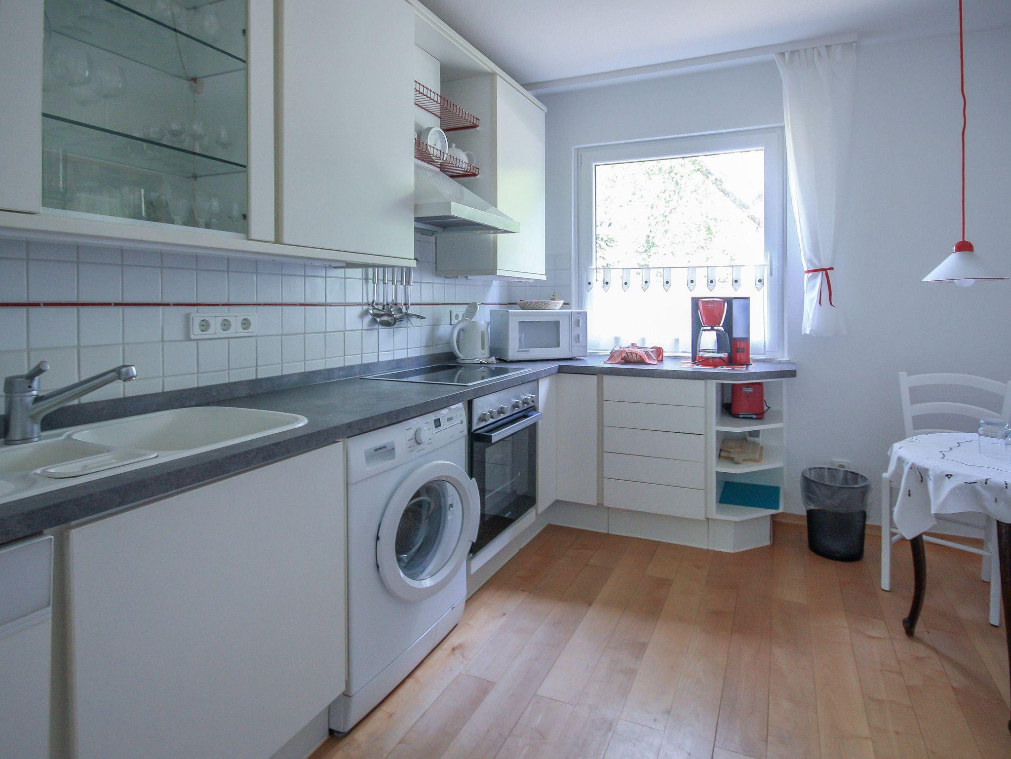 Die Küche ist ebenfalls von komfortabler Größe, sodass Sie hier auf nichts verzichten müssen. Neben einer Kaffemaschine, einem Toaster und einem Wasserkochen steht Ihnen noch ein Kochfeld mit Backofen sowie eine Geschirr- und Waschmaschine zur Verfügung.