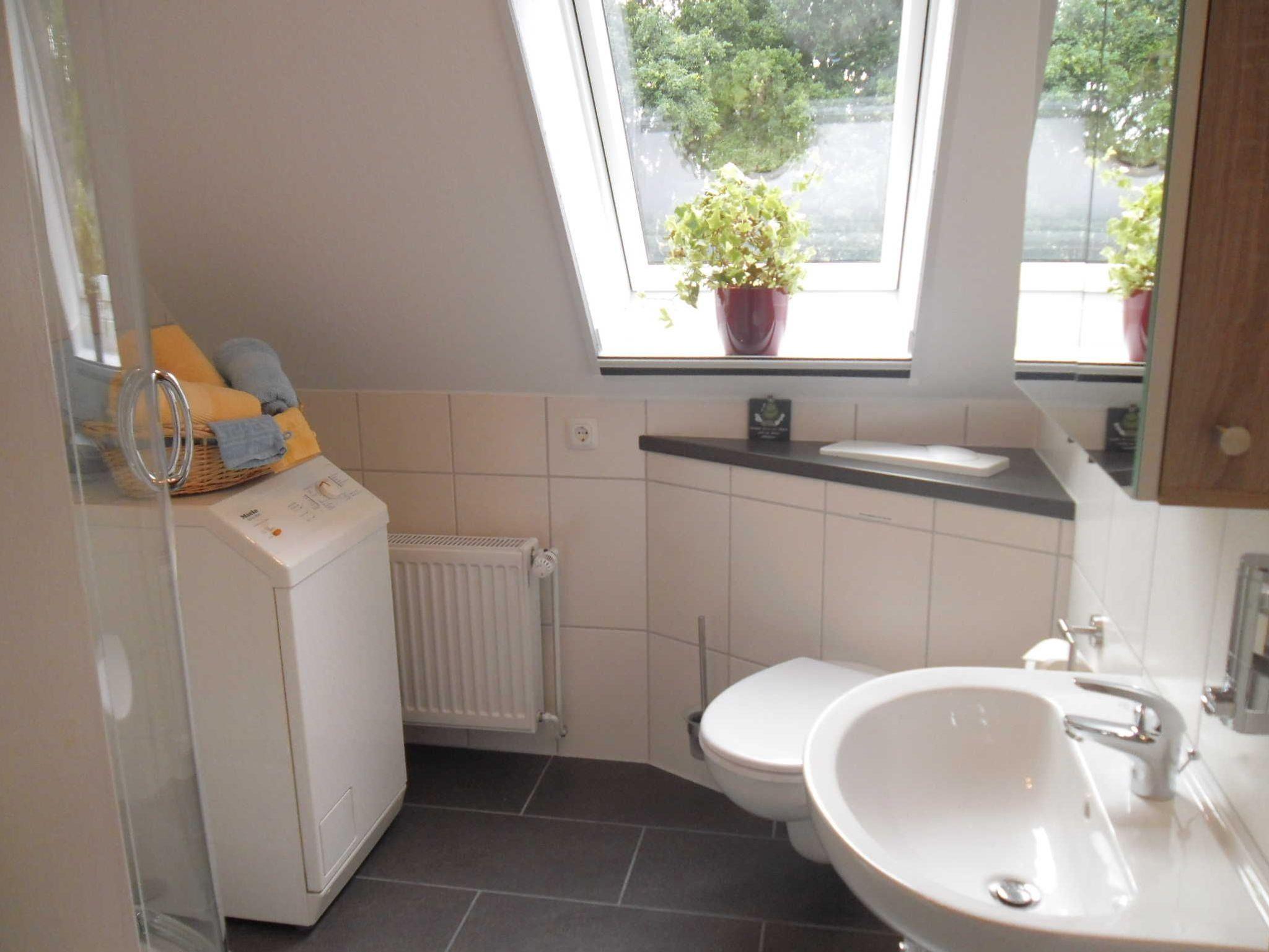 Das Tageslichtbad überzeugt mit einer großen Rund-Dusche. Eine Waschmaschine inkl. Waschmittel steht zu Ihrer Verfügung. Zur weiteren Ausstattung gehört hier ein Spiegelschrank, Fön und ein verstellbarer Kosmetikspiegel.