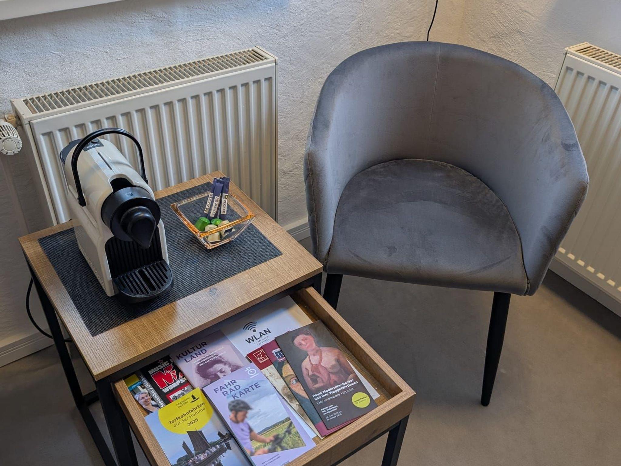 Das Apartment ist komfortabel ausgestattet und bietet alles, was Sie für einen angenehmen Aufenthalt benötigen. Ein hochwertiges 180cm Boxspringbett garantiert erholsamen Schlaf. In der praktischen Küchenzeile stehen Ihnen ein Kühlschrank, zwei Herdplatten sowie eine Basis-Küchenausstattung zur Verfügung. Zusätzlich finden Sie eine Nespresso-Kapselmaschine, einen Toaster und einen Wasserkocher. Am kleinen Essbereich für zwei Personen können Sie gemütlich frühstücken oder den Abend ausklingen lassen. Für entspannte Stunden sorgen ein bequemer Sessel, ein Flachbild-TV sowie ein großer Kleiderschrank mit Bügeln, Fächern und viel Stauraum. Das Badezimmer verfügt über eine Badewanne mit integrierter Regendusche sowie einen Föhn. Dank Verdunkelungsrollos schlafen Sie ungestört und entspannt. Im Sommer bleibt das Apartment angenehm kühl, während es im Winter gut beheizt werden kann. Aktuelles Informationsmaterial über Worpswede und die Umgebung liegt für Sie bereit.