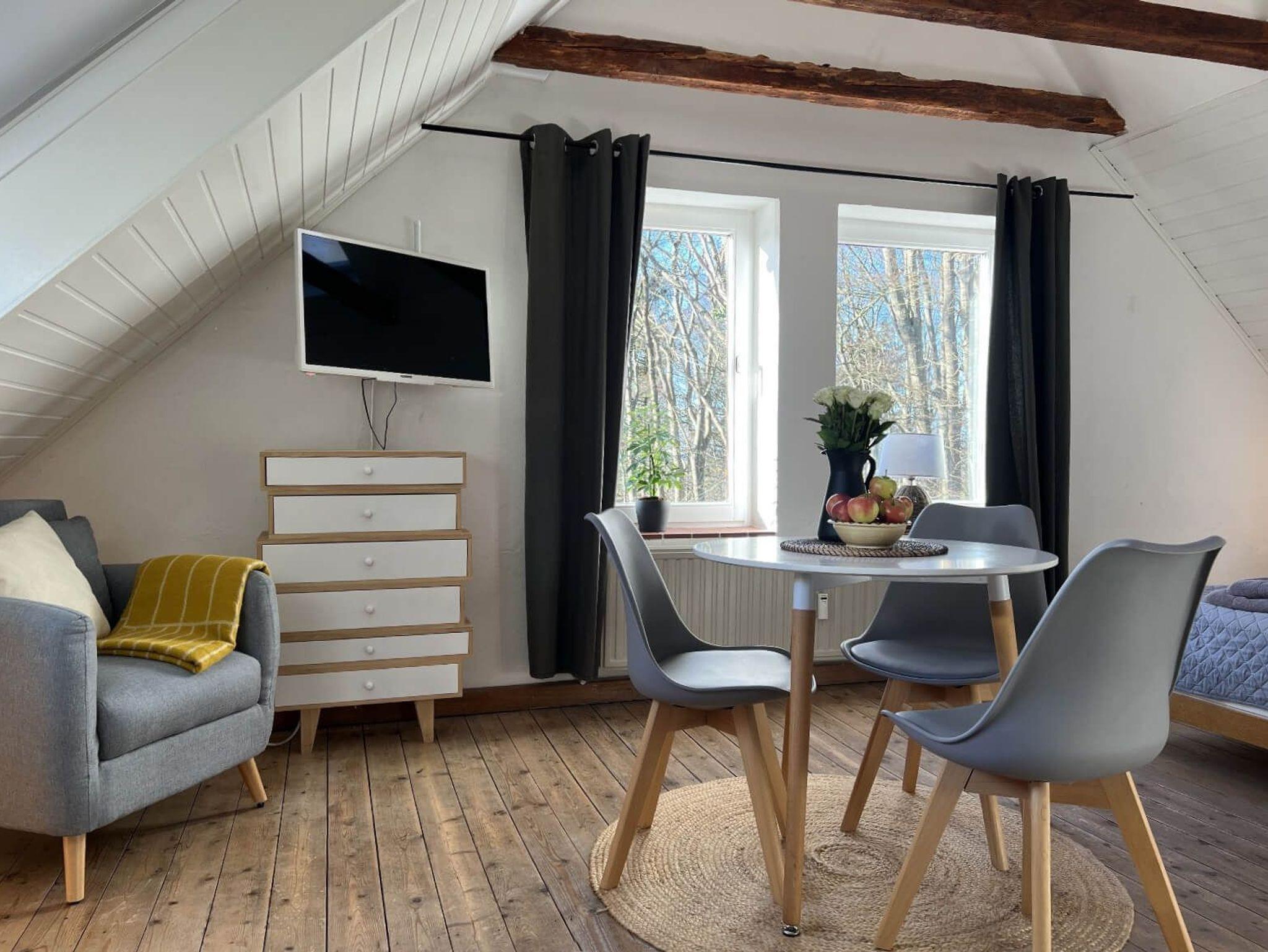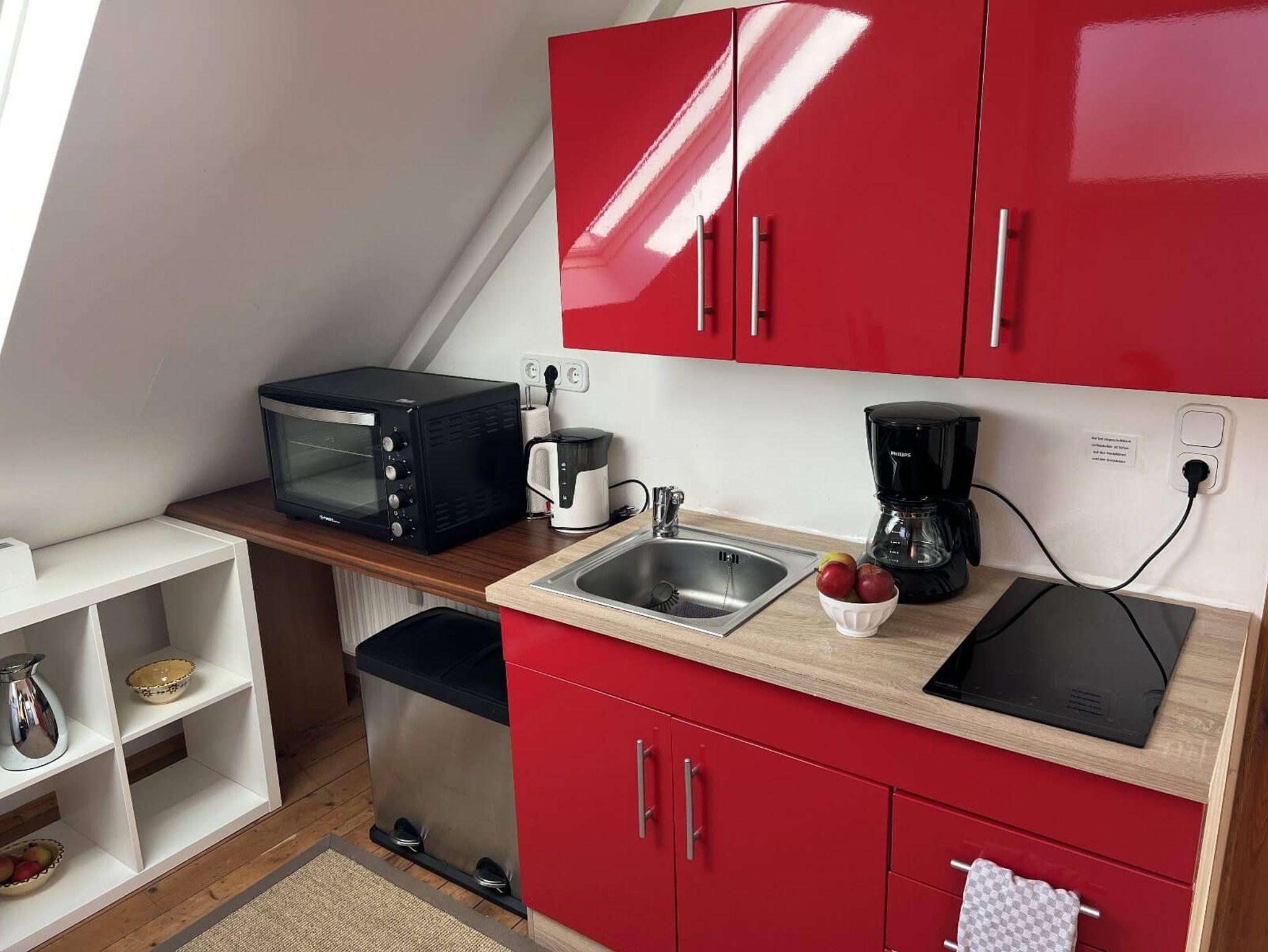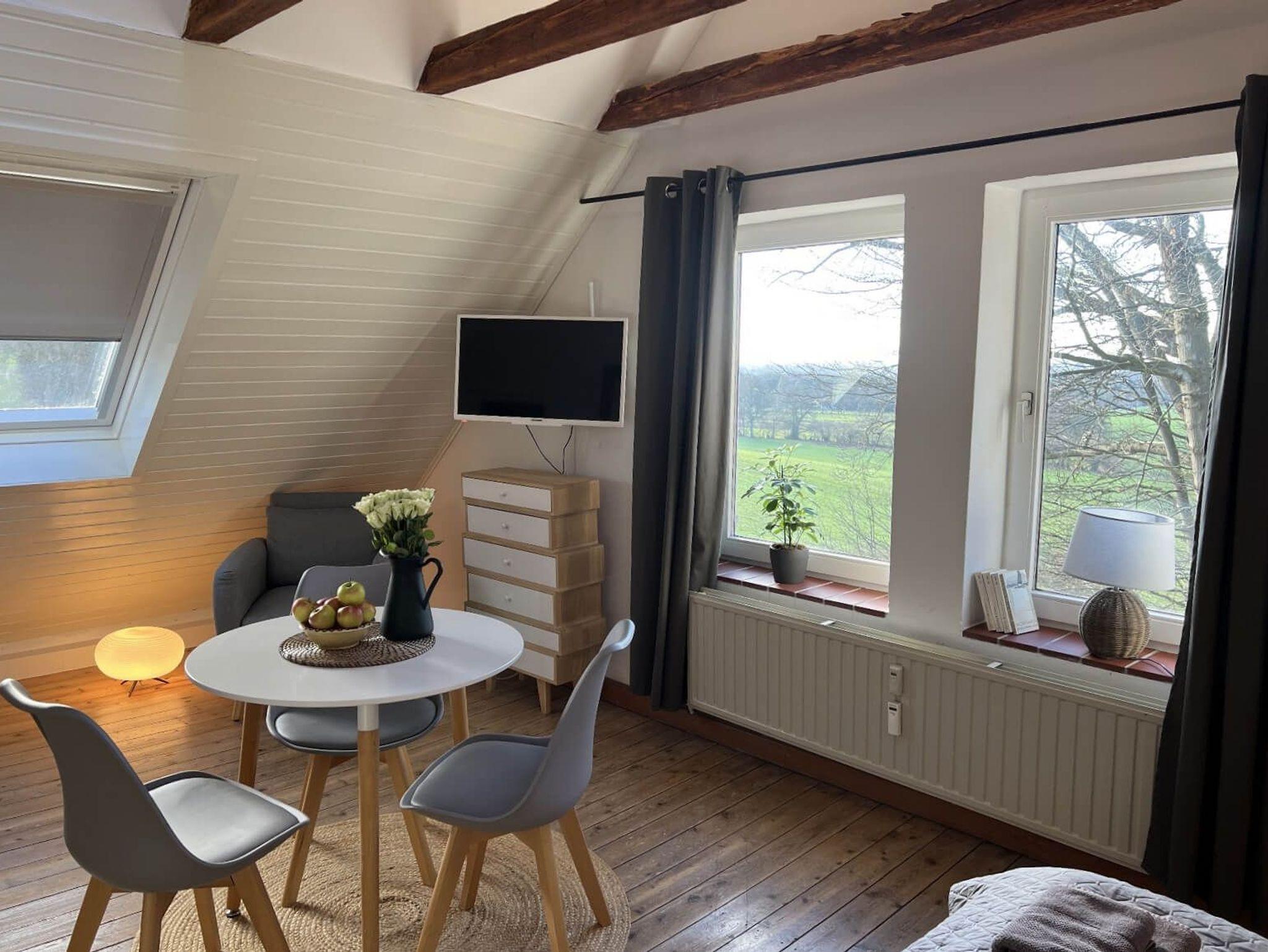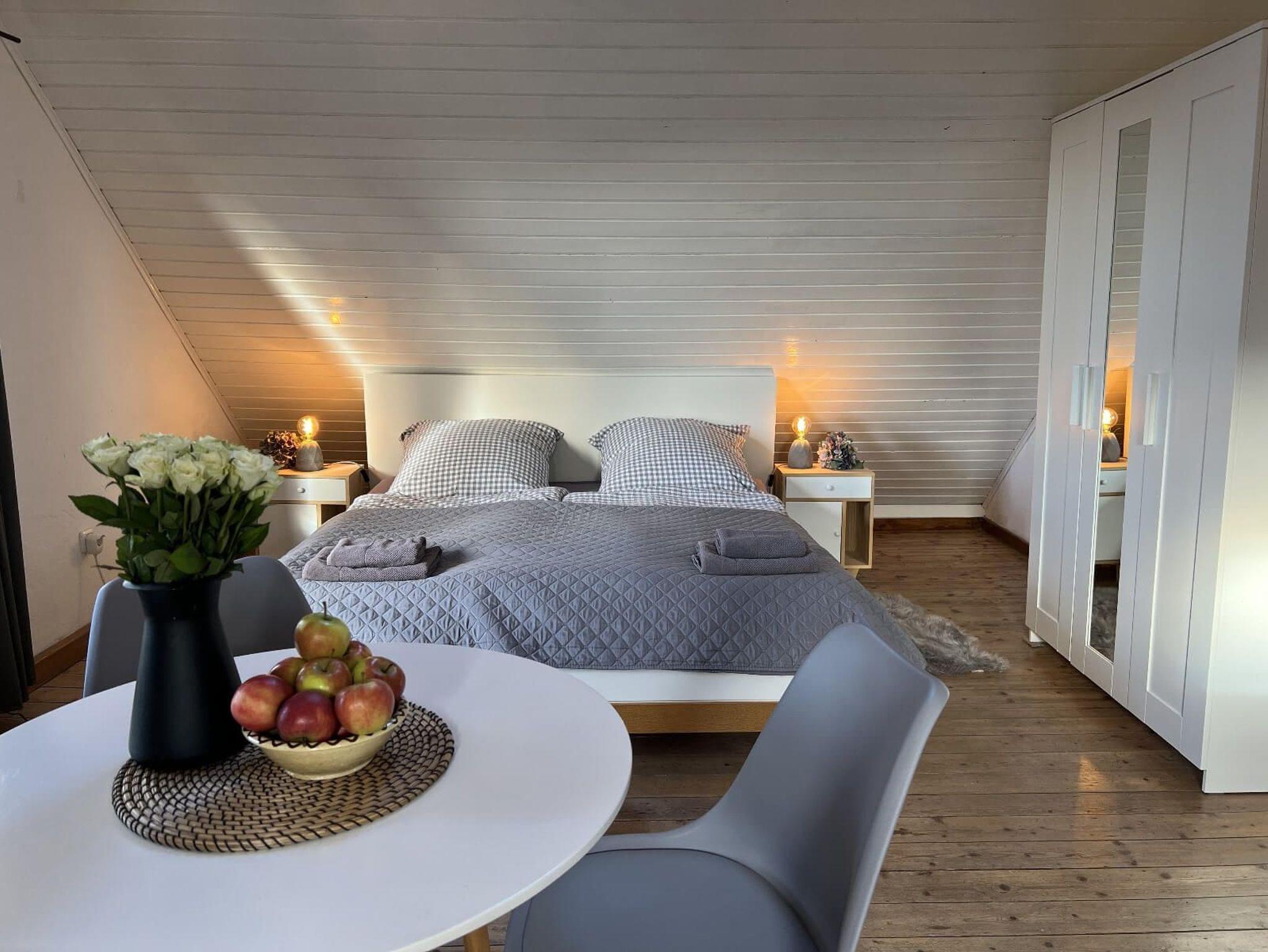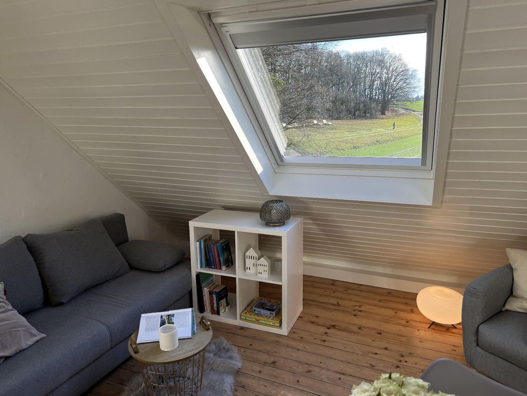 Ganz oben unter’m Dach mit gemütlichen 36 m2 Wohnfläche, neuer kleiner Küche und eleganter Dusche mit vielen Schrägen, viel Holz und viel Licht von Deckenfenstern und Fenstern rund um, bietet das ehemalige Maleratelier von Willi Ohler, Ende 2016 frisch renoviert und stilvoll gestaltet, einen fantastischen Blick vom Weyerberg auf Bremen und das Bremer Umland. Hohe Decken, freigelegte Eichenbalken und schräge Wände geben immer noch künstlerische Inspirationen. Gedacht für zwei Gäste (max.3), die wirklich stimmungsvoll hier verweilen wollen. Die neue schöne und schwungvoll gestaltete Wendeltreppe zum Eingang des Ateliers führt hoch hinaus, für Gäste mit Bewegungseinschränkungen eher nicht empfohlen.