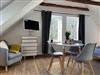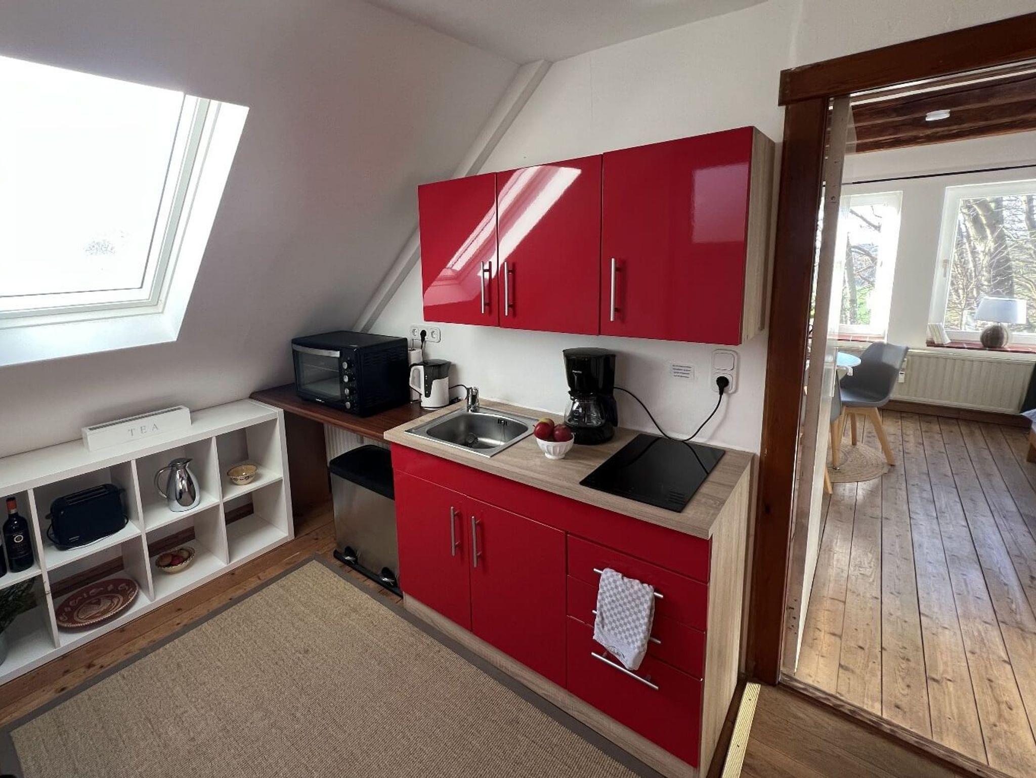 Ganz oben unterm Dach mit gemütlichen 36 m2 Wohnfläche, neuer kleiner Küche und eleganter Dusche mit vielen Schrägen, viel Holz und viel Licht von Deckenfenstern und Fenstern rund um, bietet das ehemalige Maleratelier von Willi Ohler, Ende 2016 frisch renoviert und stilvoll gestaltet, einen fantastischen Blick vom Weyerberg auf Bremen und das Bremer Umland. Hohe Decken, freigelegte Eichenbalken und schräge Wände geben immer noch künstlerische Inspirationen. Gedacht für zwei Gäste (max.3), die wirklich stimmungsvoll hier verweilen wollen. Die neue schöne und schwungvoll gestaltete Wendeltreppe zum Eingang des Ateliers führt hoch hinaus, für Gäste mit Bewegungseinschränkungen eher nicht empfohlen.