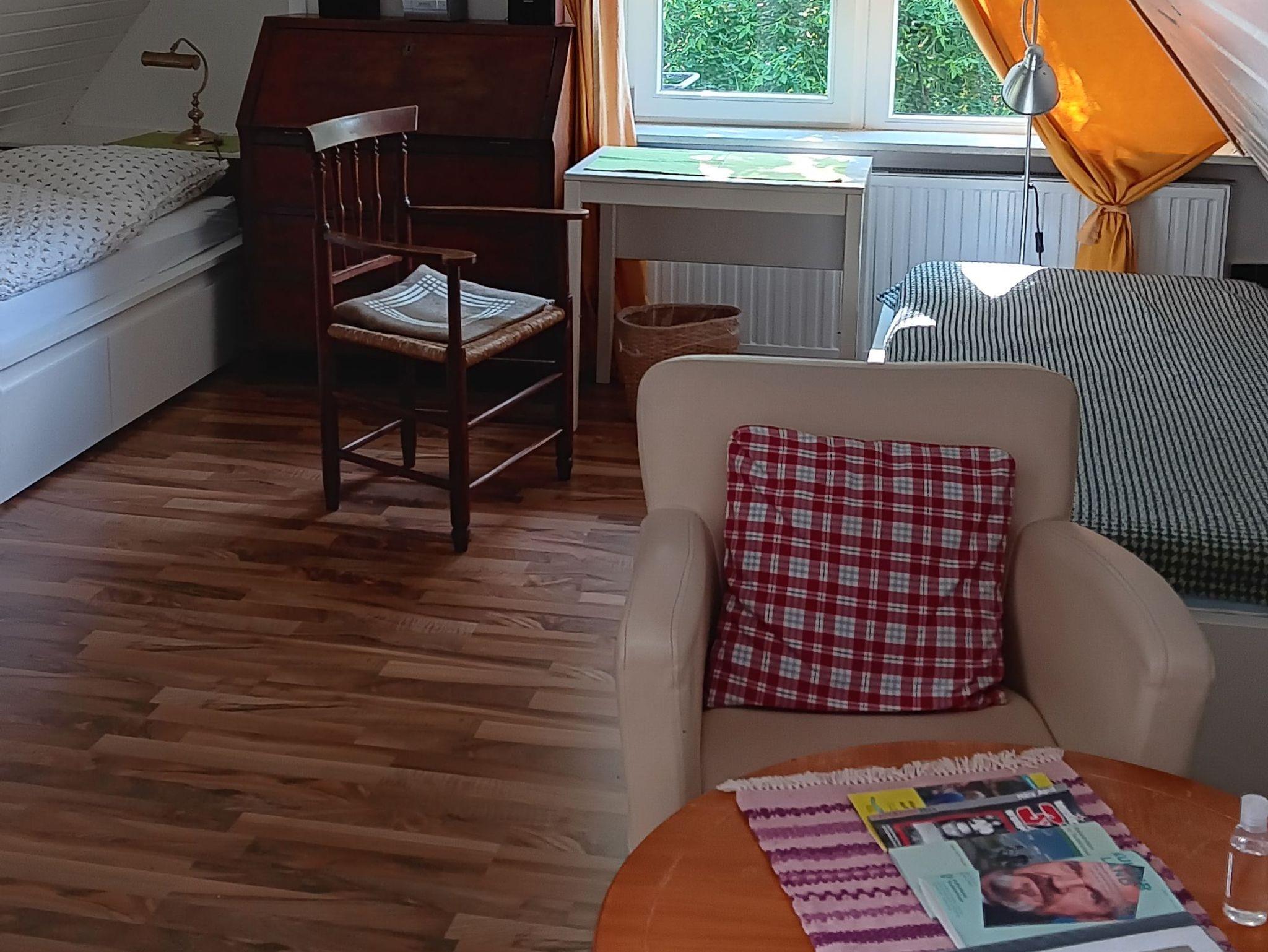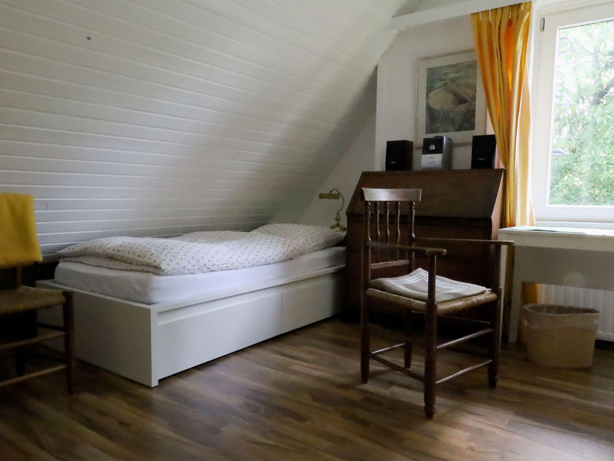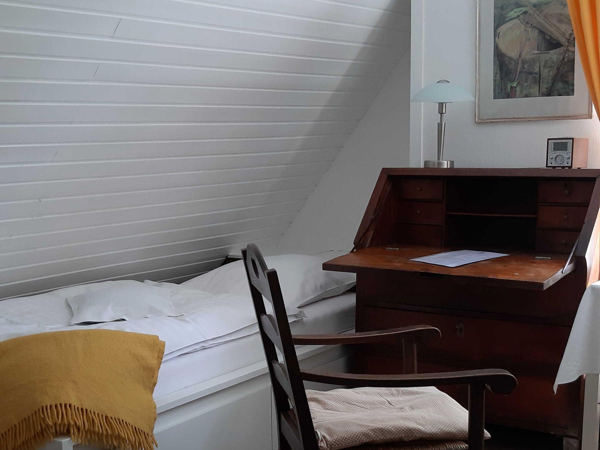Der 31 qm große Wohn-Schlafraum im Dachgeschoss ist mit einer kleinen separaten Küche und einem Duschbad/WC ausgestattet und ist nach Süd-Osten ausgerichtet. Das Appartement ist mit einem Satellitenfernsehen ausgestattet. Geeignet für ein bis zwei Personen (getrennt stehende Betten). Preis inkl. Bettwäsche, Handtücher und Endreinigung.