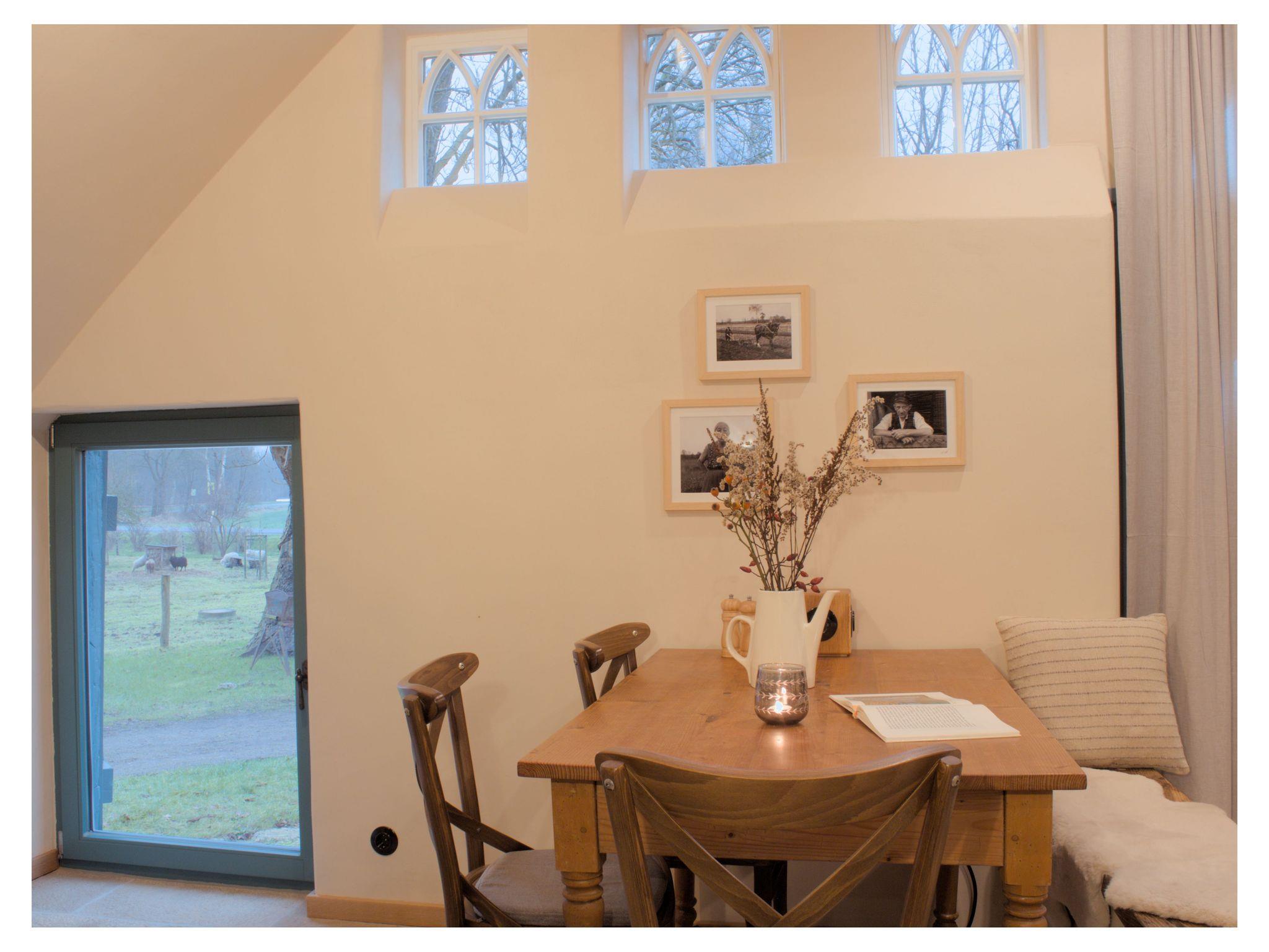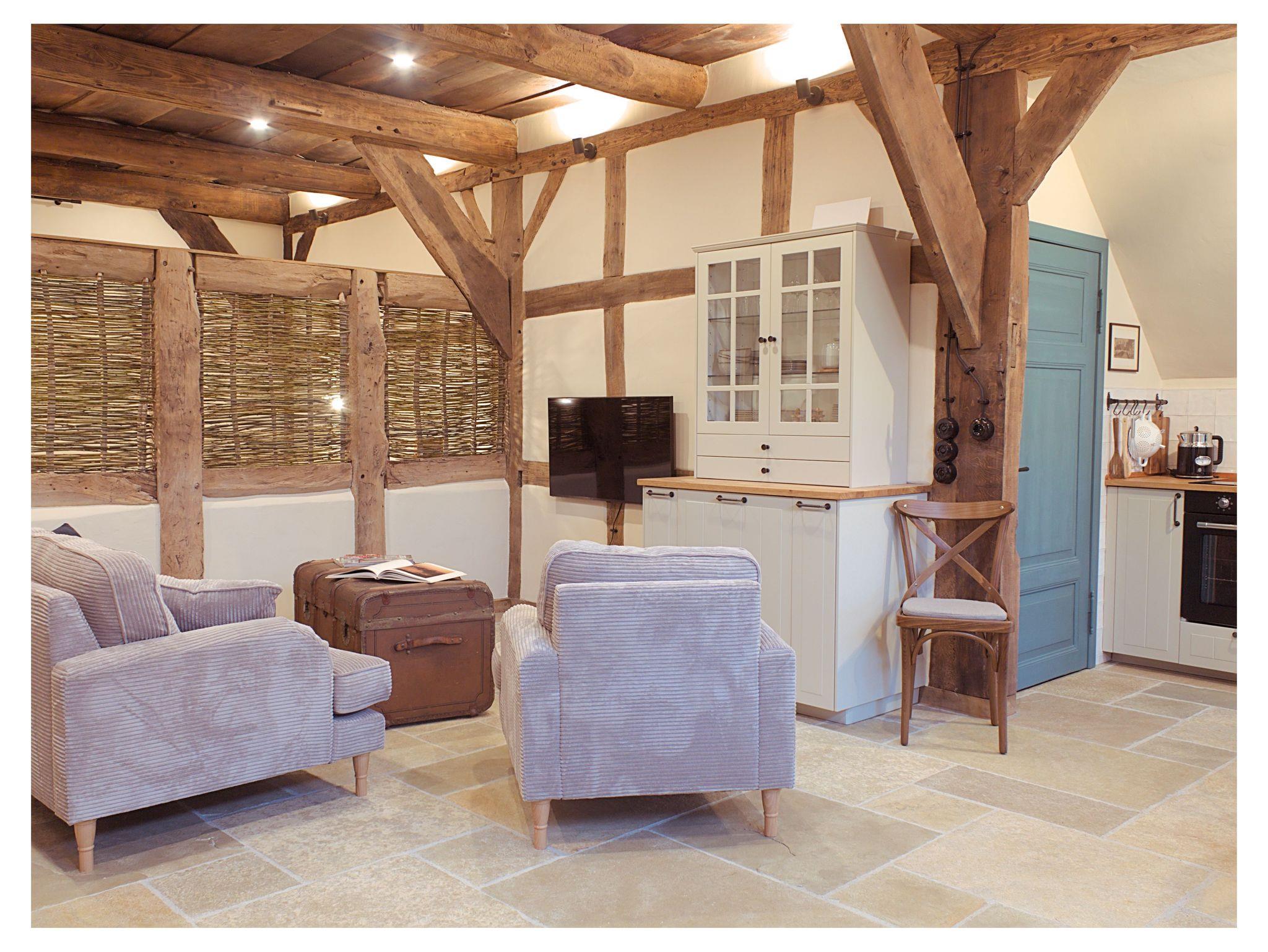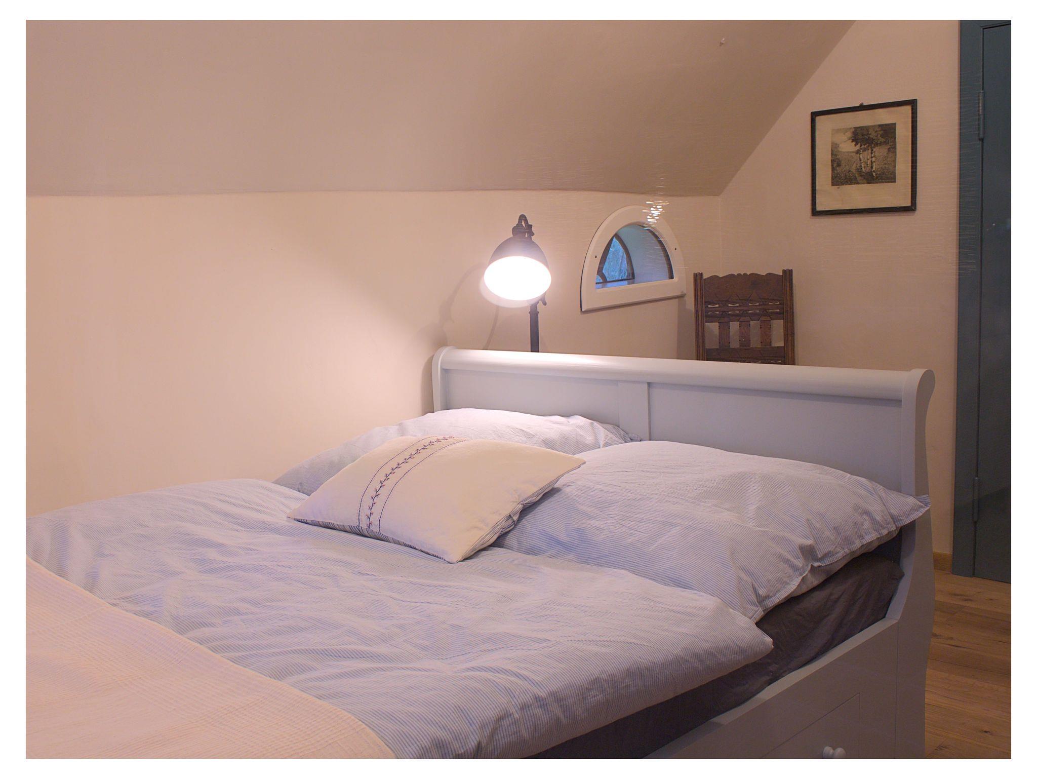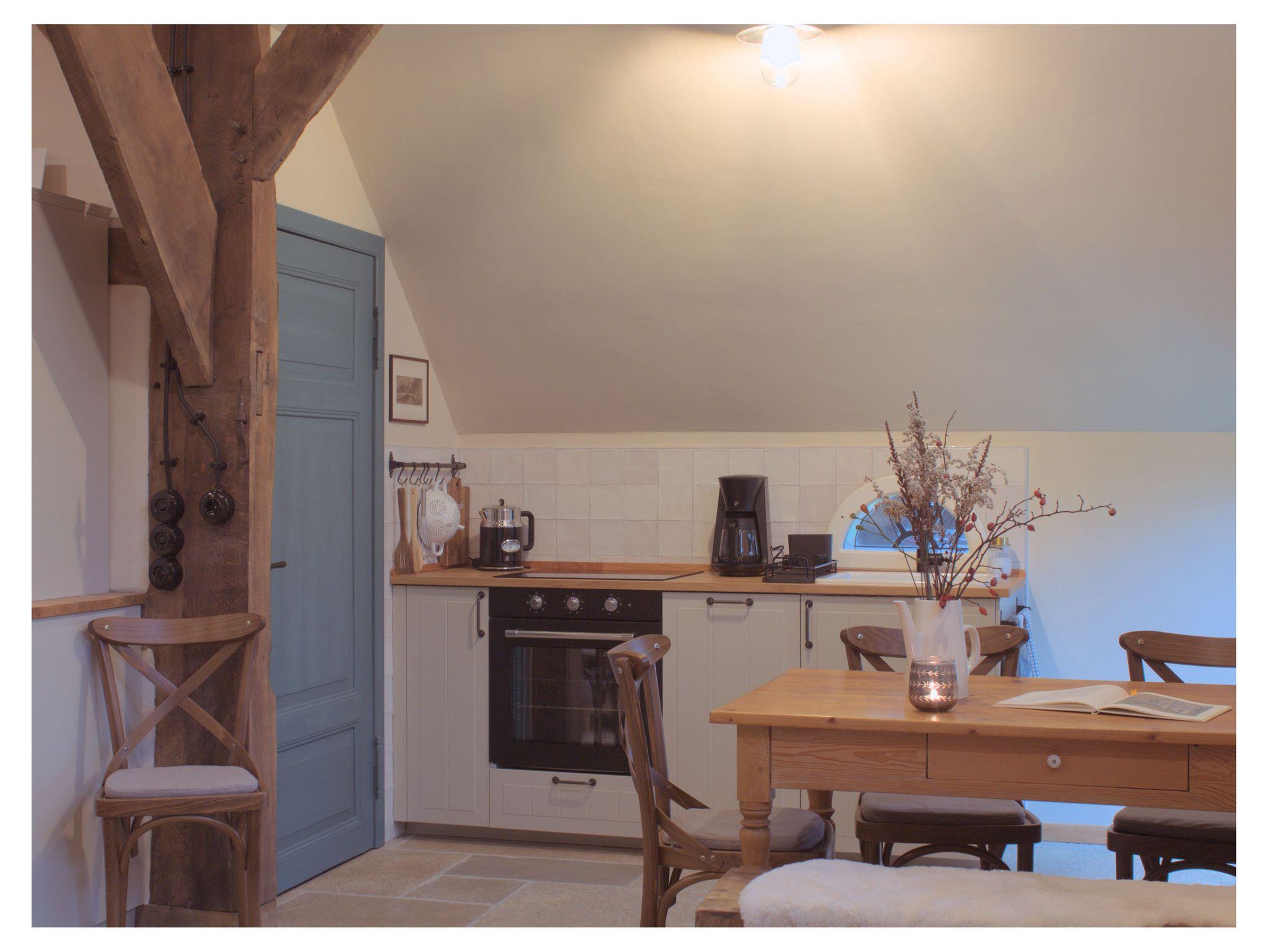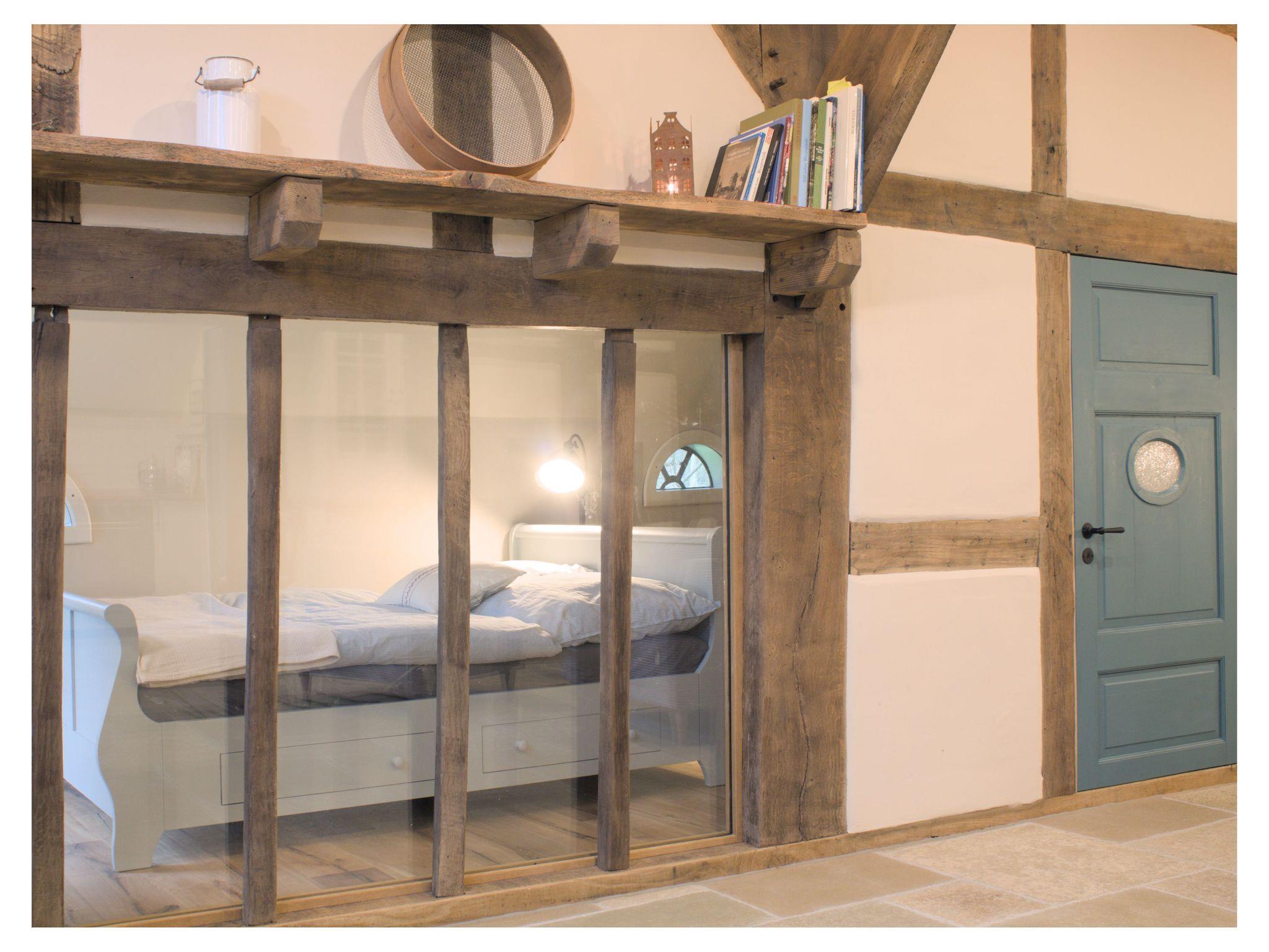 Die Wohnung verfügt über zwei Schlafbereiche: Eine gemütliche Koje mit einem 1,4 x 2 m Bett, die durch einen Vorhang hinter dem verglasten Fachwerk separiert werden kann, sowie ein Schlafzimmer mit einem 1,8 x 2 m Bett, das durch eine Fachwerkswand im Raum vom offenen Wohnbereich abgetrennt ist. Der gemütliche Wohnbereich lädt zum Entspannen ein, und die voll ausgestattete Küche bietet alles, was Sie für ein gemeinsames Kocherlebnis benötigen. Ein modernes Badezimmer mit Dusche sorgt für zusätzlichen Komfort.