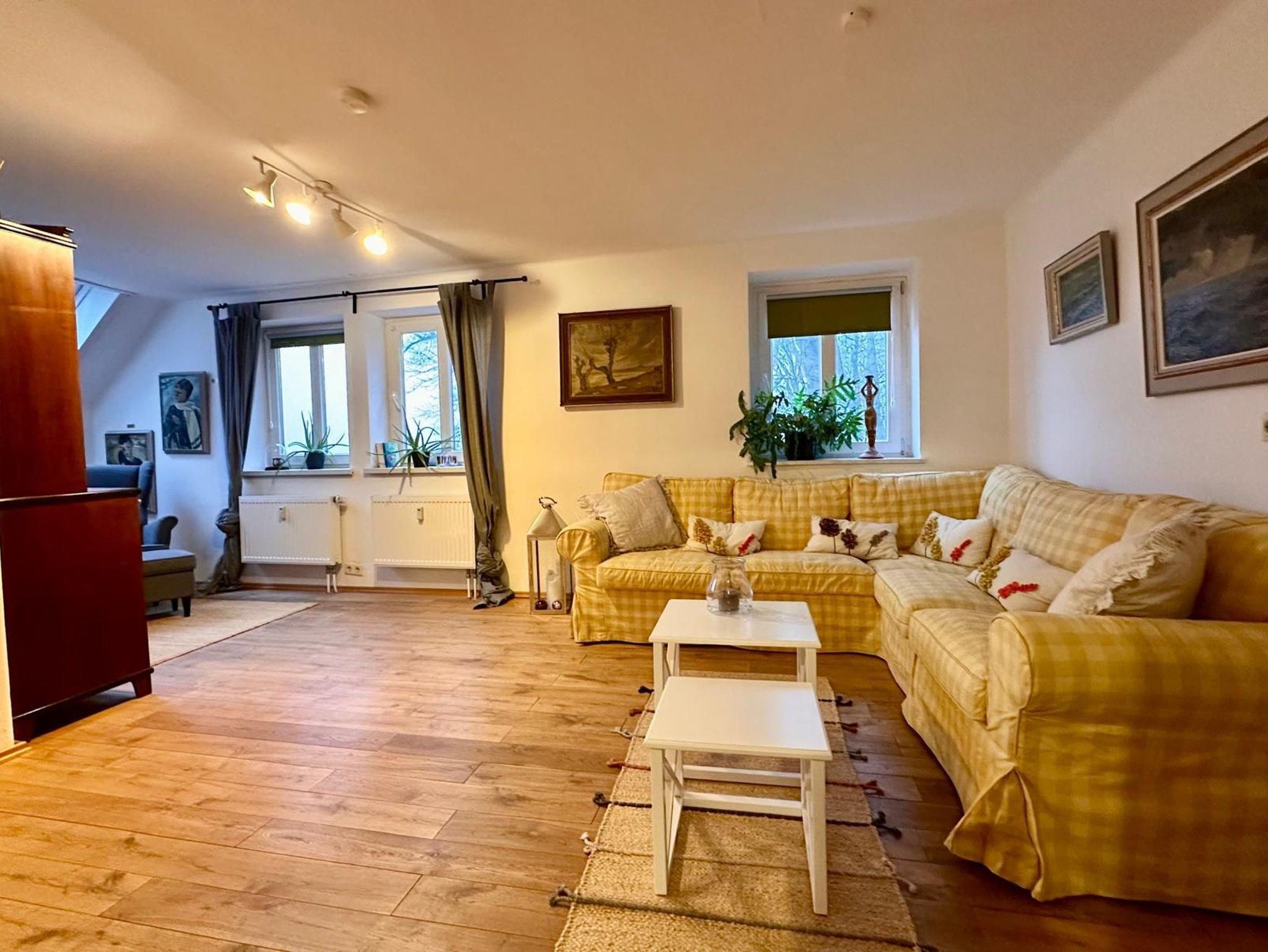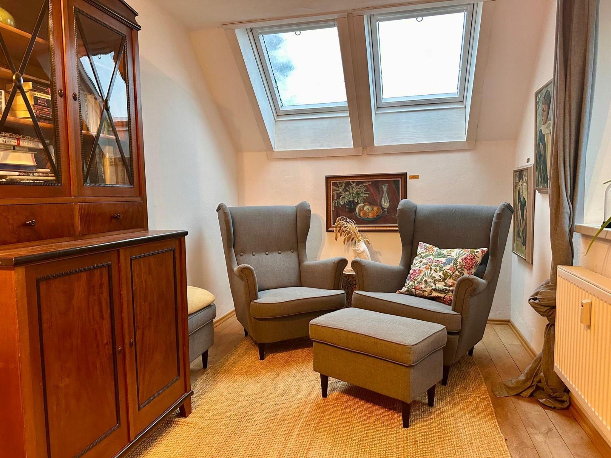 4-Zimmer-Wohnung 90 m2, Obergeschoss, komplett 2012 renoviert, komfortabel, modern und stilvoll mit Worpsweder Antiquitäten und Bildern eingerichtet: Wohnzimmer mit off. Küche Einbau (4 Kochplatten, Backofen, Geschirrspüler, Kühlschrank), mit gr. Esstisch, komplett ausgestattet, Dielenboden mit off. Lounge mit Liege, Tisch und herrlichem Blick auf Bremen. Gemütliches Schlafzimmer mit zwei sep. Betten (90 cm, Länge 200 cm), Dachfenster. Kleines Schlafzimmer mit Schlafcouch, Deckenfenster. Wohnzimmer mit Schlafcouch, Esstisch, Flachbild-TV und Stereoanlage/DVD. Dusche/WC. Ölheizung.