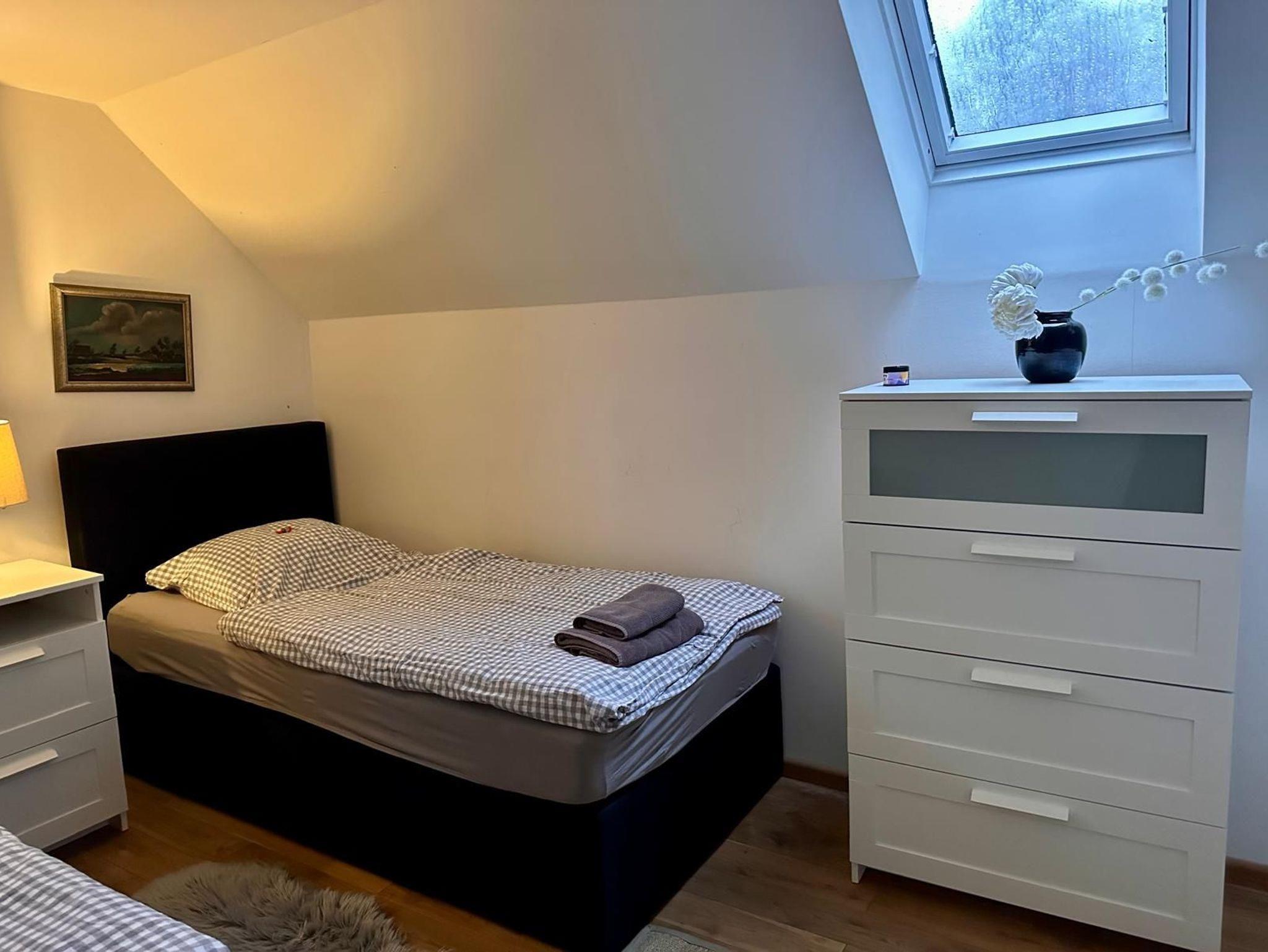 4-Zimmer-Wohnung 90 m2, Obergeschoss, komplett 2012 renoviert, komfortabel, modern und stilvoll mit Worpsweder Antiquitäten und Bildern eingerichtet: Wohnzimmer mit .Küche Einbau (4 Kochplatten, Backofen, Geschirrspüler, Kühlschrank), mit großem Esstisch, komplett ausgestattet, Dielenboden. Gemütliche Leseecke mit herrlichem Blick auf Bremen. Gemütliches Schlafzimmer mit zwei separaten. Betten (90 cm, Länge 200 cm), Dachfenster. Kleines Schlafzimmer mit Bett 1,60 m, Deckenfenster. Wohnzimmer mit Schrankbett 1,40 m , Esstisch, Flachbild-TV und Stereoanlage/DVD. Dusche/WC. Ölheizung., Waschmaschine