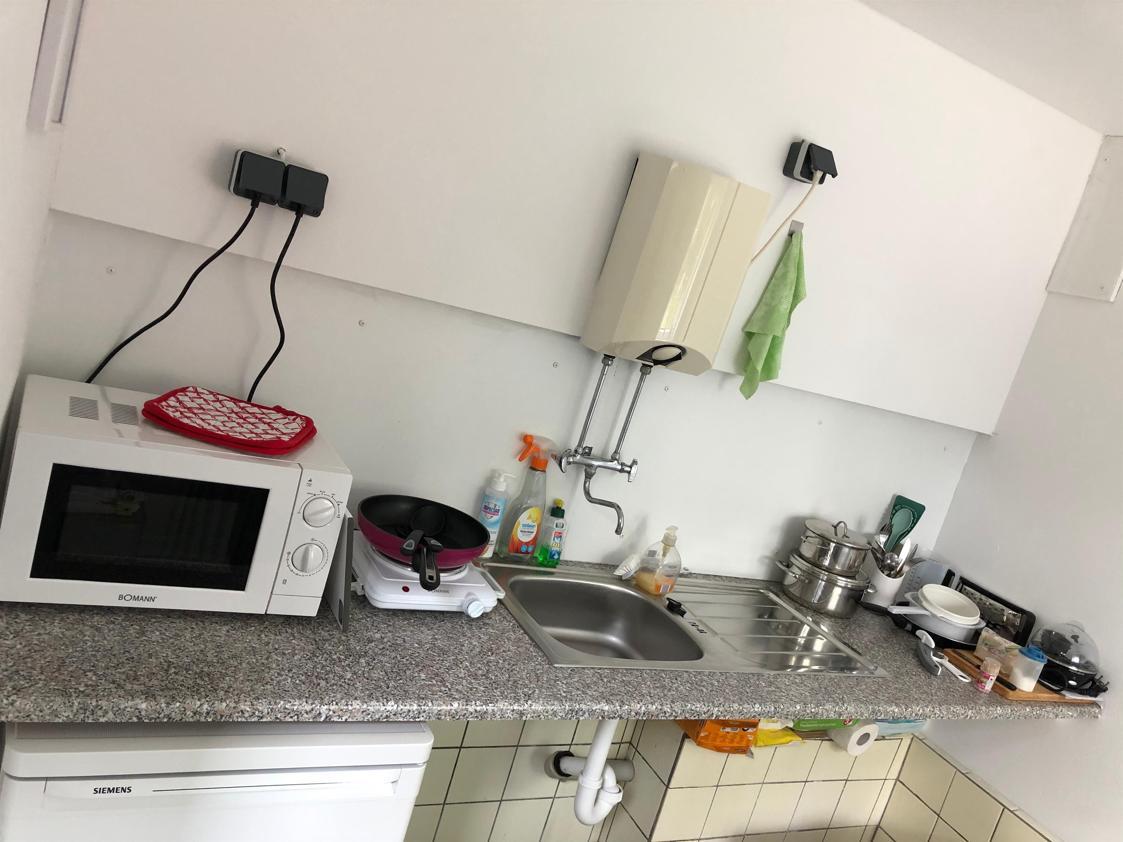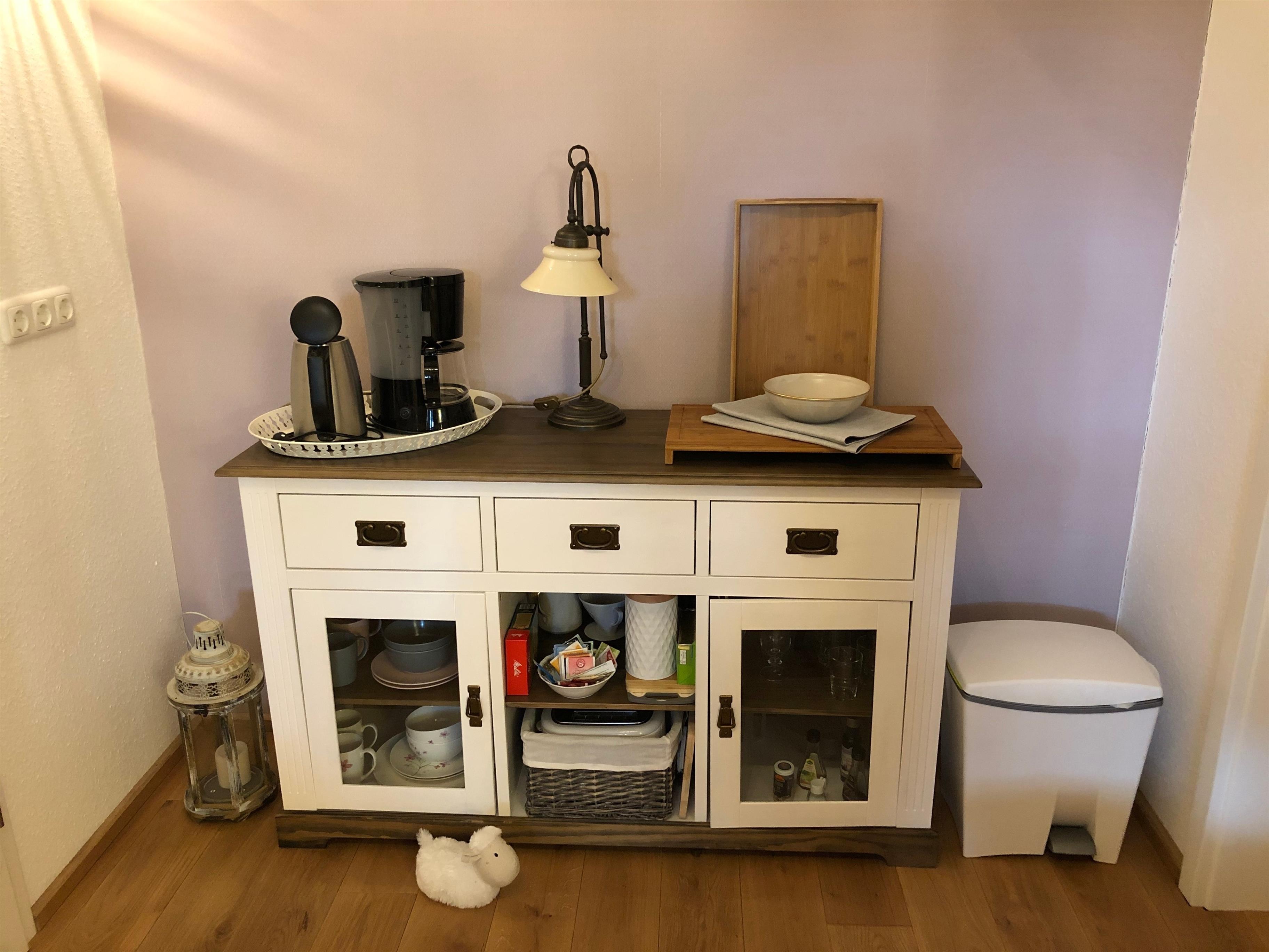 Die Vordiele darf gerne mit genutzt werden. Von dort aus zugänglich gibt es eine Gemeinschaftsküche, die man sich mit Gästen aus dem Tinyhouse-Bauwagen teilt. Dort steht ein Kühlschrank, Mikrowelle, eine Kochplatte und Spüle.