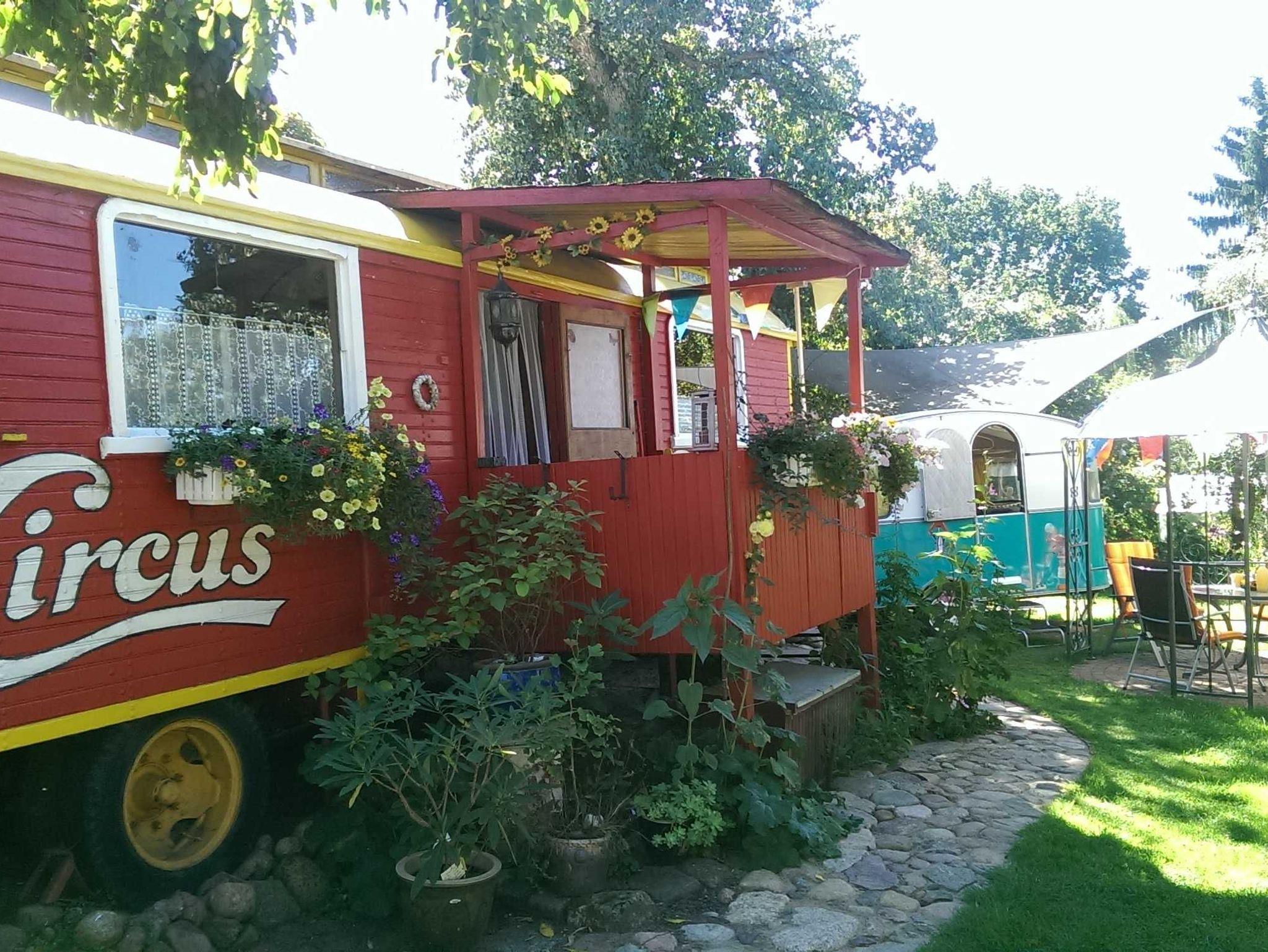 Für besondere Romantiker (2 - 4 Personen) steht ein zum Ferienhaus umgebauter nostalgischer Oberlicht - ZIRKUSWAGEN mit Holzbeplankung und auch im Innenraum mit vielen erhaltenen Original - Teilen mit auf dem Hof. Zusätzlich NEU jetzt auch für Familien mit Kindern: Schau dir den Kinder - Zirkus - Caravan an! Er hat seinen Platz neben dem großen Zirkuswagen gefunden. Schlafen unterm Sternenhimmel!