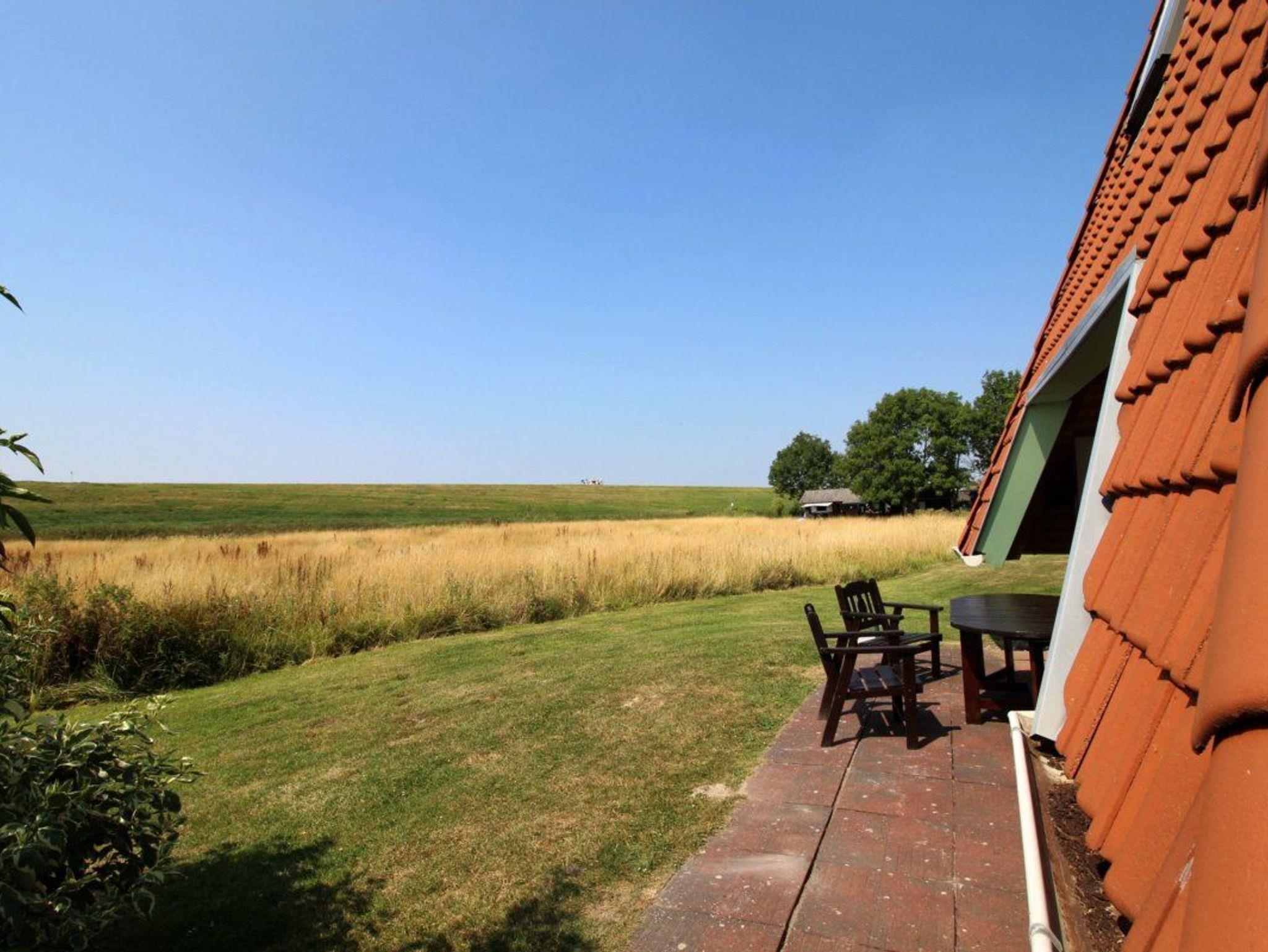 Die großzügige Terrasse mit Gartenmöbeln bietet tolle Sicht auf den Deich. Ihr Vierbeiner ist hier auch herzlich willkommen