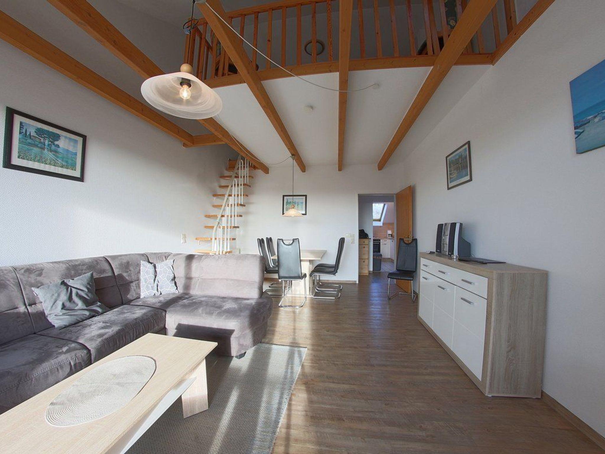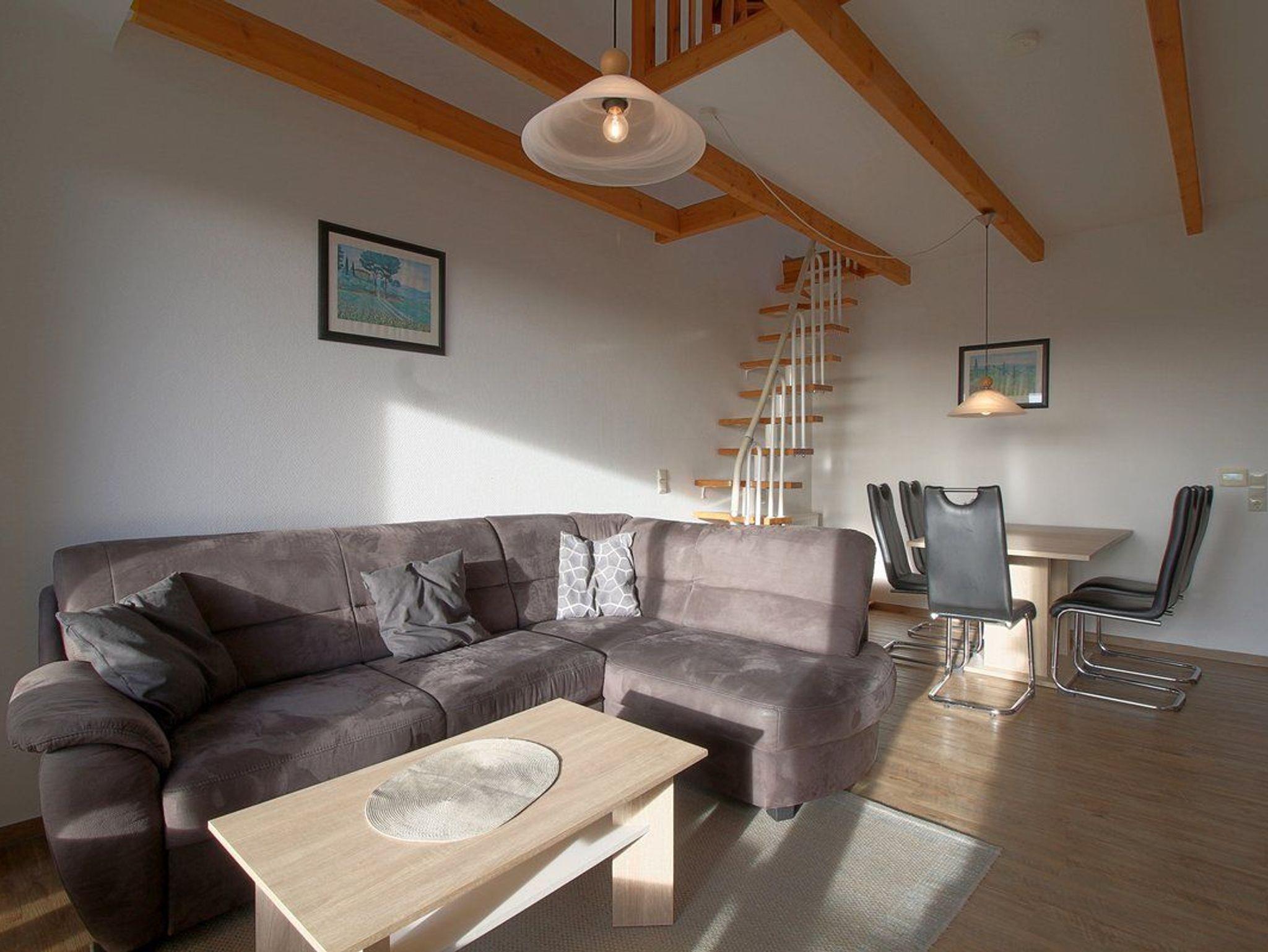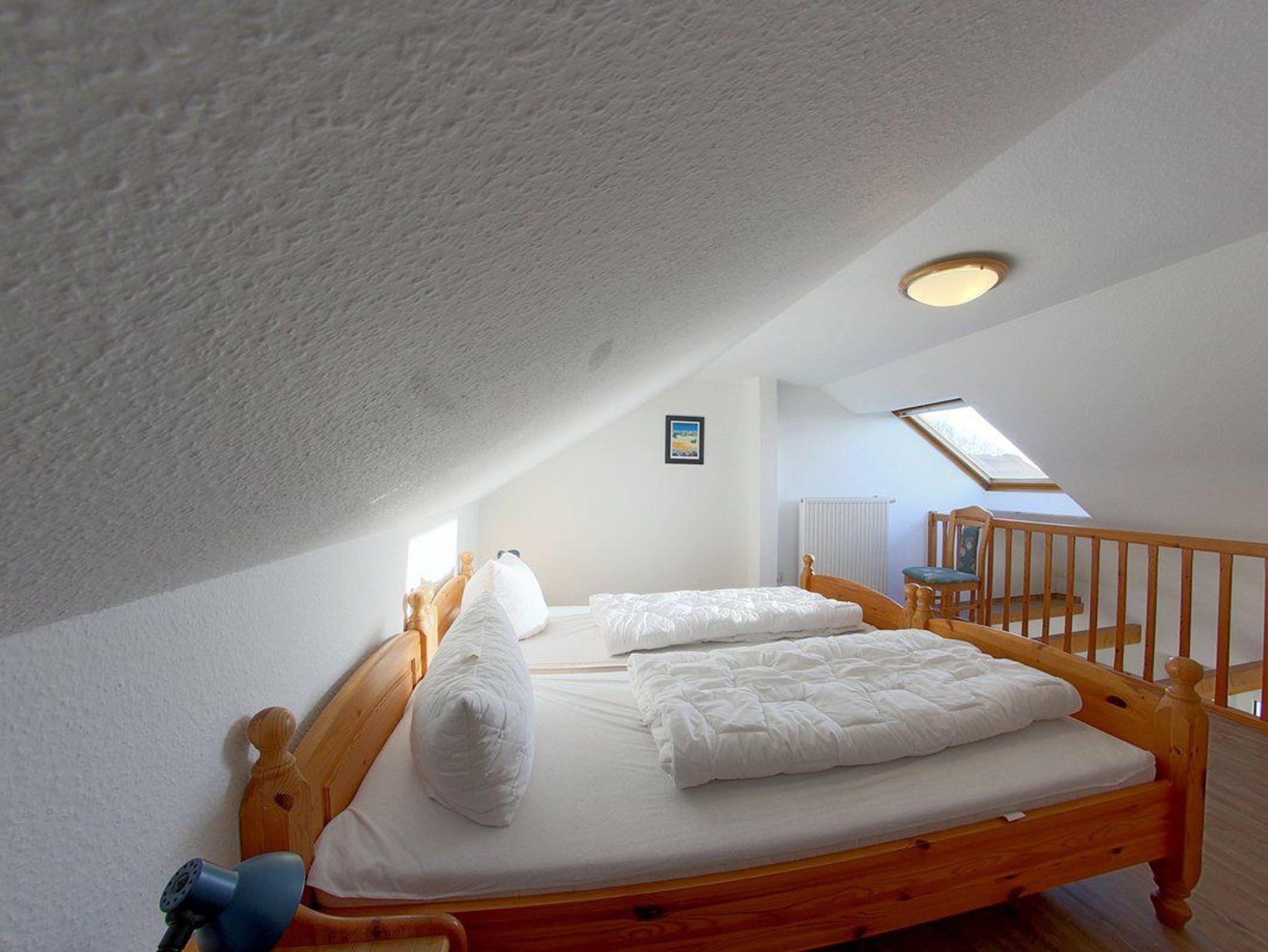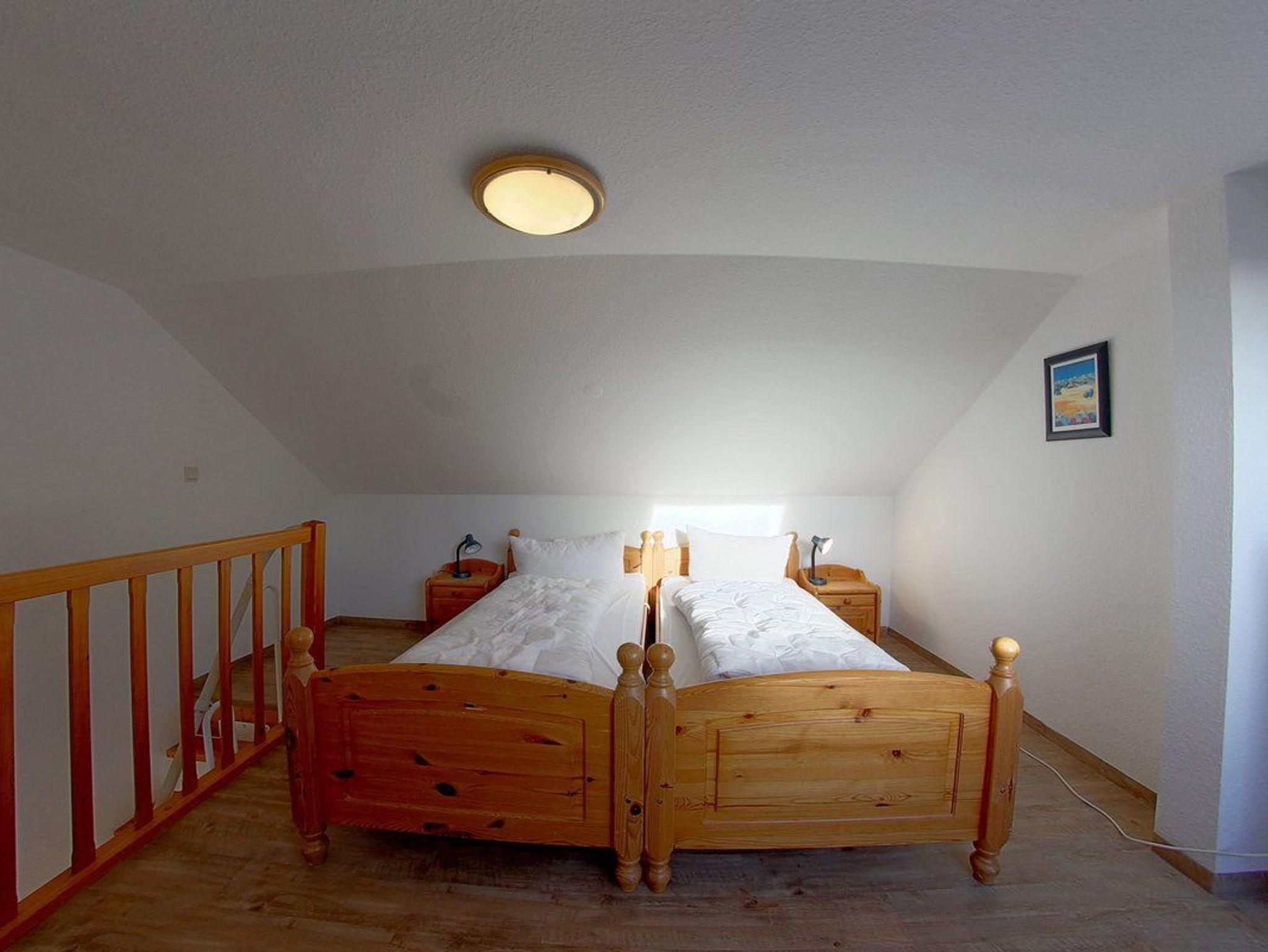 • Ein Schlafzimmer mit Doppelbett, ein weiterer offener Schlafbereich mit zwei Einzelbetten. Zusätzlich könnte eine fünfte Person auf der Schlafcouch im Wohnzimmer schlafen.