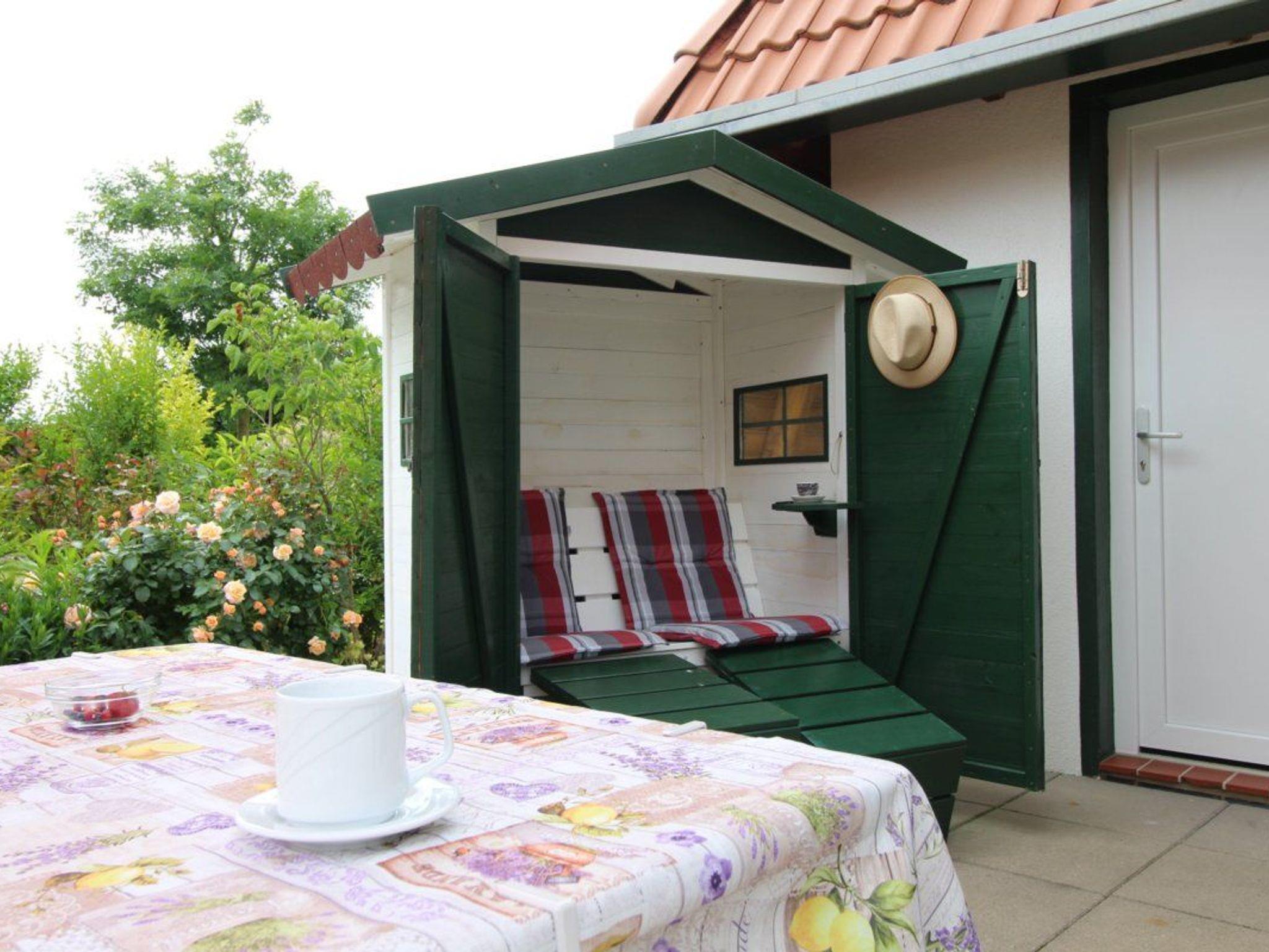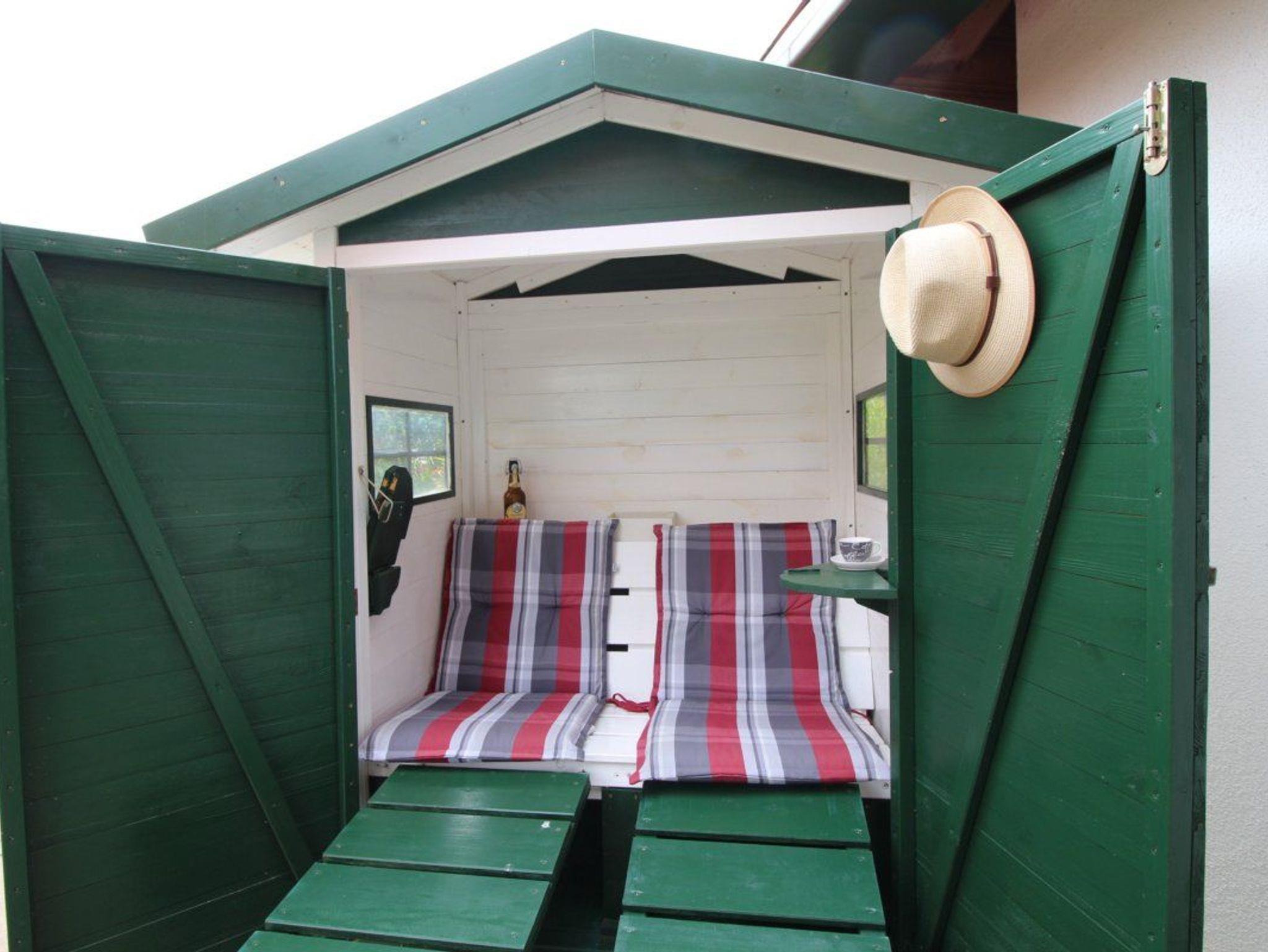 Die angrenzende Terrasse bietet einen schönen Blick in den hübsch angelegten Garten. Das sehr gelungene selbstgebaute Strandhaus lädt zu einem gemütlichen Beisammensein ein. Gartenmöbel, Sonnenliegen, Sonnenschirm und den Grill ndet man im Abstellraum. Ebenfalls im Erdgeschoss ist ein Schlafzimmer mit 1 Einzelbett (90 x 200 cm) und Kleiderschrank. Verdunklungsmöglichkeiten sind vorhanden und das moderne Tageslicht-Bad mit fast ebenerdiger Dusche und Waschmaschine liegt direkt gegenüber.