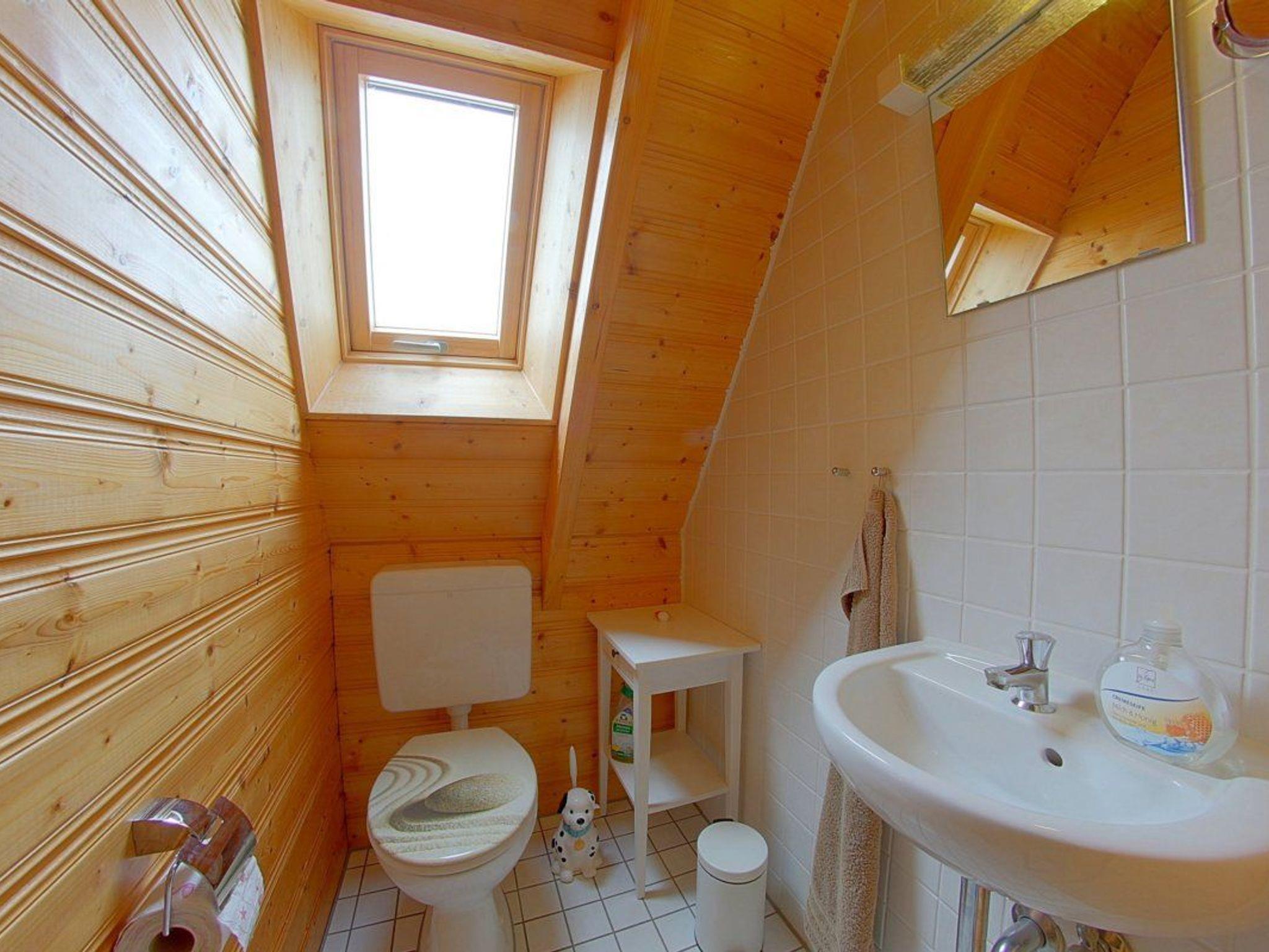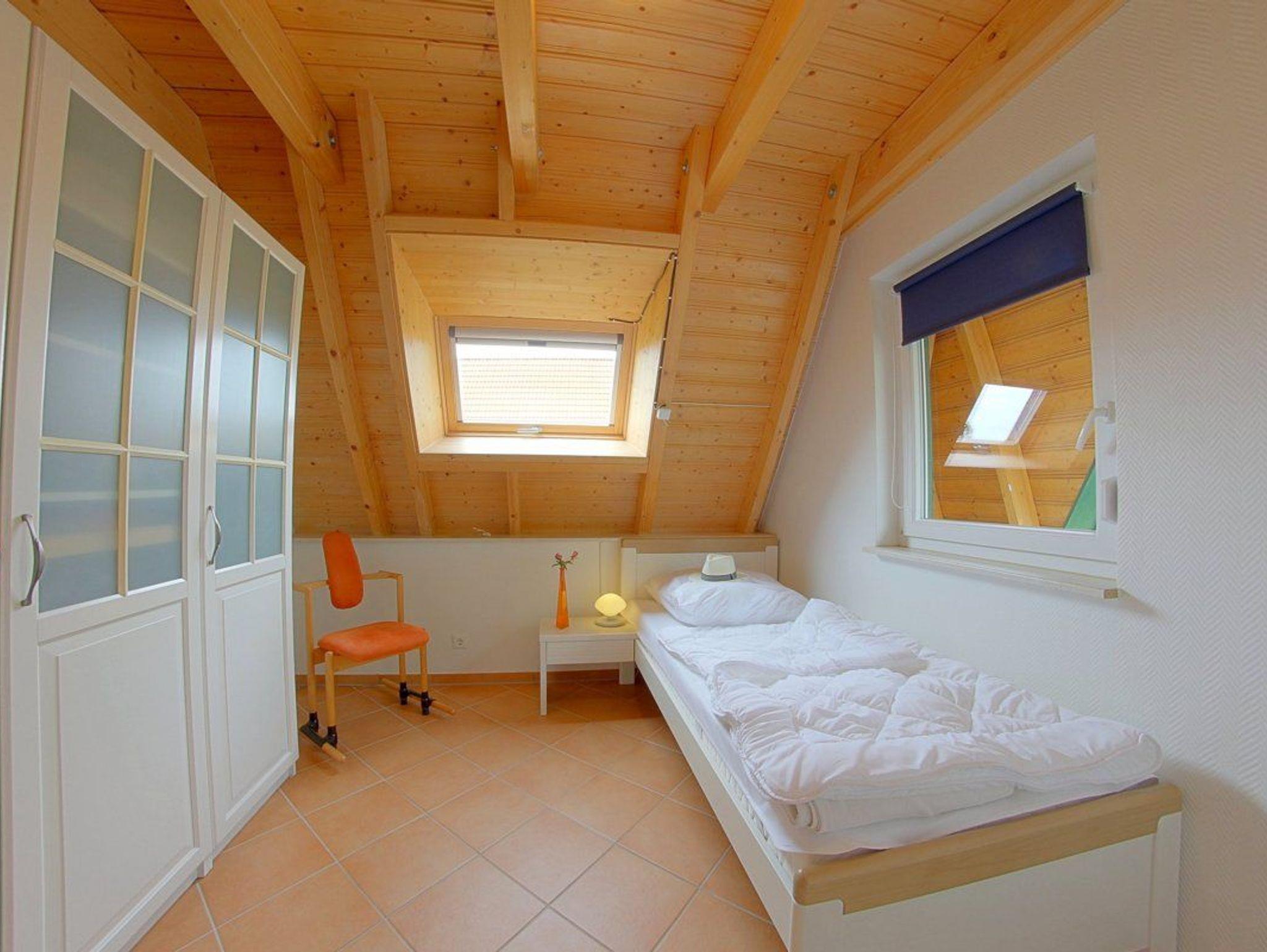 Im Obergeschoss benden sich zwei weitere Schlafzimmer und ein WC mit Waschbecken. Ein Schlafzimmer mit Doppelbett ( 180 x 200 cm ) und ein Schlafzimmer mit einem Einzelbett (90 x 200 cm) Weitere Merkmale: Reservierter Parkplatz, Treppenschutzgitter, Verdunklungsmöglichkeiten, moderne Fußböden und kostenloses WLAN. Alle Fenster inkl. Terrassenfenster haben einen Rollladen.