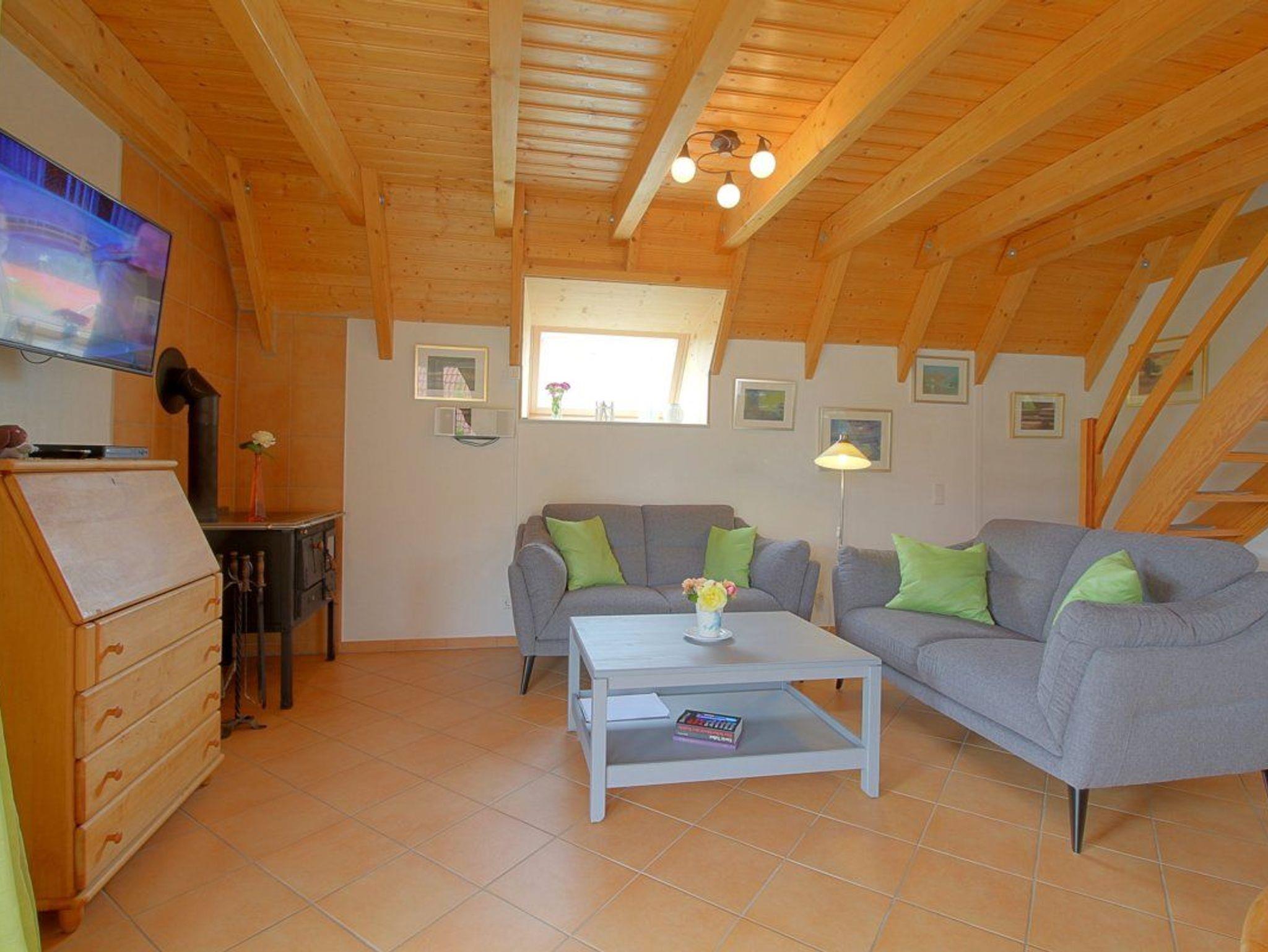 Das Erdgeschoss hat einen offenen Wohnbereich mit TV, CD, DVD, Radio und Kochkamin sowie den Essplatz mit Einbauküche (Kühlschrank, Gefrierschrank, Ceran Kochfeld, Mikrowelle, Backofen, Kaffeemaschine, Wasserkocher, Eierkocher, Toaster, Waffeleisen, Raclette-Gerät, Spülmaschine und reichlich Geschirr). Die geschmackvolle Einrichtung zieht sich durchs ganze Haus. Ein Kochherd, als Ofen zu gebrauchen, sorgt für Erinnerungen an die Ferien bei der Großmutter.