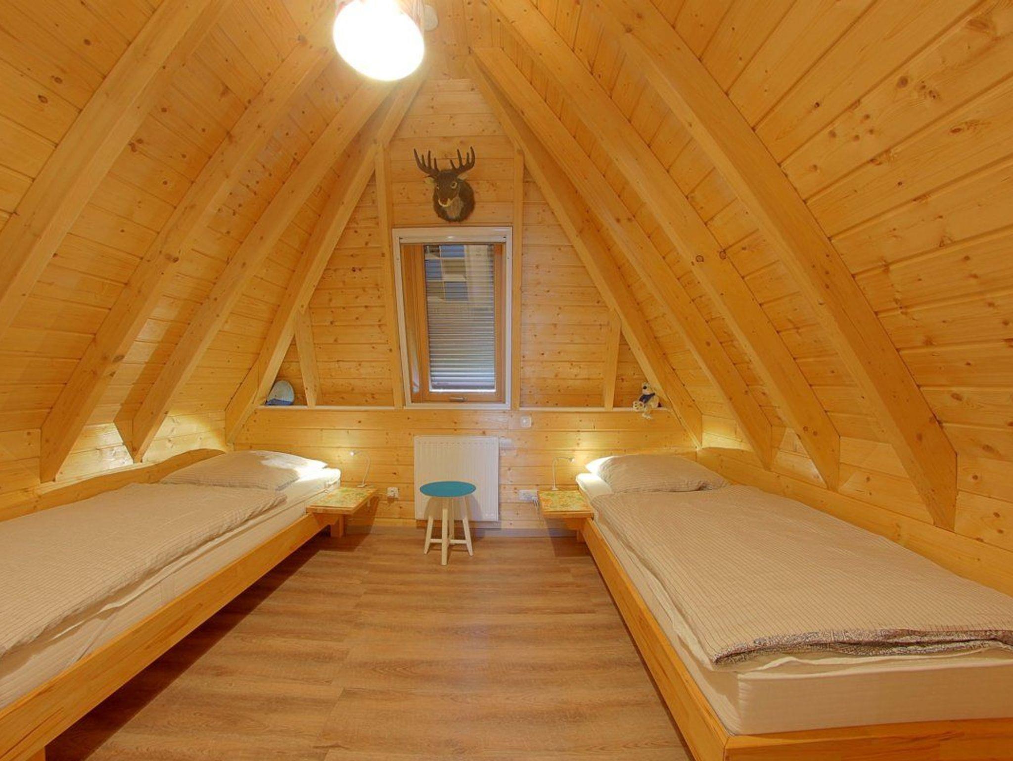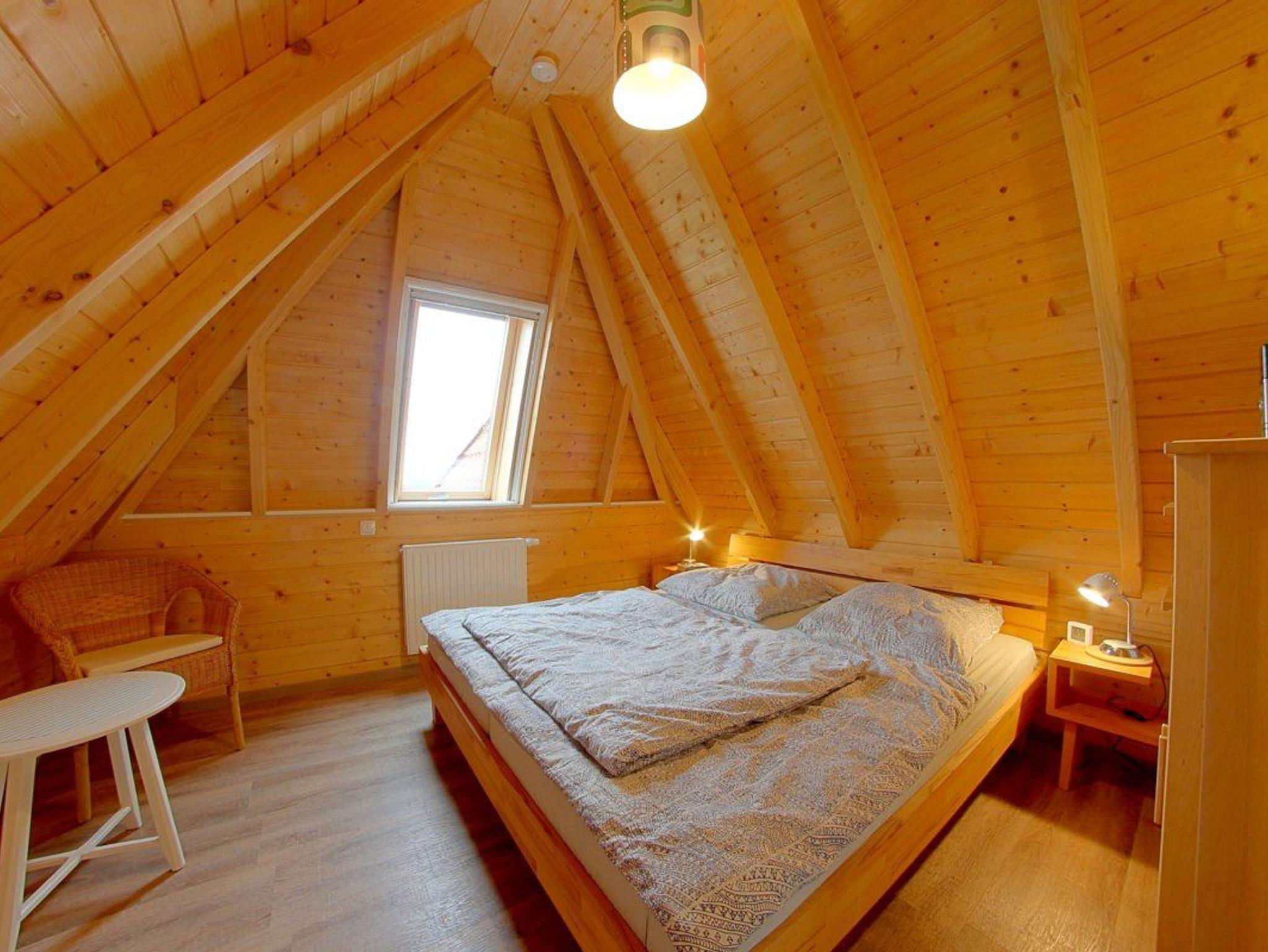 Das erste Schlafzimmer im Obergeschoss verfügt ebenfalls über ein massives Buchenholzbett (180 x 200 cm), 5-Reflex-Zonen-Lattenroste und Matratzen sowie zwei Nachtschränke mit ausreichend Beleuchtung. Ein Korbsessel und ein kleiner Tisch runden das Bild ab. In diesem Raum ist auch noch Platz für das Reisekinderbett