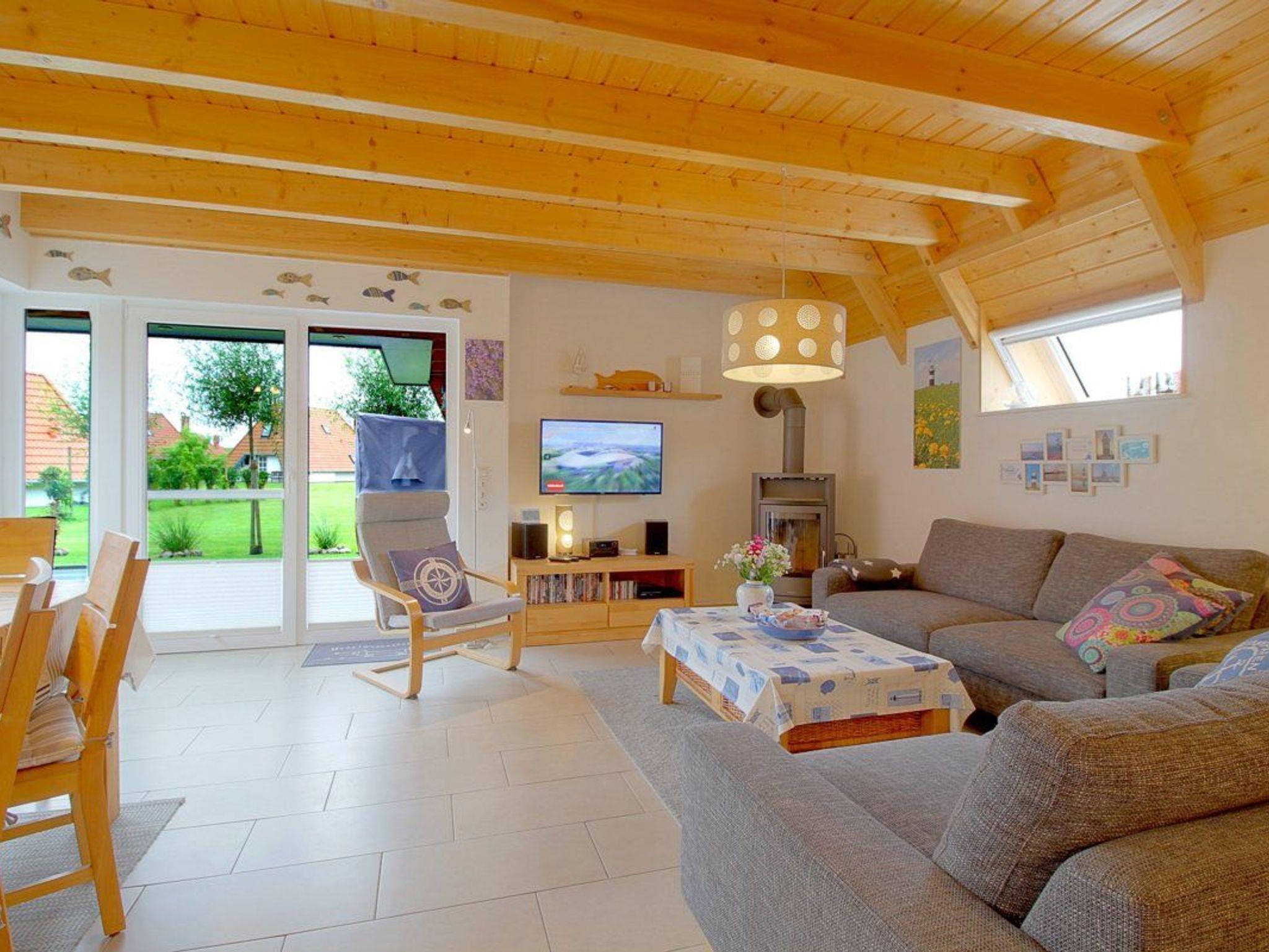 Den Mittelpunkt des ?Ferienhaus Wiesenpieper? bildet der helle und großzügig gestaltete Wohn-/Ess-/Kochbereich. Von hier gelangen Sie auch direkt zur großen Süd-West-Terrasse (25 qm) und in den schönen Garten. Hier fühlt sich die gesamte Familie rundherum wohl. Die Holzdecken und die großen, bodentiefen Fensterelemente bilden die Grundlage für eine angenehme Wohnatmosphäre.