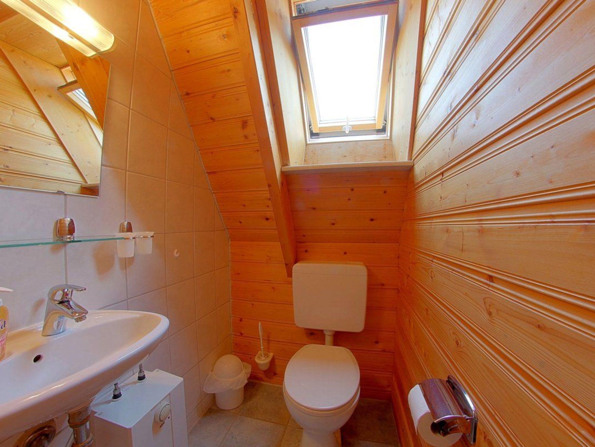 Im Obergeschoss befinden sich ein Schlafzimmer und ein Kinderschlafzimmer mit je zwei Betten und eine kleine Toilette. Im größeren Zimmer kann ein Kinderbett optional hinzugestellt werden.