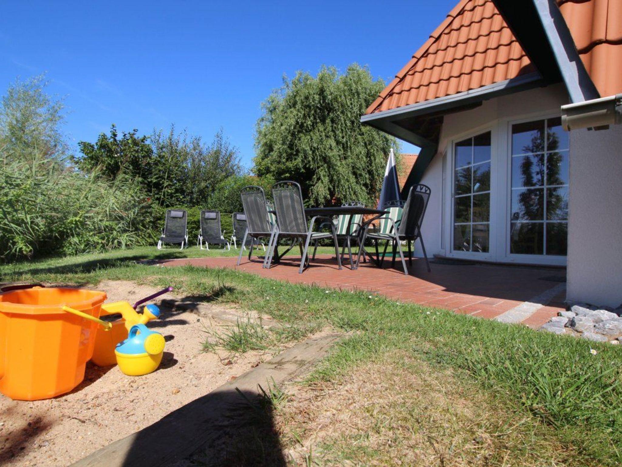 Auf der Terrasse mit Gartenmöbeln, Sonnenliegen und sogar einem Sankasten können Sie den freien Blick auf den Deich genießen