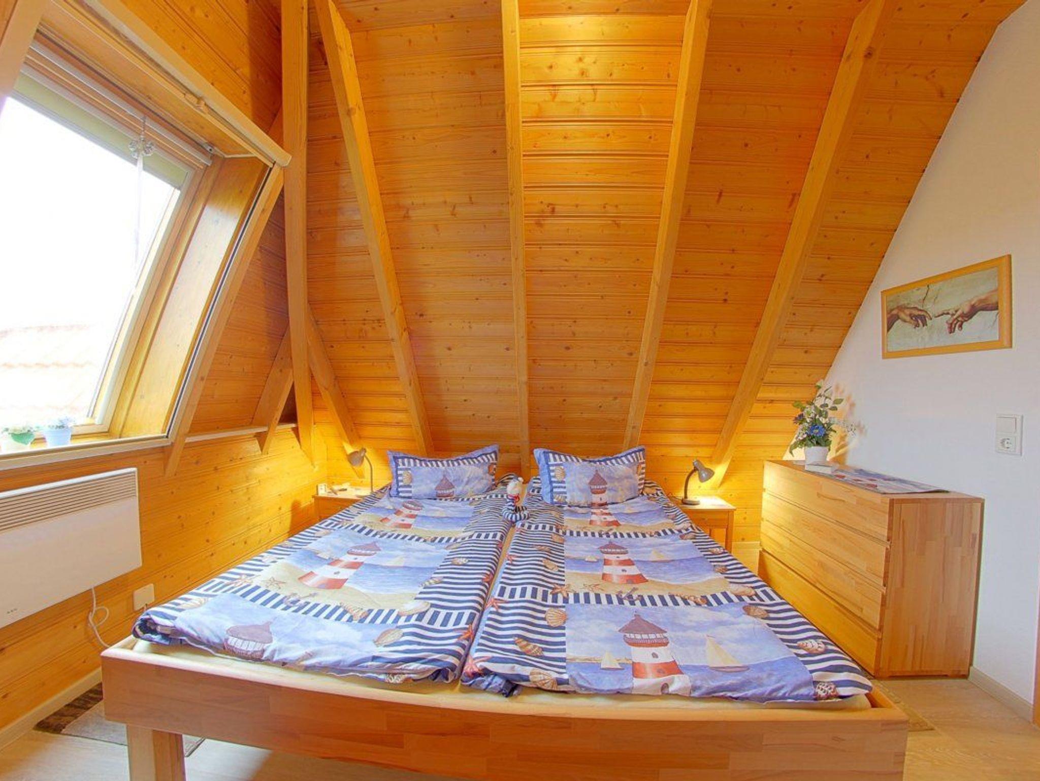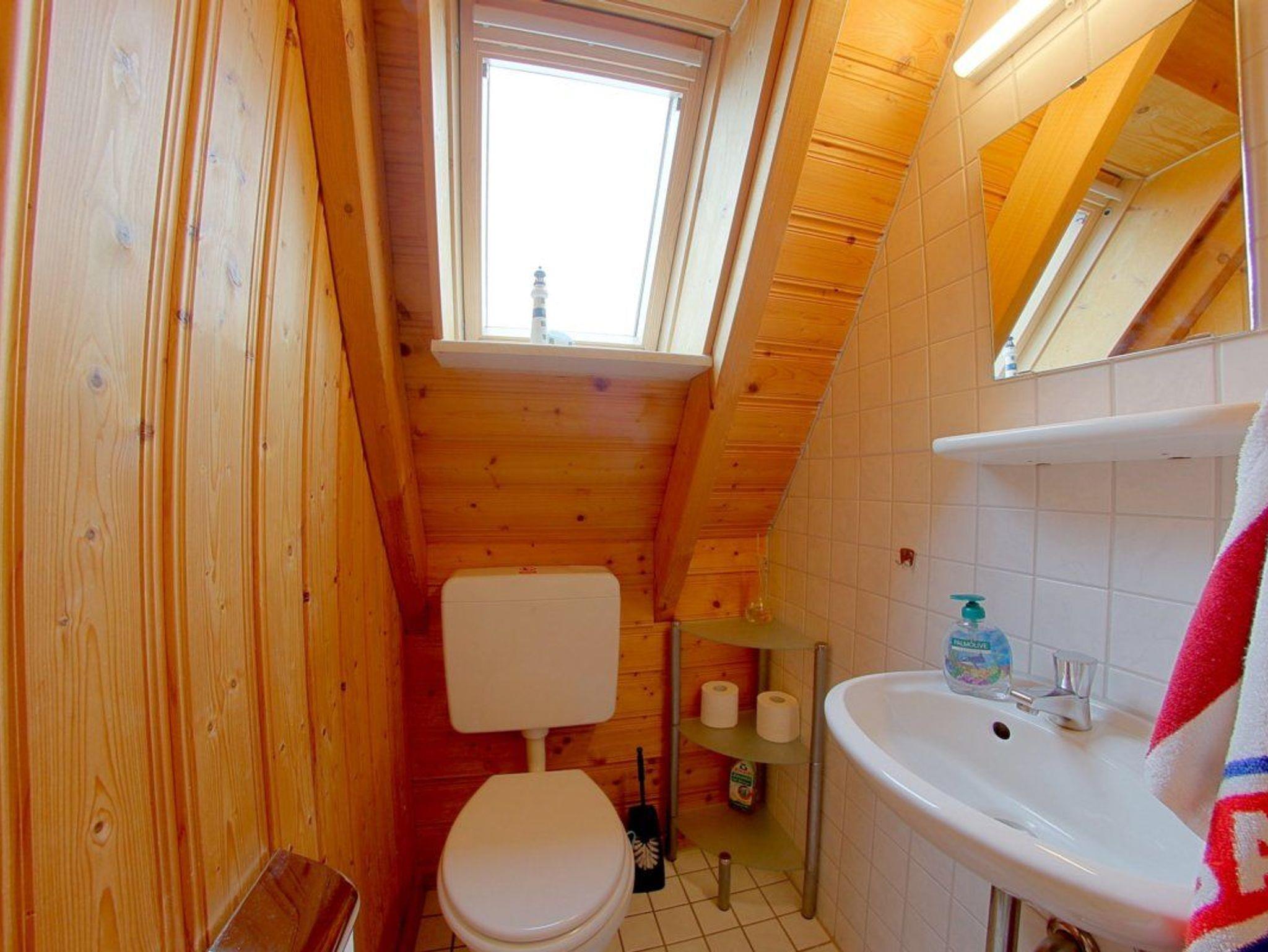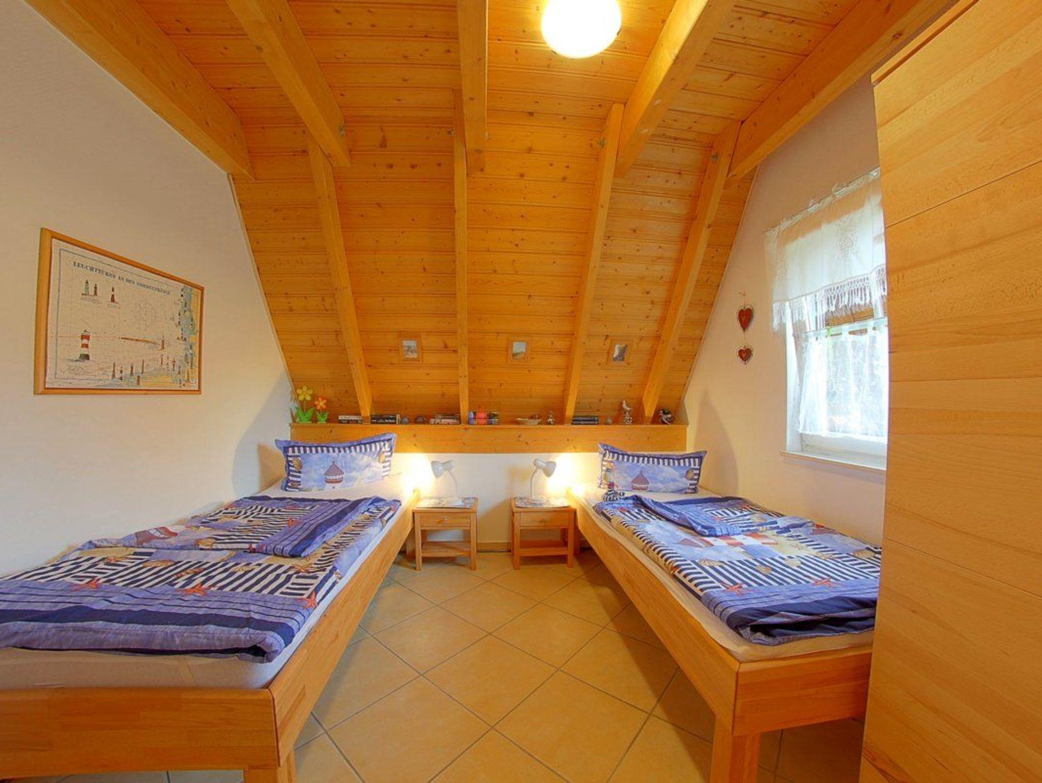 Im Obergeschoss sind zwei Schlafzimmer, eins mit Doppelbett und TV und eins mit 2 Einzelbetten, sowie eine Toilette mit Waschbecken. Beide Schlafzimmer mit Vinyl-Designbelag.
