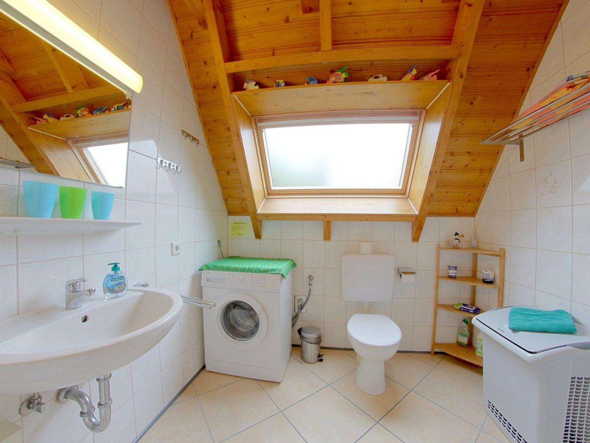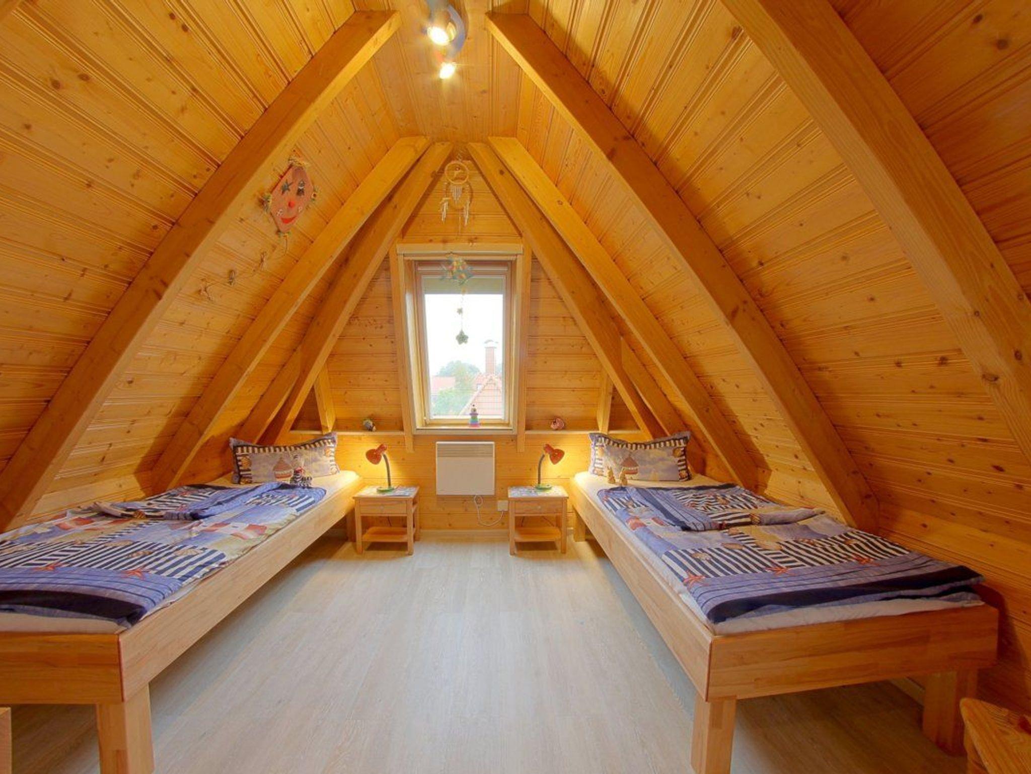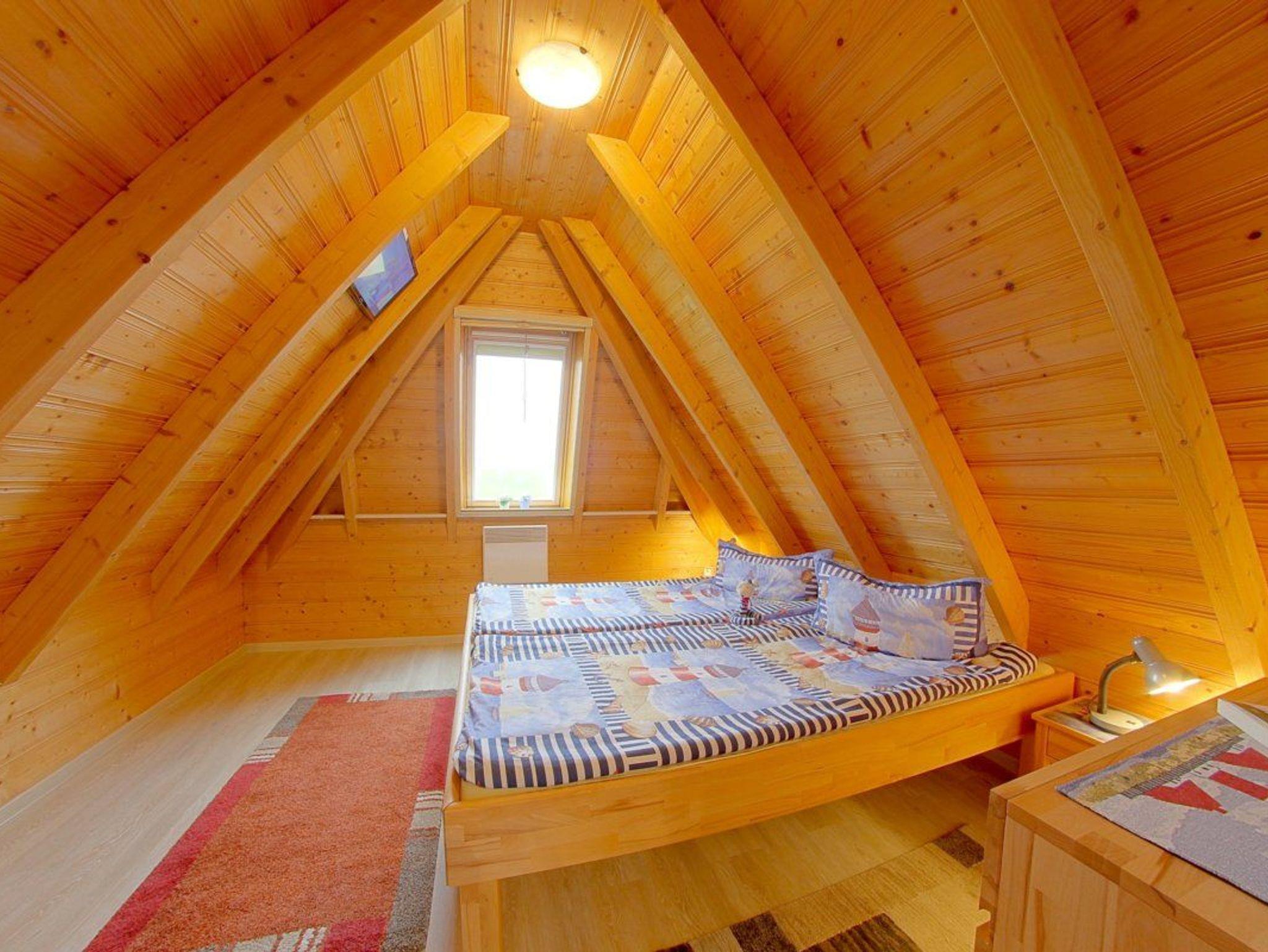 Im Obergeschoss sind zwei Schlafzimmer, eins mit Doppelbett und TV und eins mit 2 Einzelbetten, sowie eine Toilette mit Waschbecken. Beide Schlafzimmer mit Vinyl-Designbelag.