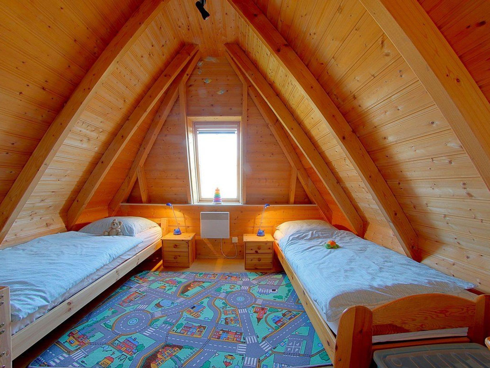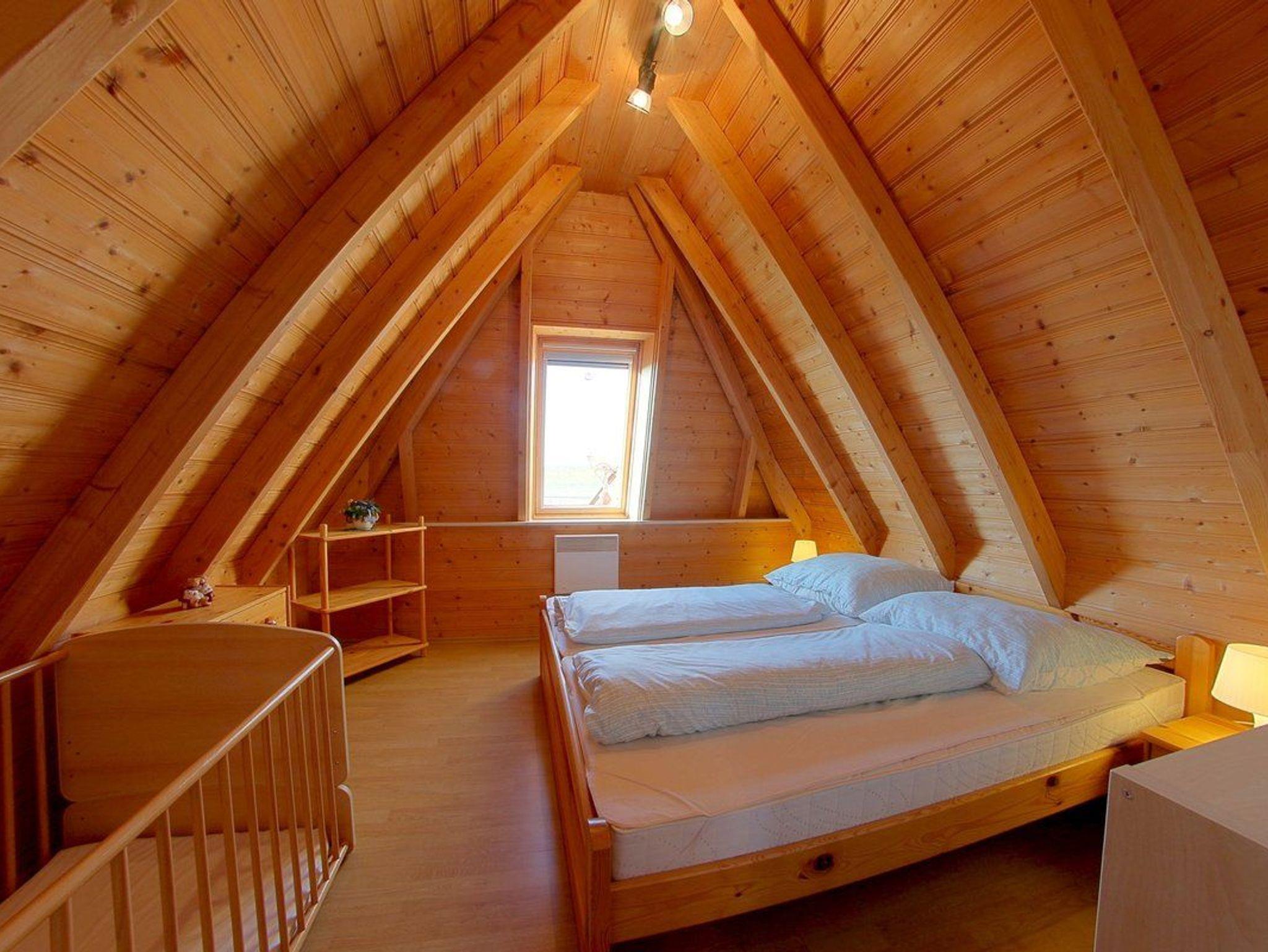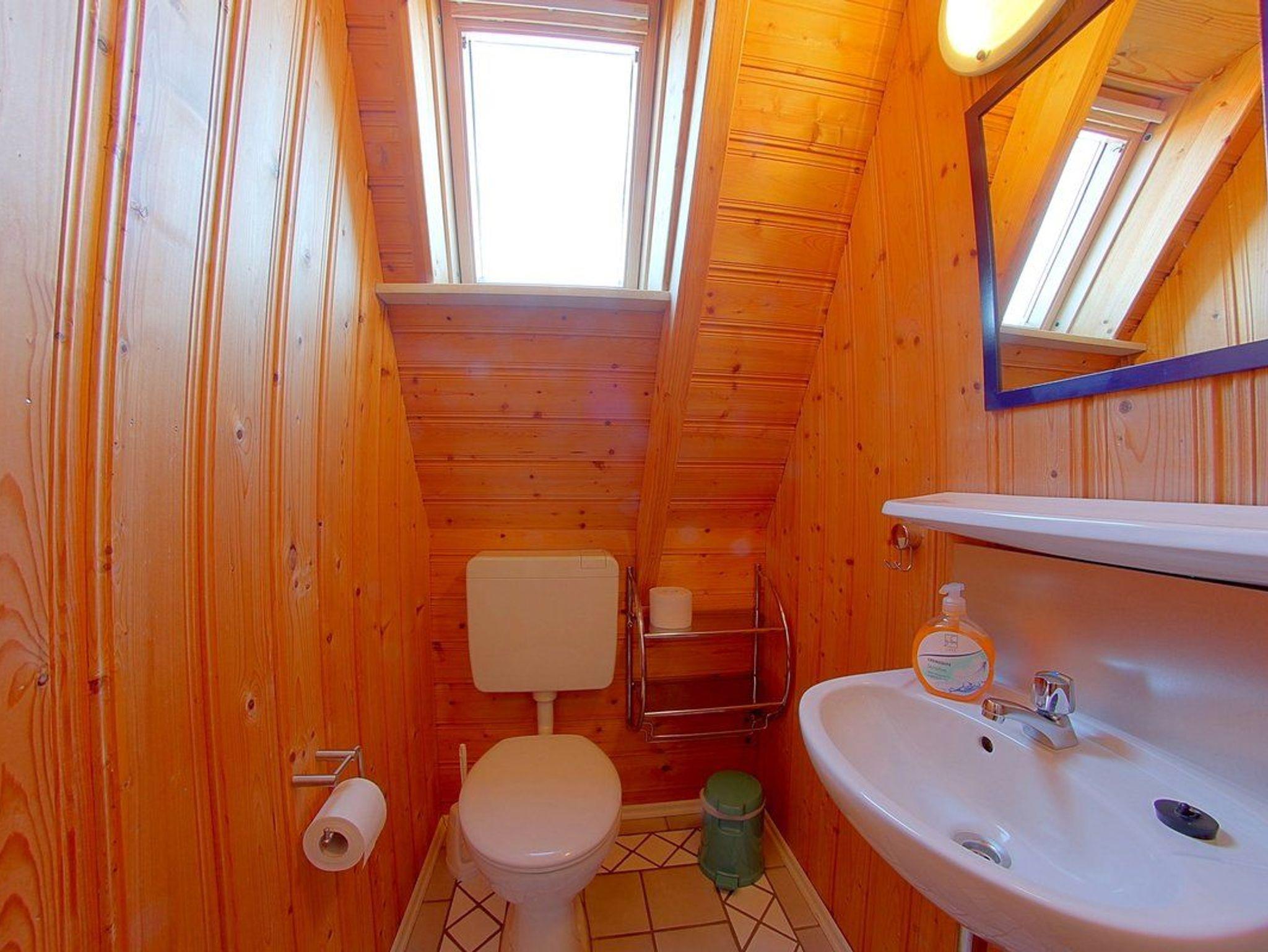 Im Obergeschoss befinden sich zwei weitere Schlafzimmer und ein WC mit Waschbecken. Ein Schlafzimmer mit Doppelbett, und Babybett für ein Kleinkind und ein weiteres Schlafzimmer mit 2 Einzelbetten. Ein Babyreisebett steht außerdem noch zur Verfügung. Rollos zur Verdunkelung gehören zum Komfort.
