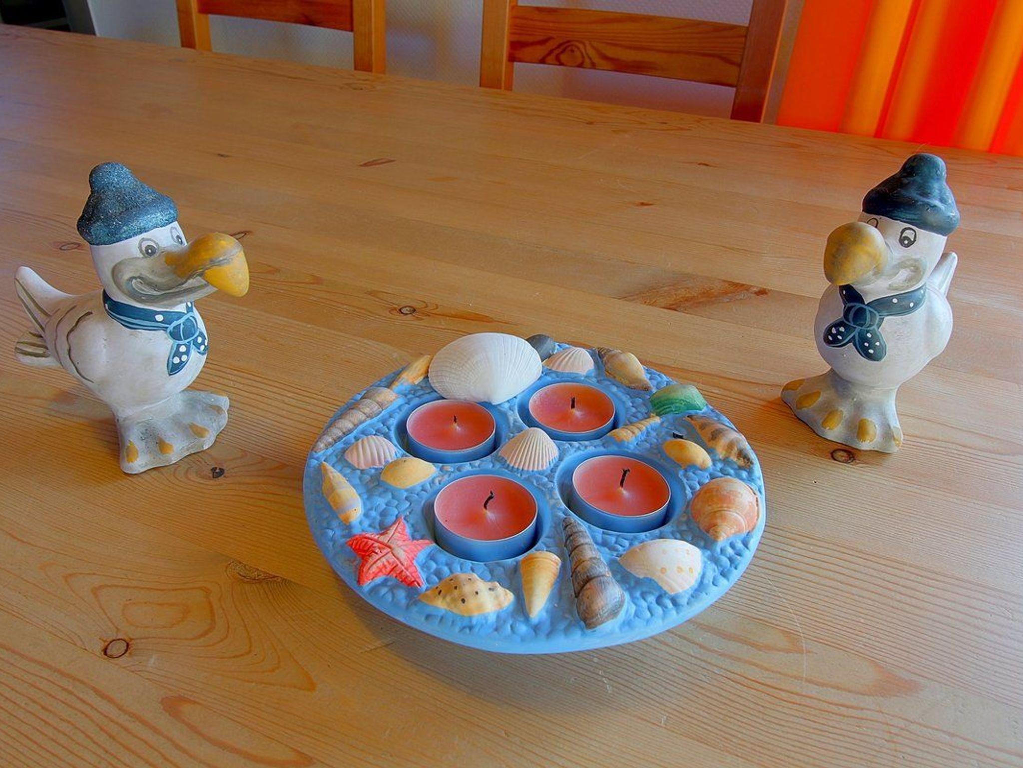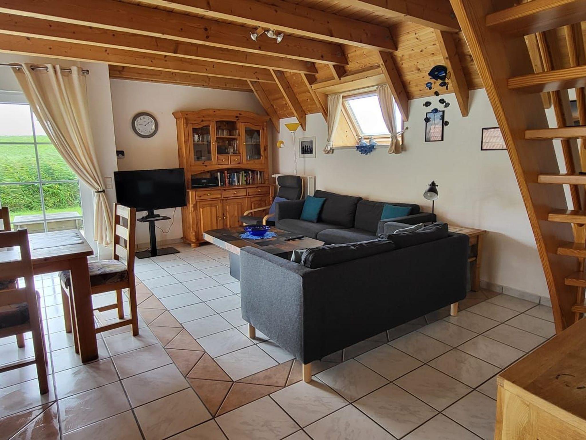 Im komplett gefliesten Wohnbereich gibt es einen offenen Wohnbereich mit Flat-TV, Essplatz und Küche mit komplett ausgestatteter Einbauküche mit Geschirrspüler, in der es an nichts fehlt. Vom Wohnraum aus geht es auf die sonnige Terrasse mit Abstellraum und Gartenmöbeln und tollem Blick auf den Deich.