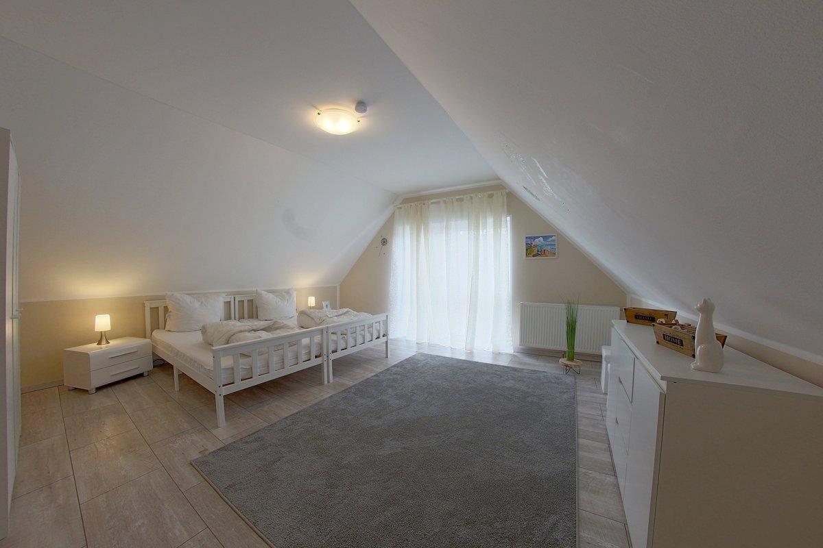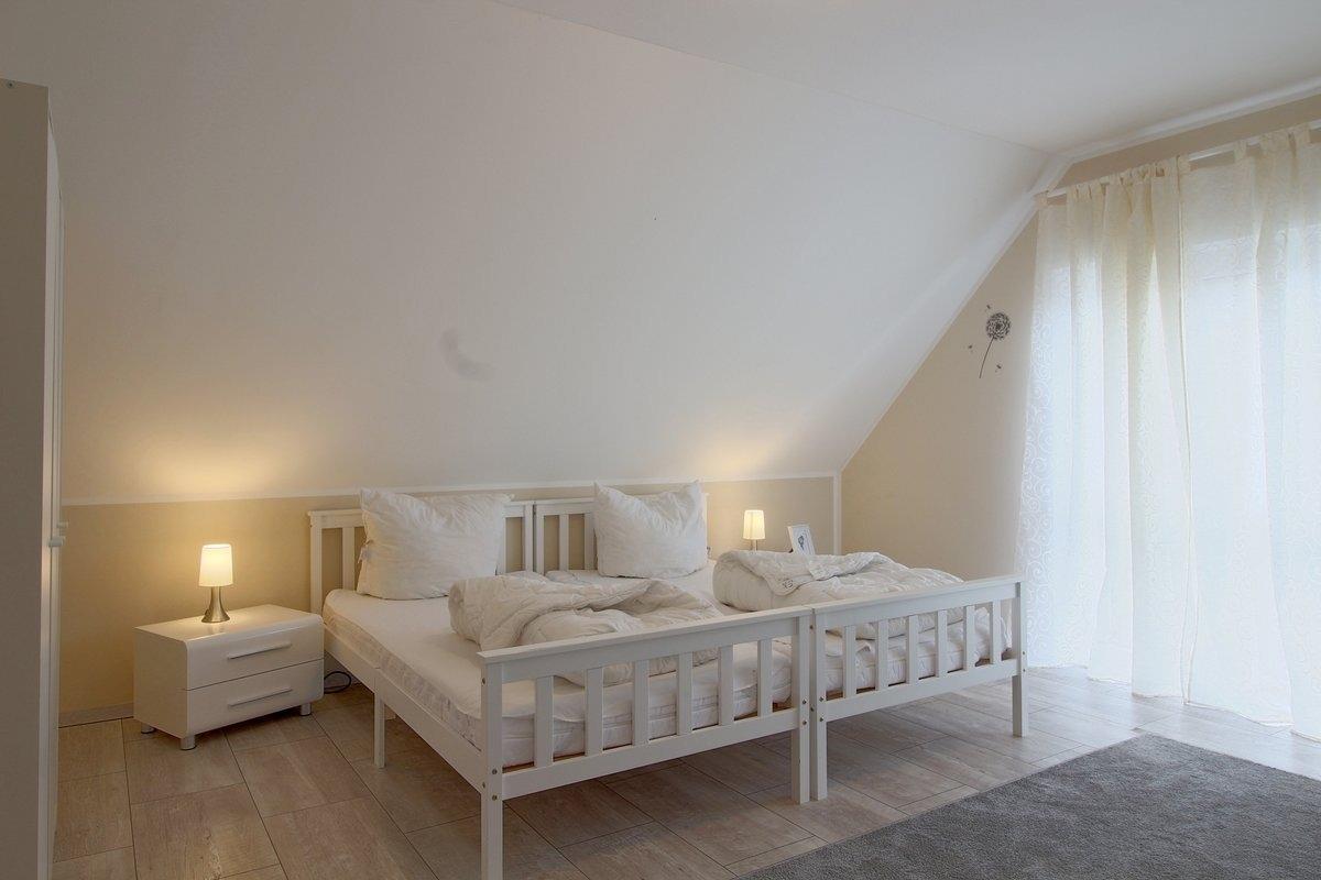 Im Obergeschoss befinden sich zwei geräumige Schlafzimmer und ein WC mit Waschbecken. Ein Schlafzimmer mit Doppelbett und Babyreisebett für ein Kleinkind und ein weiteres Schlafzimmer mit 2 Einzelbetten