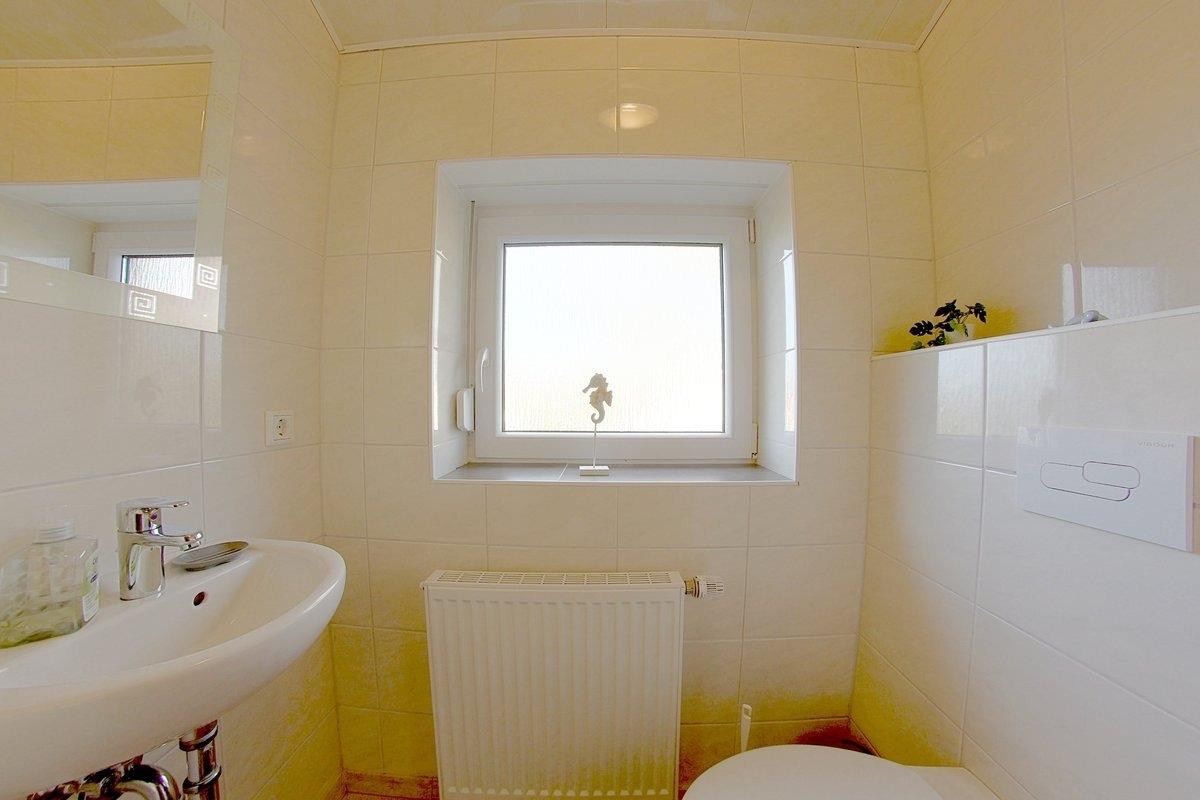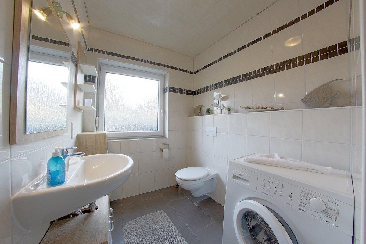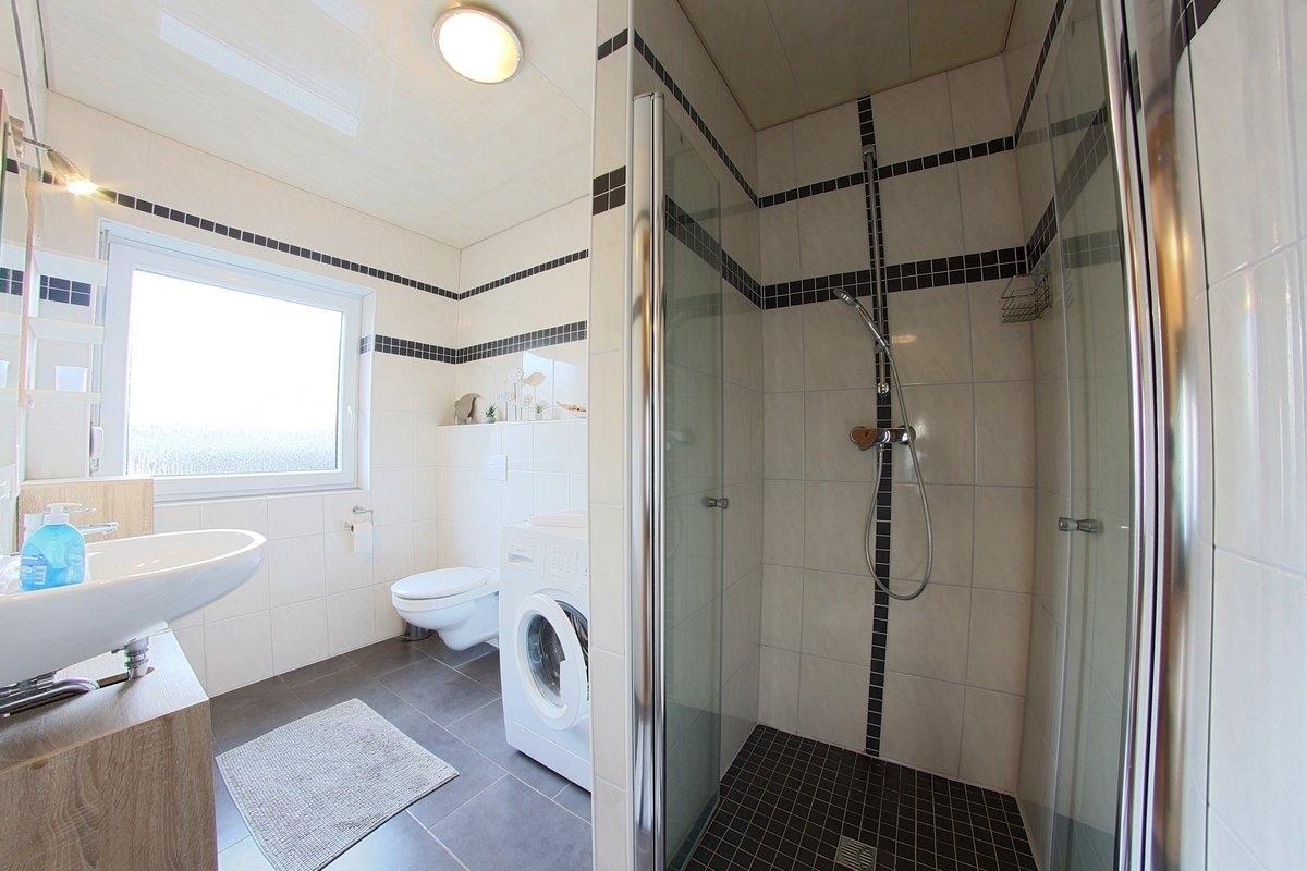 Im Erdgeschoss befindet sich das helle Duschbad mit bodengleicher Dusche und Waschmaschine, im Obergeschoss ein weiteres WC.