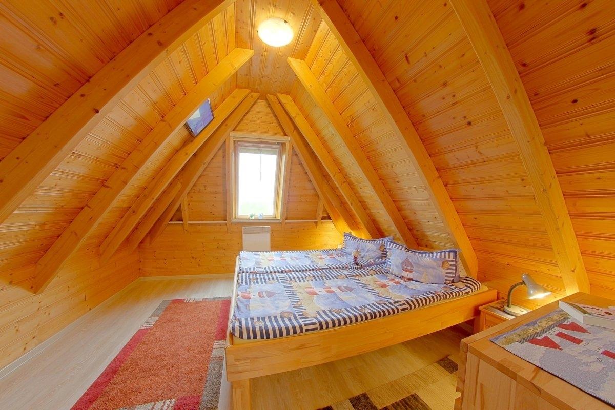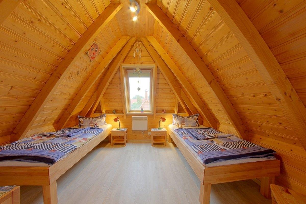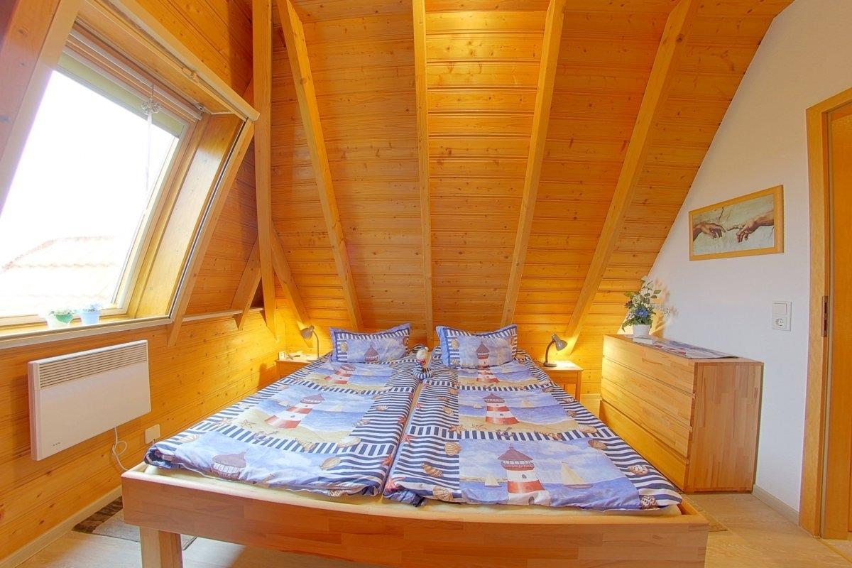 Im Obergeschoss sind zwei Schlafzimmer, eins mit Doppelbett und TV und eins mit 2 Einzelbetten, sowie eine Toilette mit Waschbecken. Beide Schlafzimmer mit Vinyl-Designbelag.