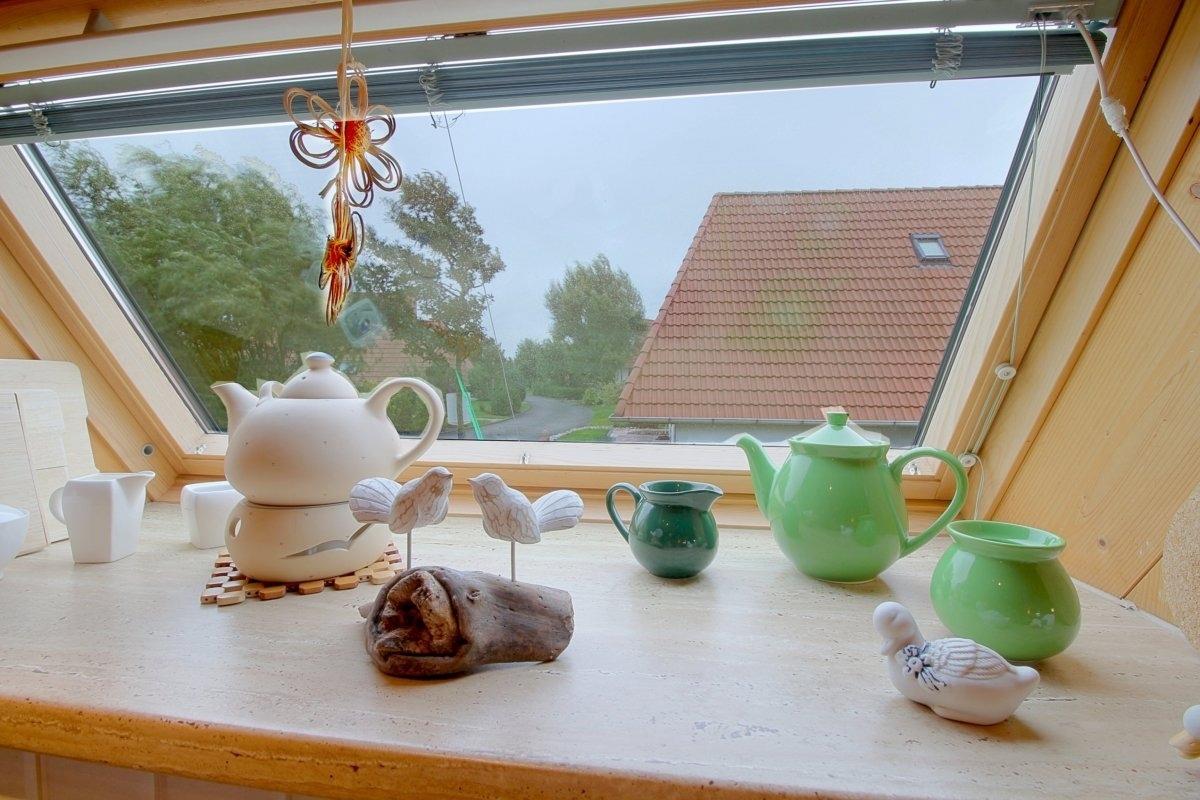 Untergeschoss mit offener Küche und Wohnzimmer, 1 Schlafzimmer für 2 Personen, Bad mit Waschbecken, Dusche und WC. Der Hingucker im Wohnbereich ist der gemütliche Kachelofen, der für wohlige Wärme sorgt.