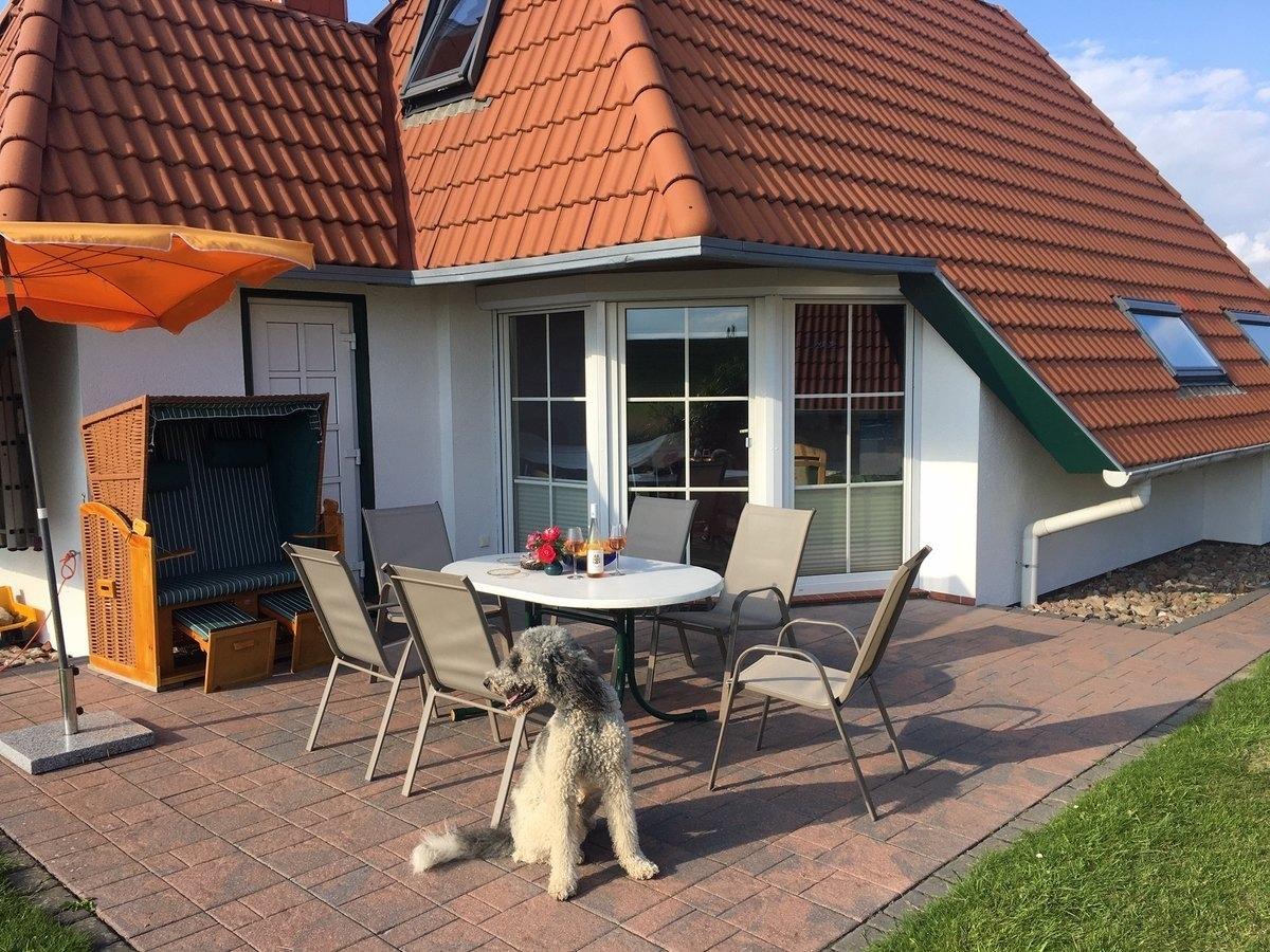 Auf der sonnigen Terrasse mit Gartenmöbeln und eigenem Strandkorb haben Sie einen sensationellen Blick direkt auf den Deich