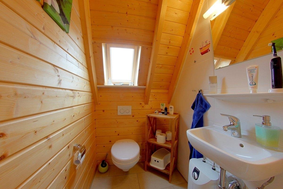 Das Schlafzimmer im Erdgeschoss ist mit einem hochwertigen Doppelbett (180 x 200 cm) aus massiver Buche, höhenverstellbaren 5-Reflex-Zonen-Lattenrosten und Matratzen ausgestattet. Die Komforthöhe von ca. 45cm sorgt nach einem erholsamen Schlaf für ein gesundes und ideales Aufstehen. Zwei Nachtschränke mit Leseleuchten und ein kleiner Flachbildfernseher runden das Gesamtbild ab. Ein Kleiderschrank bietet genügend Platz für Ihre persönlichen Dinge.